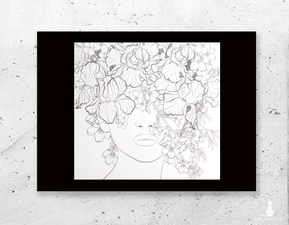 Nowy plakat w stylu boho. Biało czarny obrazek z dziewczyną na czarnym kartoniku A4. Dekoracja na ścianę do gabinetu, salonu, sypialni, jadalni, biura, przedpokoju, garderoby, kuchni, pokoju młodzieżowego, holu, kawiarni, restauracji itp. Plakat wystarczy dać do ramki 21x30 cm.. Poster będzie pasował do każdego stylu urządzania wnętrz.