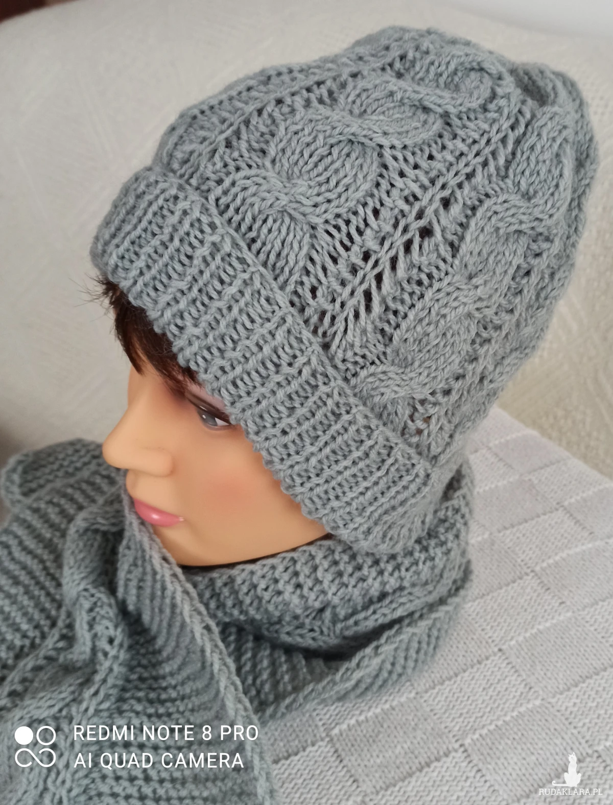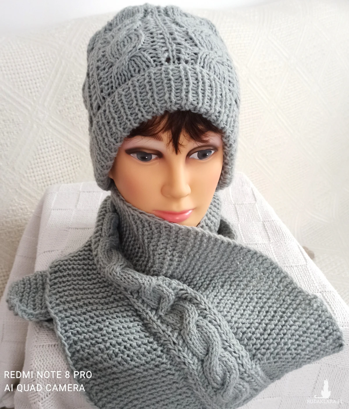Komplet czapka z szalikiem wykonany handmade z 100% akrylu w kolorze szarym. Kolor bardzo modny w tym sezonie. Wełna oddycha i doskonale pochłania wilgoć, dzięki czemu odzież z niej chłodzi, a także grzeje. Szalik jest uniwersalny w układaniu tzn. można go nosić jak klasyczny szalik lub ułożyć dekoracyjnie w formie komina i spiąć broszką, drewnianą lub z innego materiału spinką. Cała czapka wykonana wzorem w warkocze i wzorzyste paski pomiędzy nimi. Szalik natomiast wzorem francuskim z wrobionym pośrodku elementem wzoru z czapki. Wymiary czapki z wywiniętym otokiem 23,5 cm wysokość, obwód uniwersalny do 60 cm, wymiary szalika długość 84 cm bez rozciągania, szerokość 25 cm. Szalik można nosić po spodem jak i na wierzchu okrycia, dzięki zastosowanemu splotowi ładnie układa się przy szyi. Wełna średniej grubości.