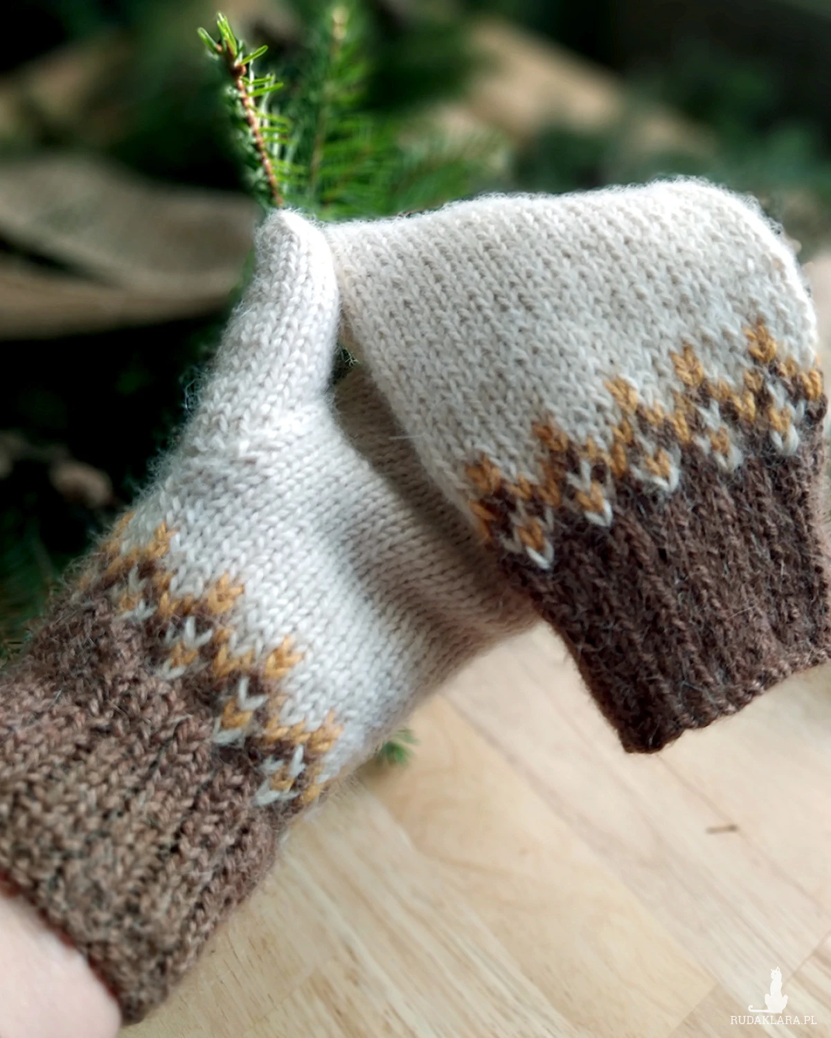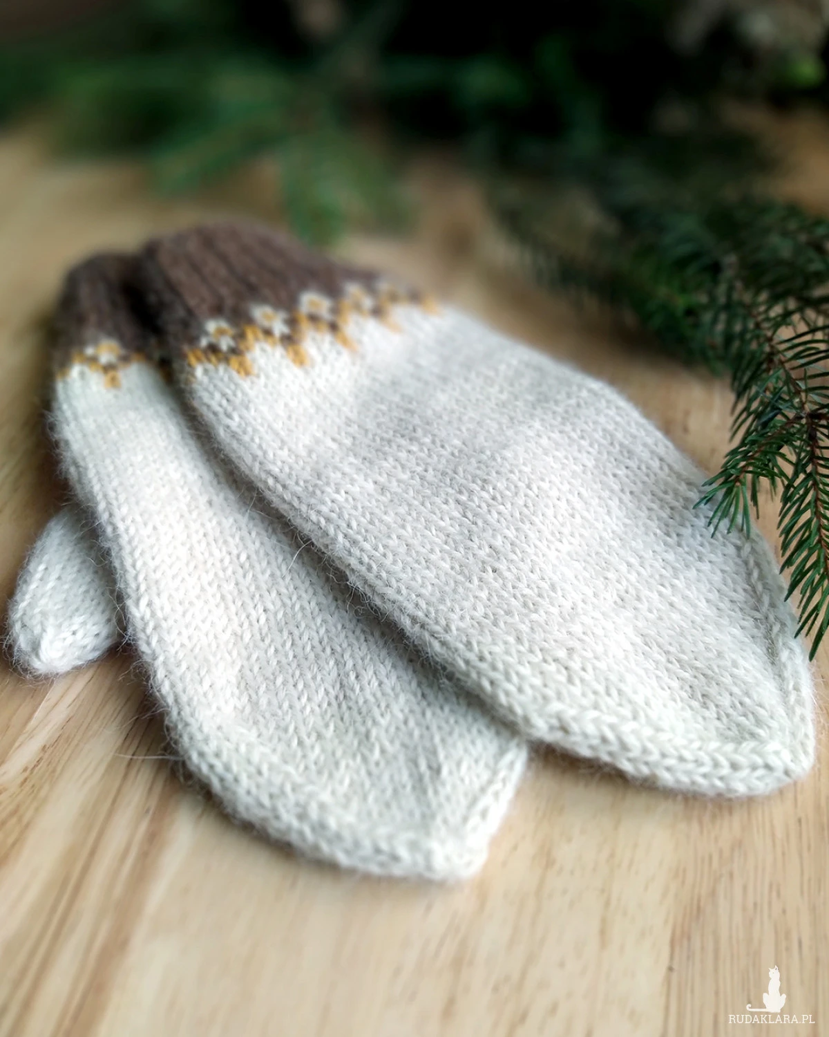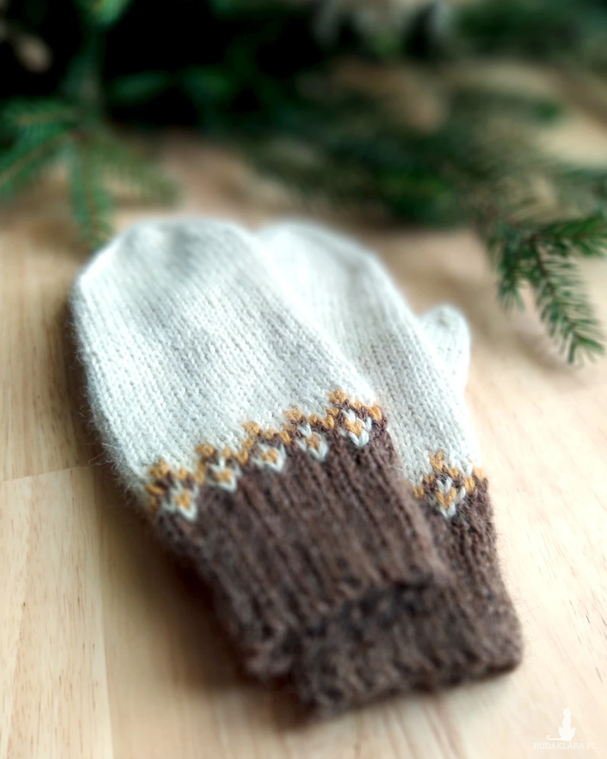 Rękawiczki z jednym palcem, ręcznie robione na drutach, z delikatnym żakardowym wzorem przy mankiecie, bezszwowe, jednowarstwowe.