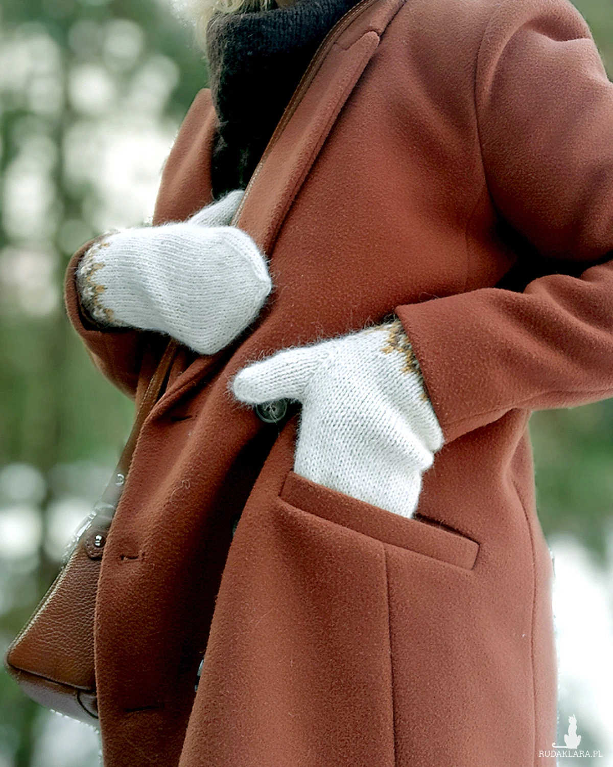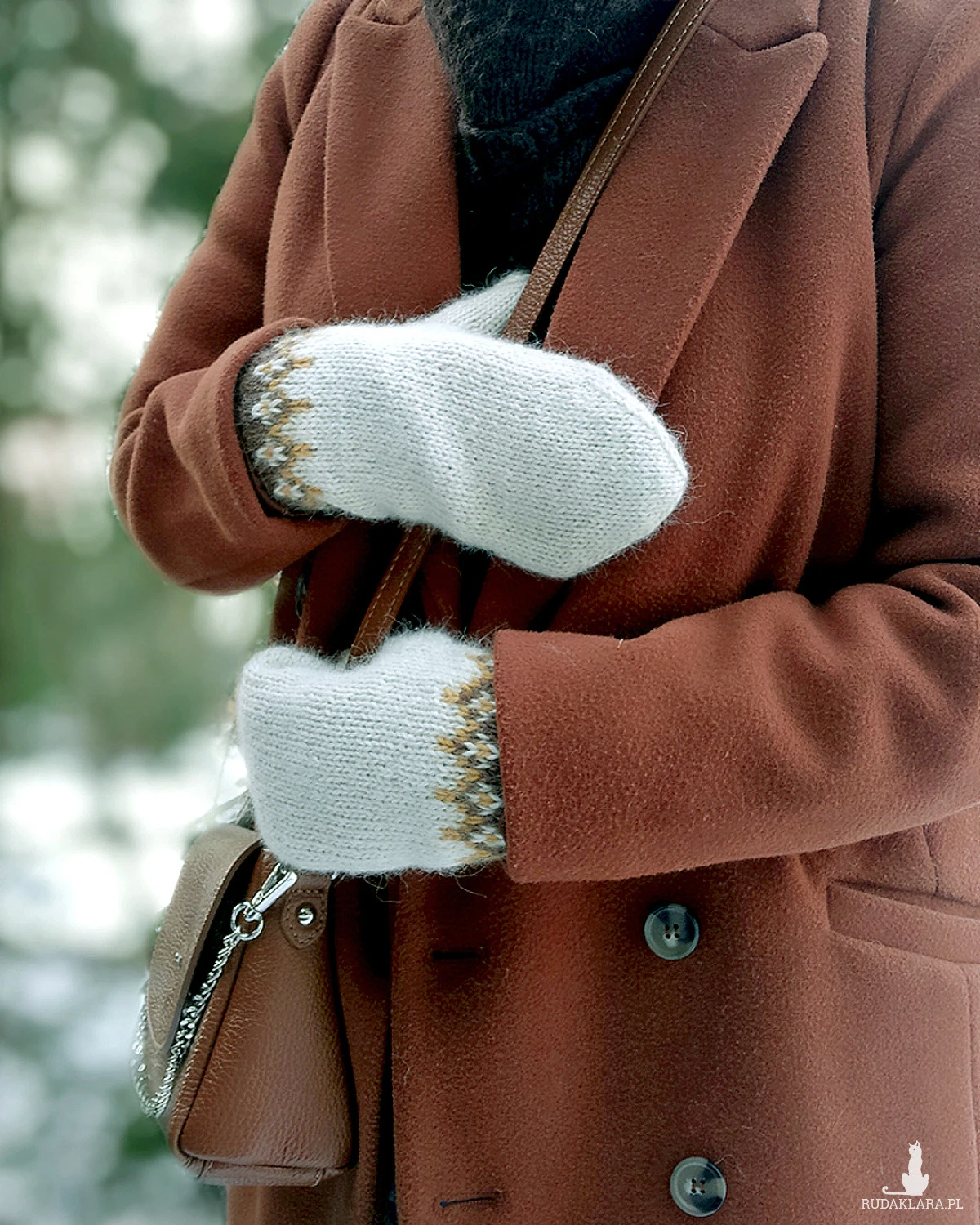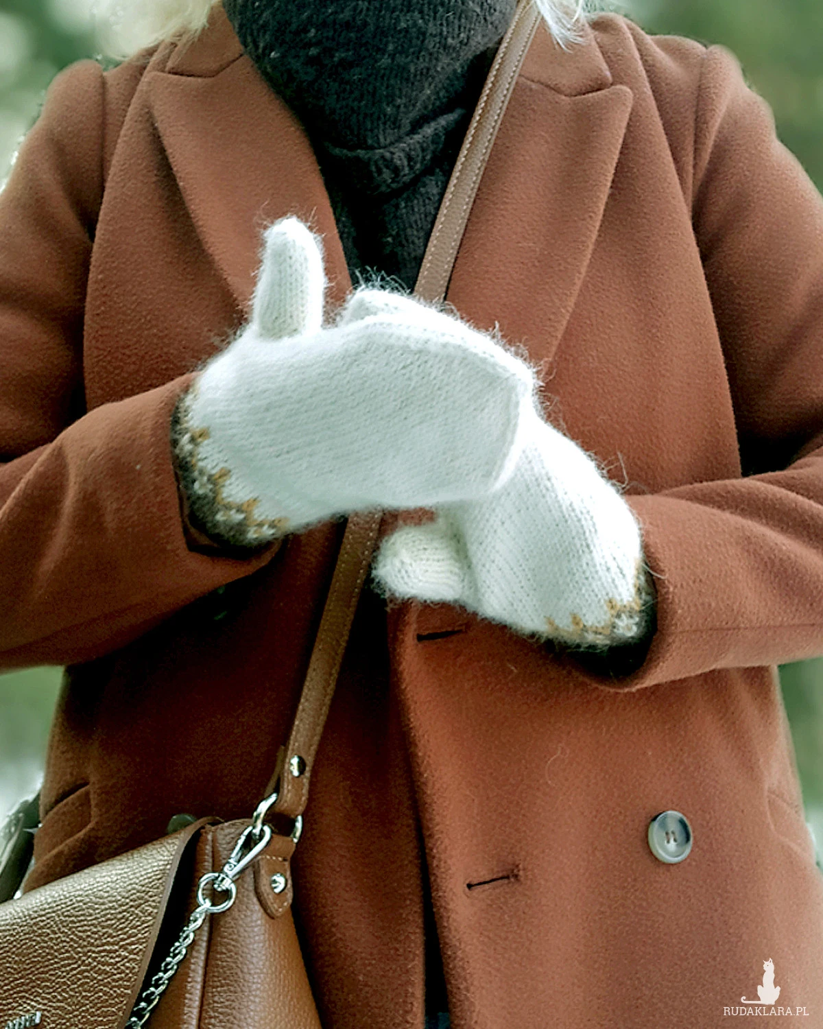 Rękawiczki z jednym palcem, ręcznie robione na drutach, z delikatnym żakardowym wzorem przy mankiecie, bezszwowe, jednowarstwowe.