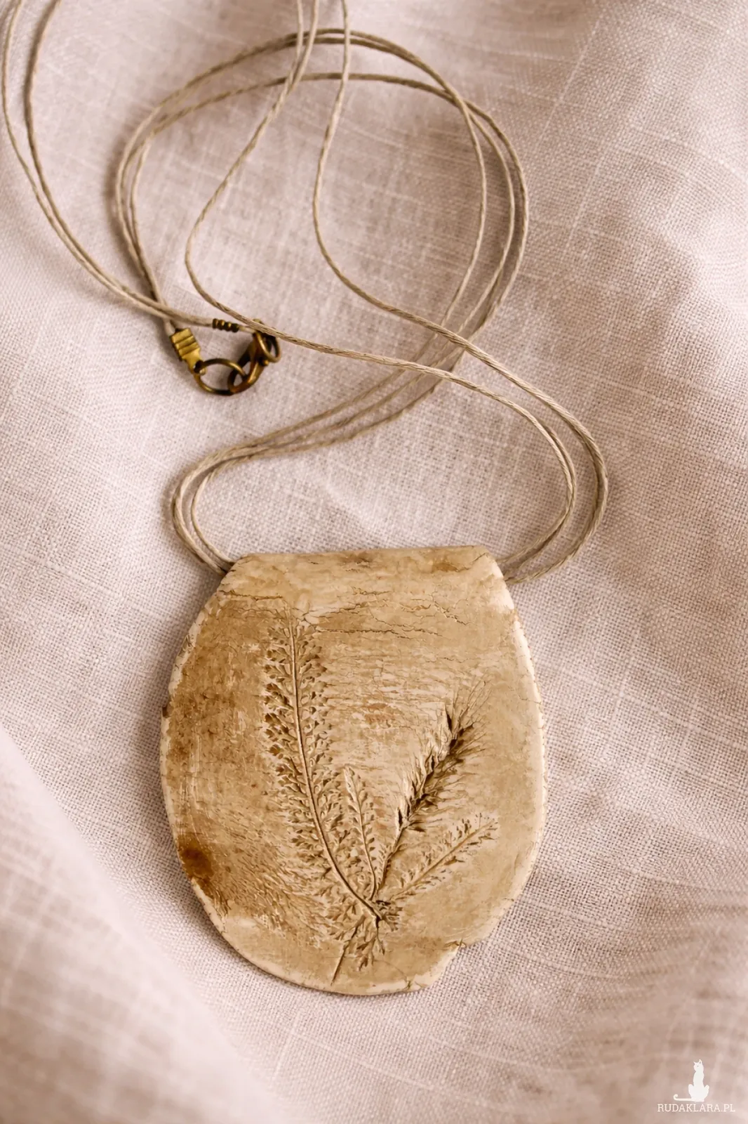 Zabezpieczony lakierem .Wisior wisi na trzech sznurkach lnianych zakończonych karabińczykiem w kolorze starego złota. Wymiary wisiora: 7,5cm/6cm.