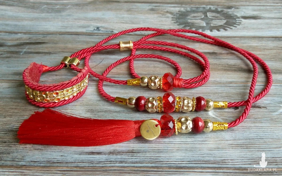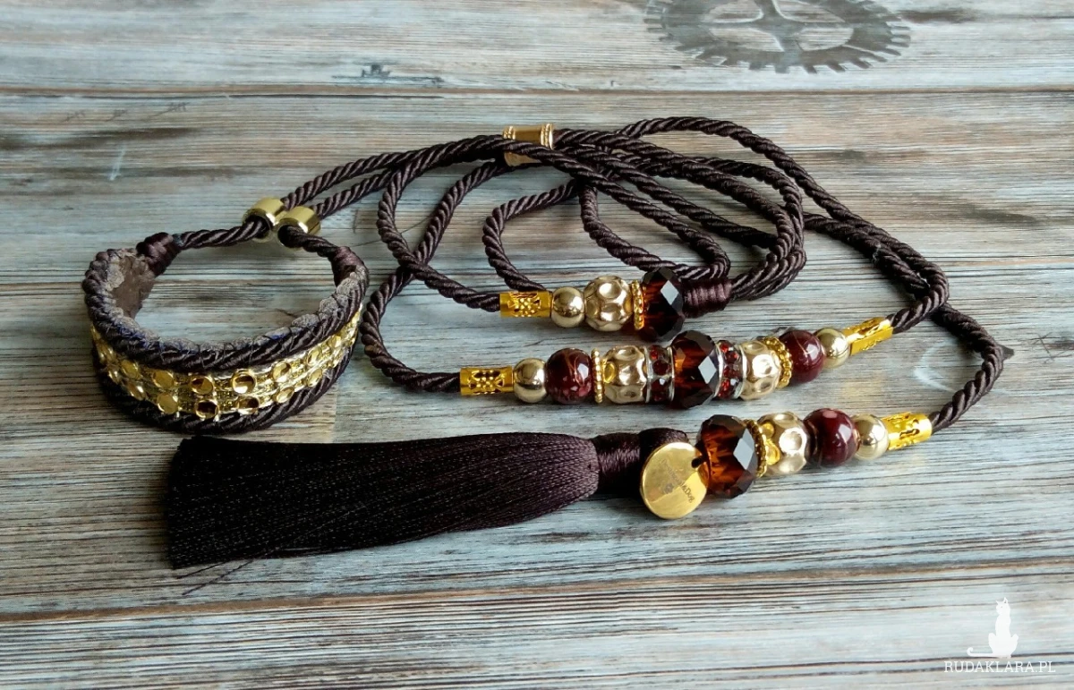 Smycz ringowa przeznaczona dla psów małych ras, wykonana ręcznie z cieniutkiego ozdobnego sznurka grubości 0,3 cm, zdobiona pięknymi koralikami i chwostem.