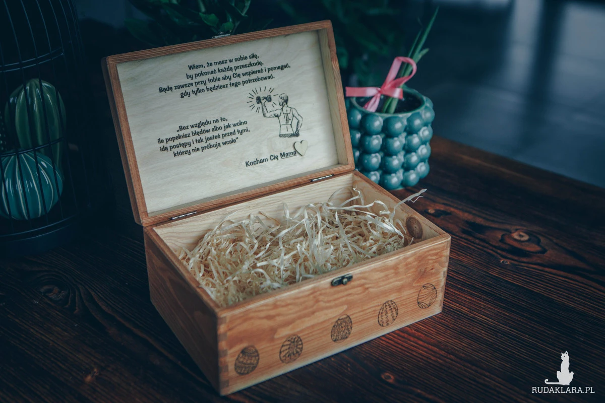 W celu personalizacji produktu, prosimy o przesłanie wszelkich szczegółów dotyczących życzeń lub dedykacji, które mają się znaleźć w środku skrzynki.