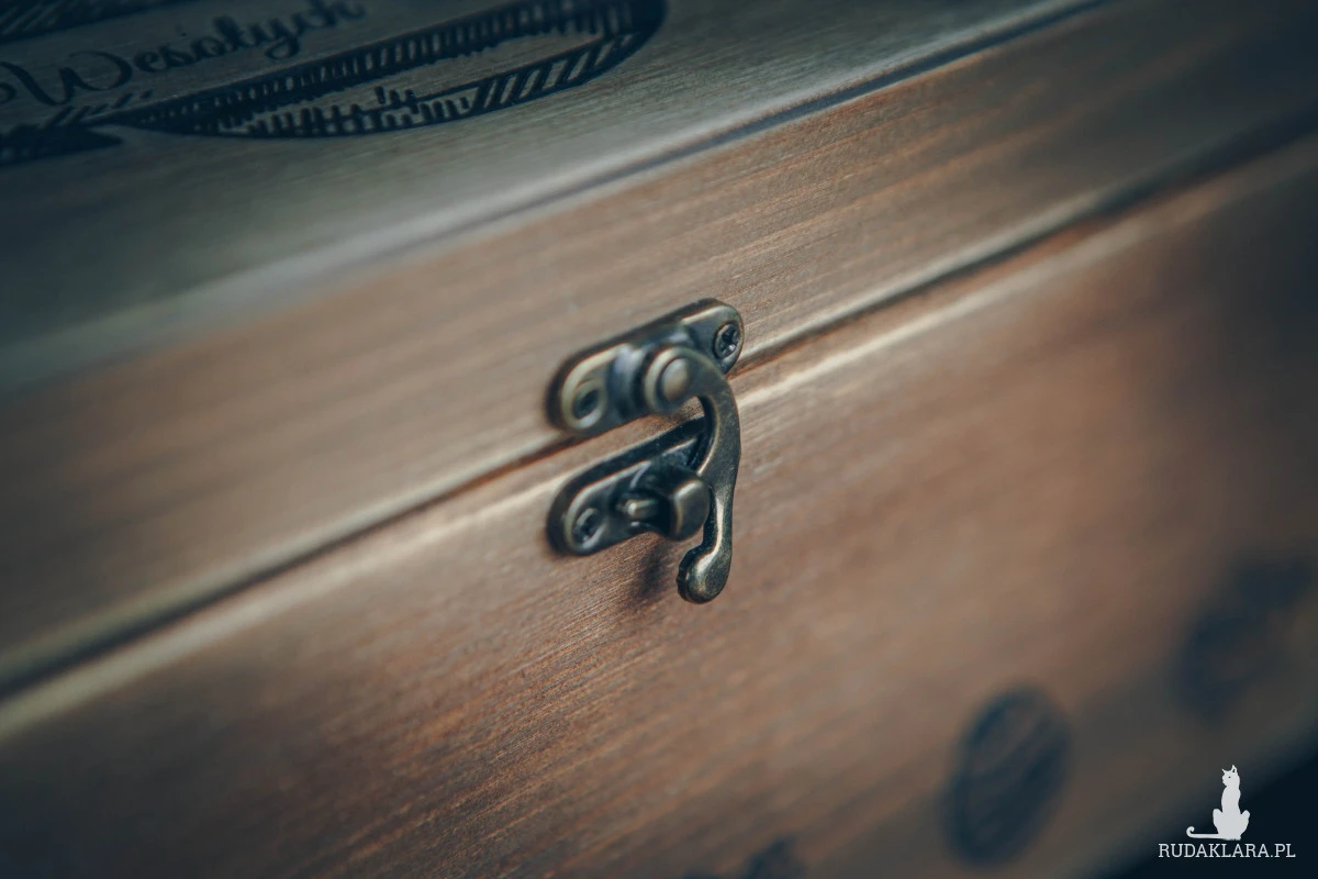 Kluczowym elementem jest wykorzystanie bejcy wodnej, która nadaje skrzynce niepowtarzalny urok i trwałość, podkreślając naturalne piękno drewna. Aby zabezpieczyć jej wyjątkowy wygląd, skrzynka została pokryta olejem do drewna, gwarantując długotrwałą ochronę i zachowanie jej nienagannego stanu.