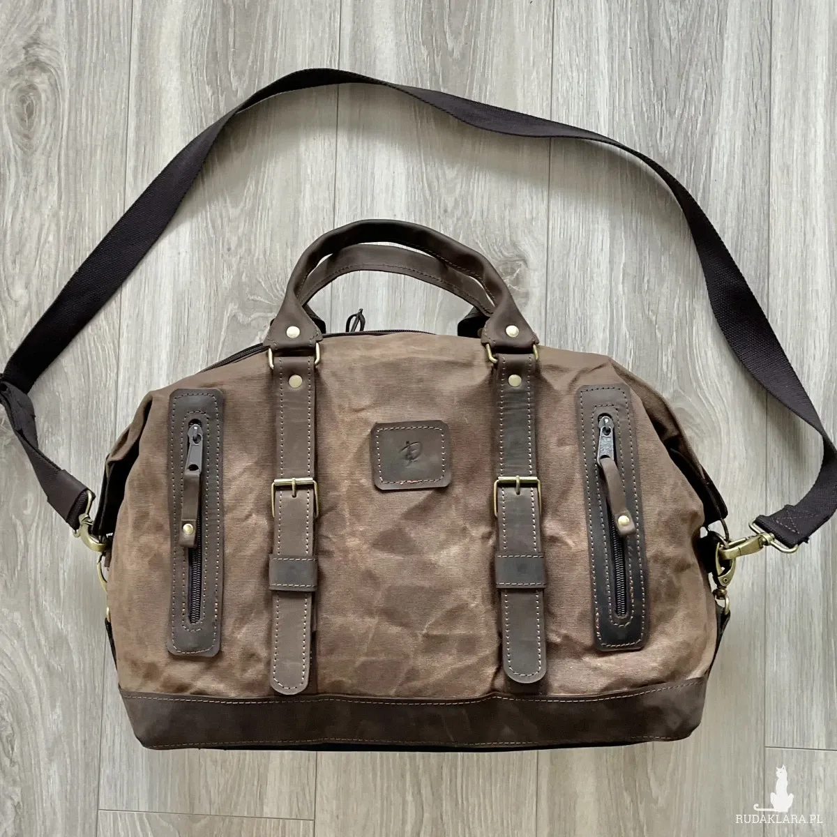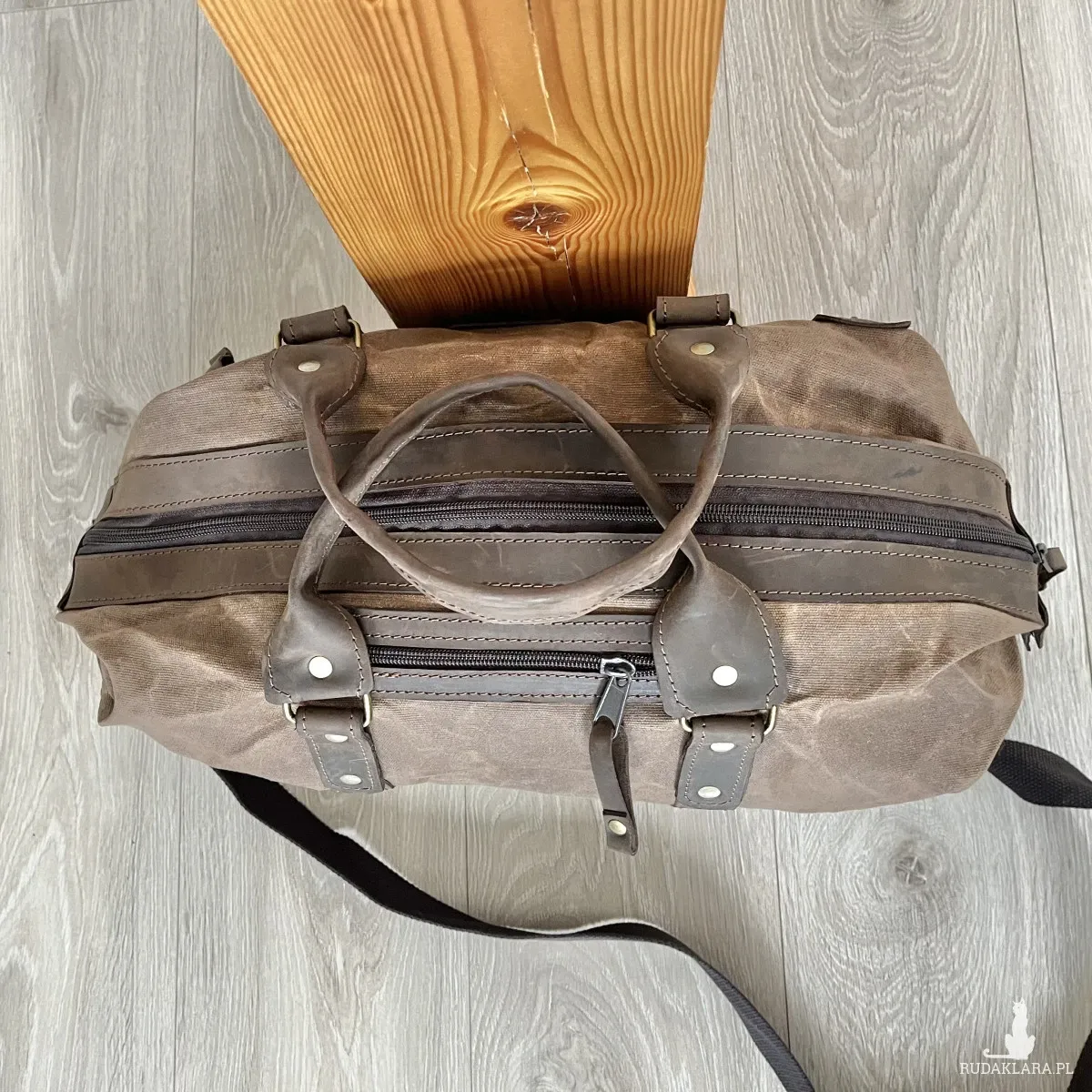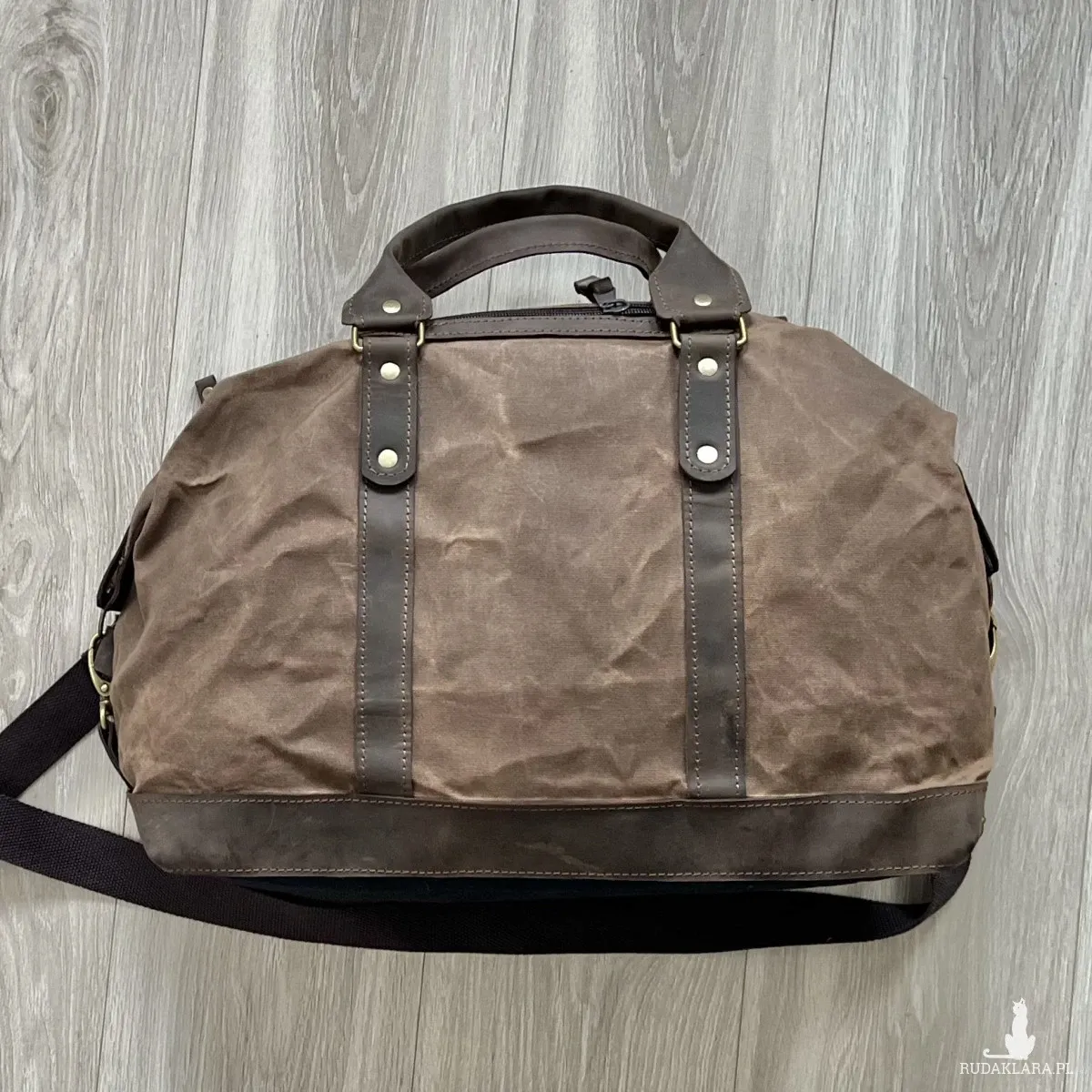 Bawełniana torba unisex z brązowej skóry i ręcznie woskowanej brązowej grubej bawełny jest idealna ażeby zmieścić nasze bagaże.