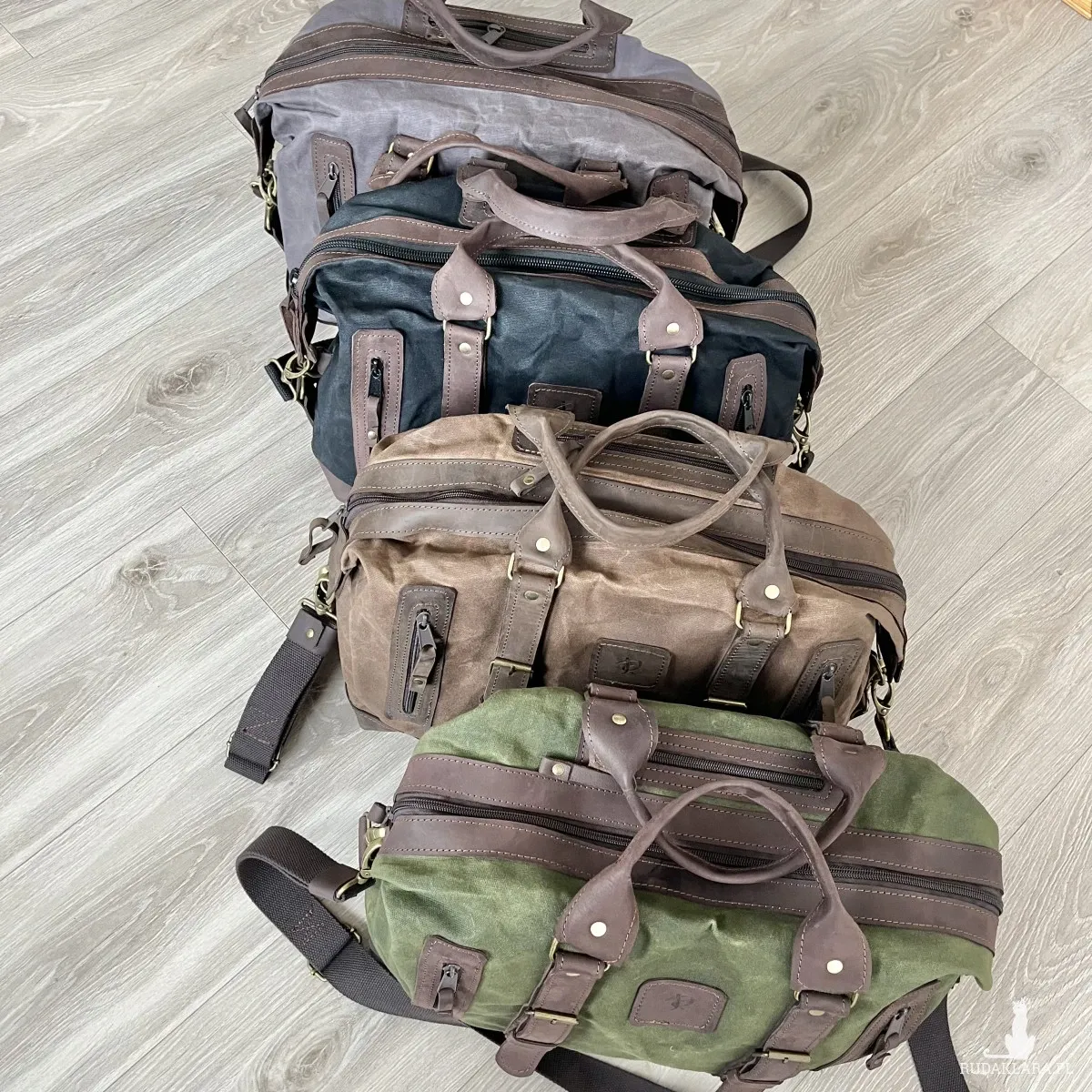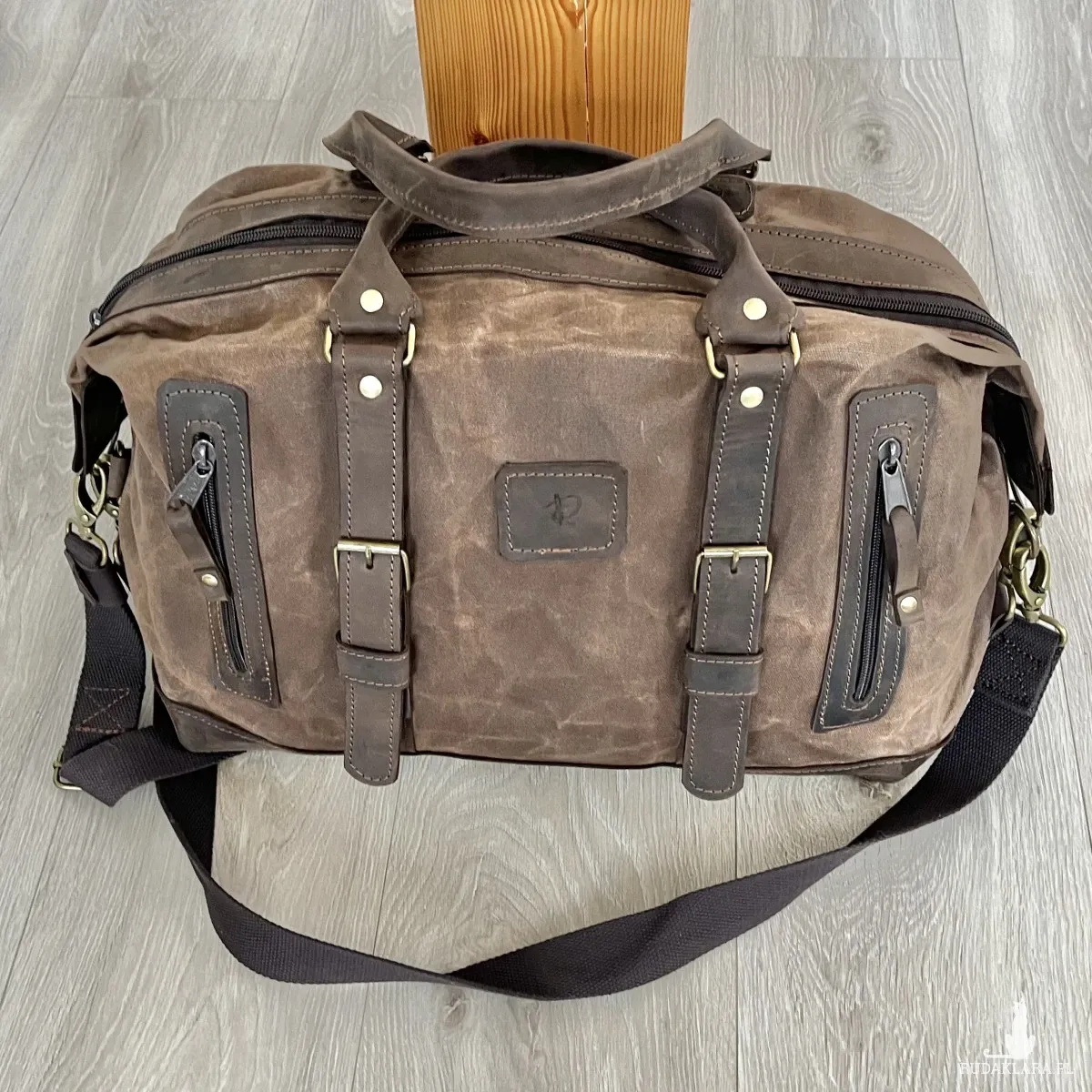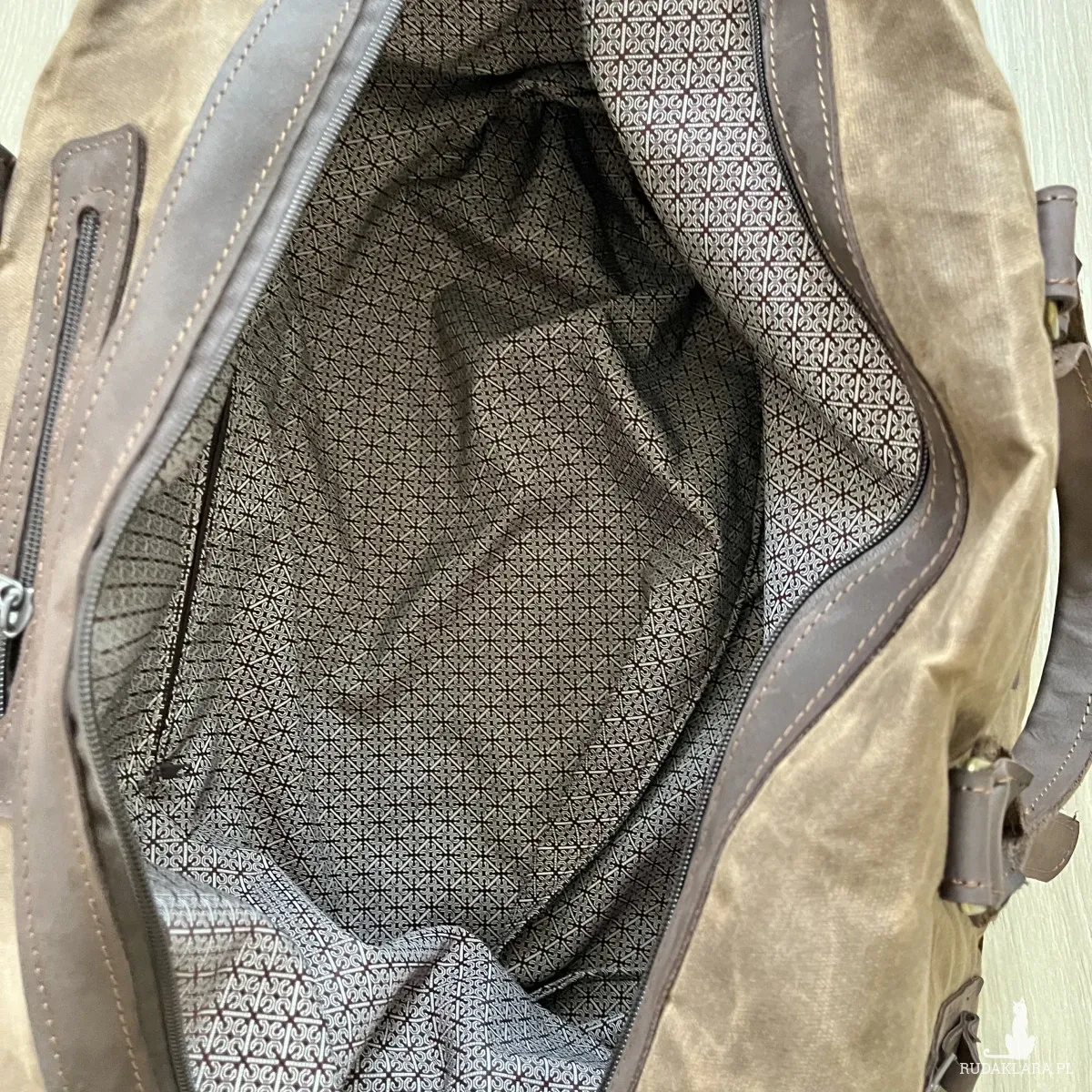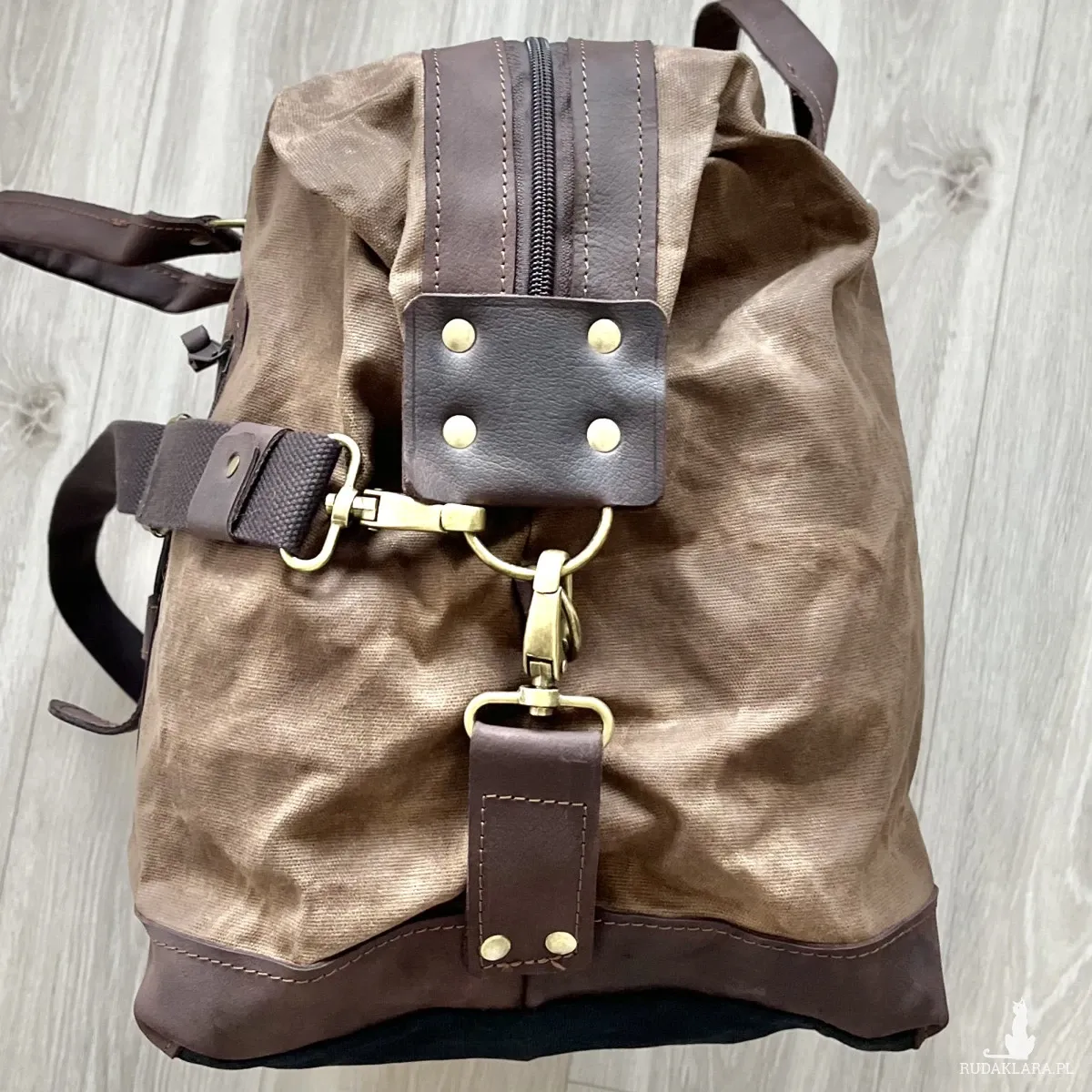 Bawełniana torba unisex z brązowej skóry i ręcznie woskowanej brązowej grubej bawełny jest idealna ażeby zmieścić nasze bagaże.
