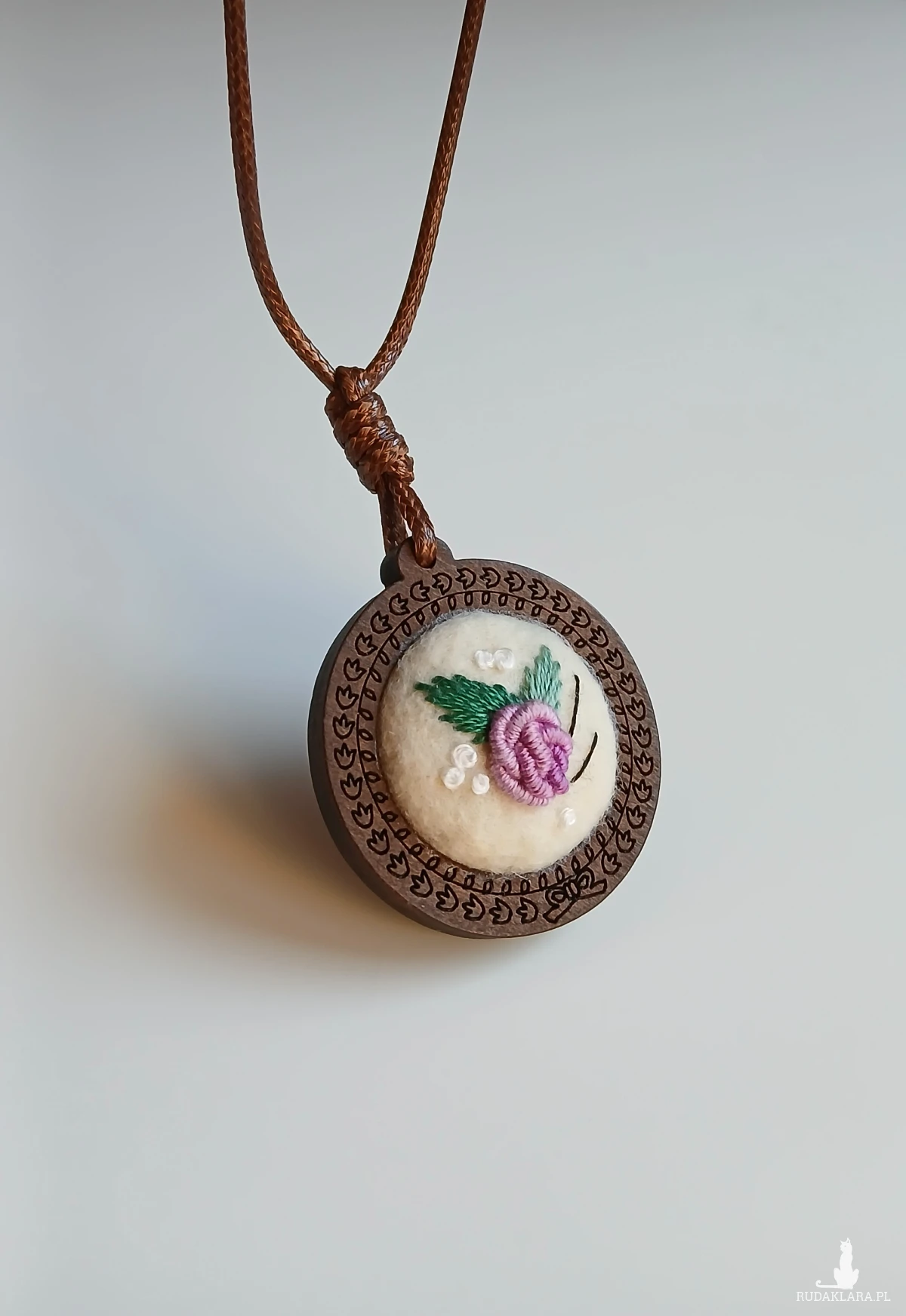Baza wisiorka to lekkie drewienko o średnicy 40 mm, zawieszona na rzemyku z regulowaną długością. Waga całości to zaledwie 6 g.
