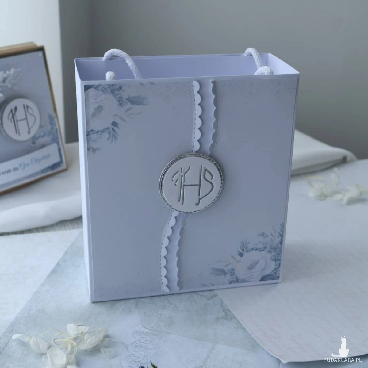 Możesz również zamówić torebkę prezentową tworzoną na wymiar, w tym samym stylu co kartka (40 zł). Dzięki temu otrzymujesz spójny zestaw, który wygodnie zabierzesz i wręczysz bez dodatkowego pakowania.