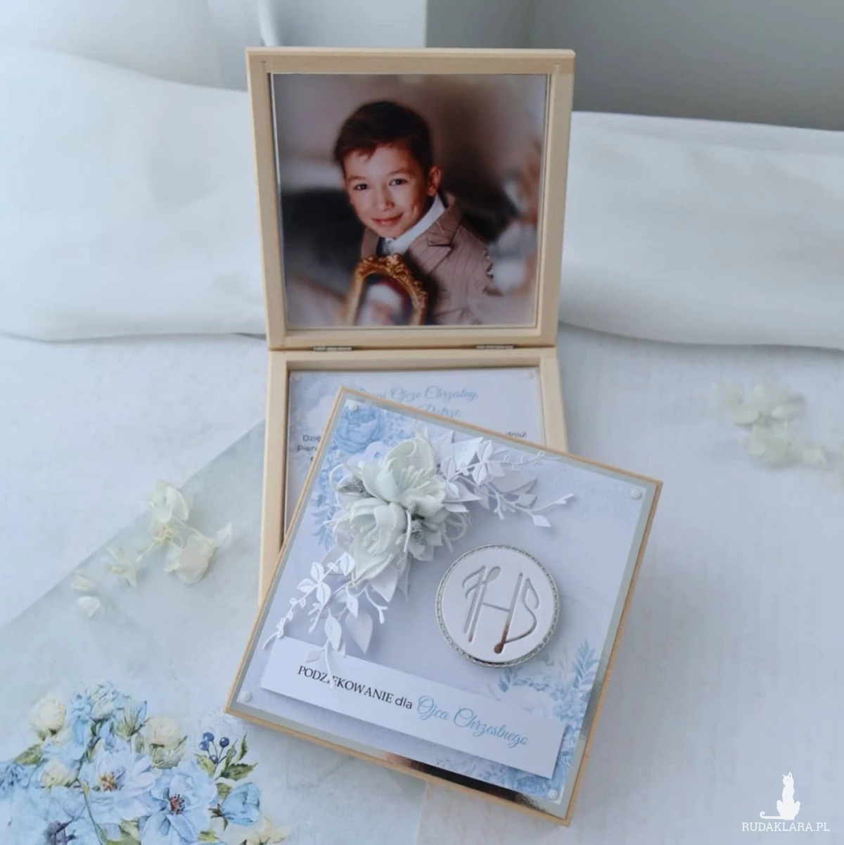 Drewniane pudełko idealnie sprawdzi się jako Podziękowanie dla Rodziców Chrzestnych z okazji Pierwszej Komunii Świętej dla chłopca.