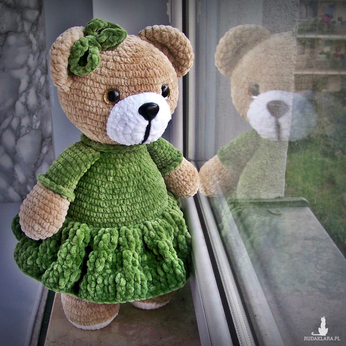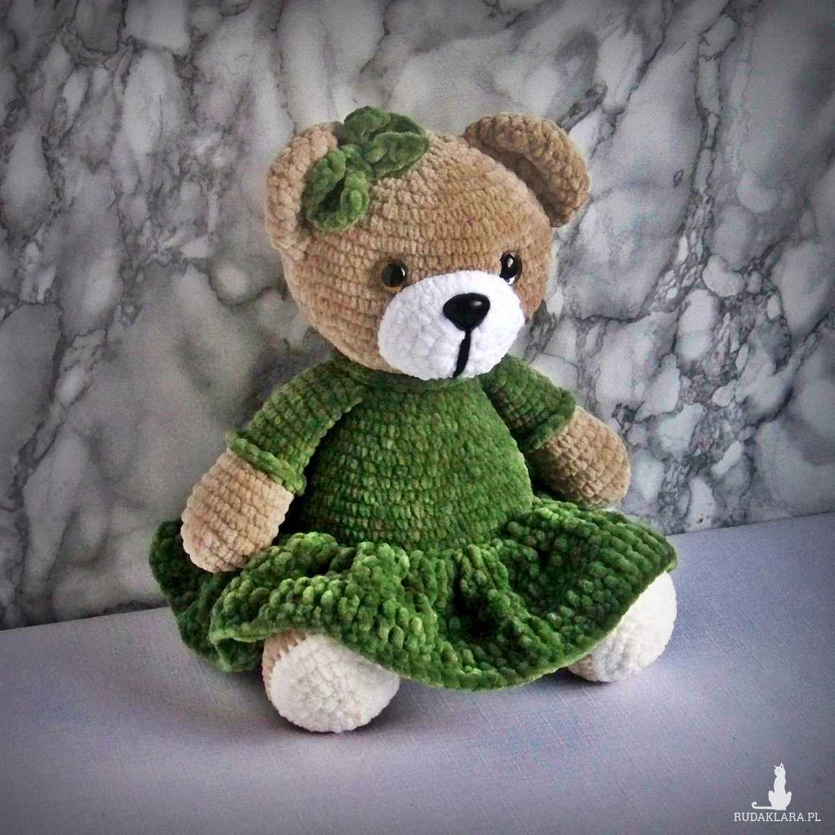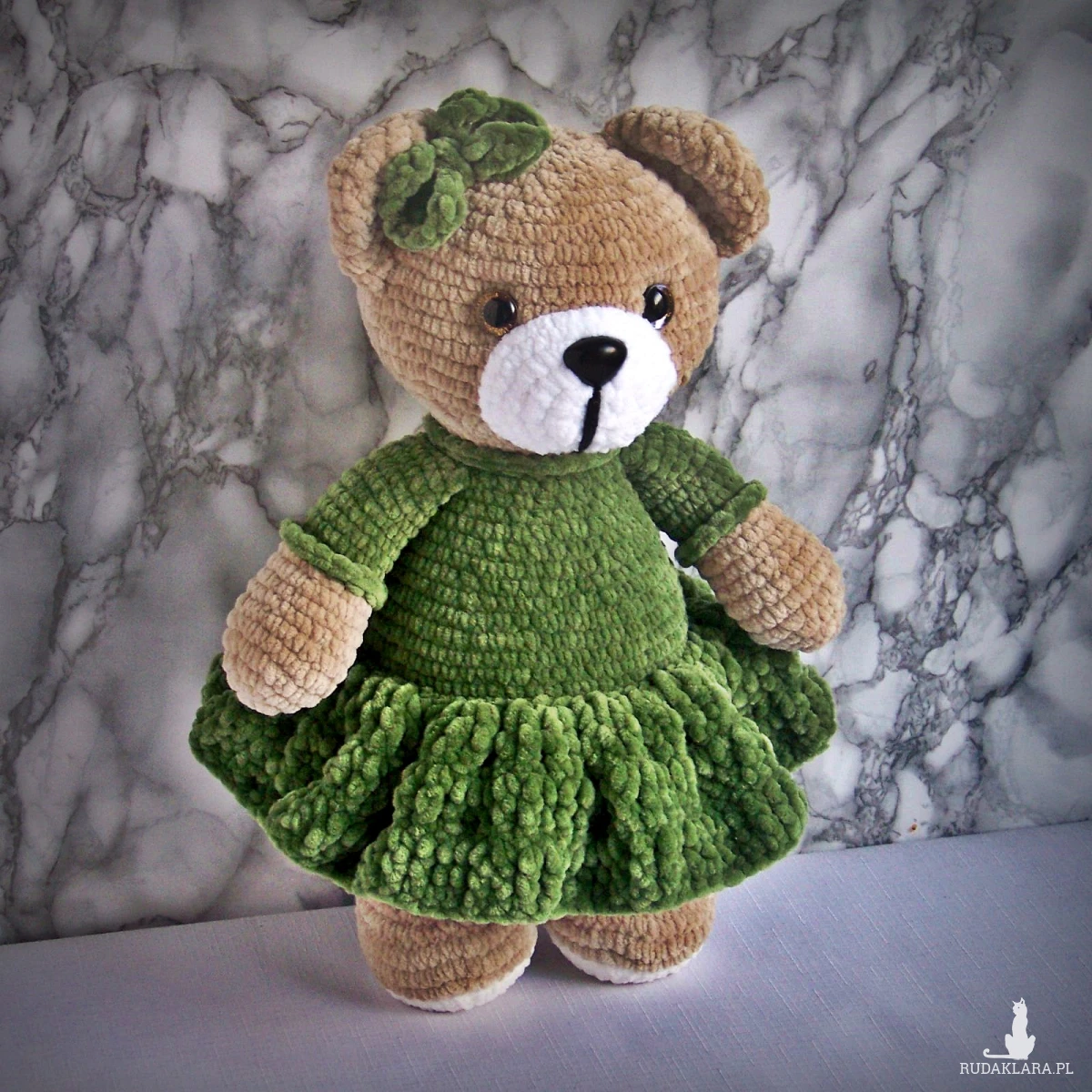 Szydełkowy miś 32cm w oliwkowej sukience (na zamówienie)