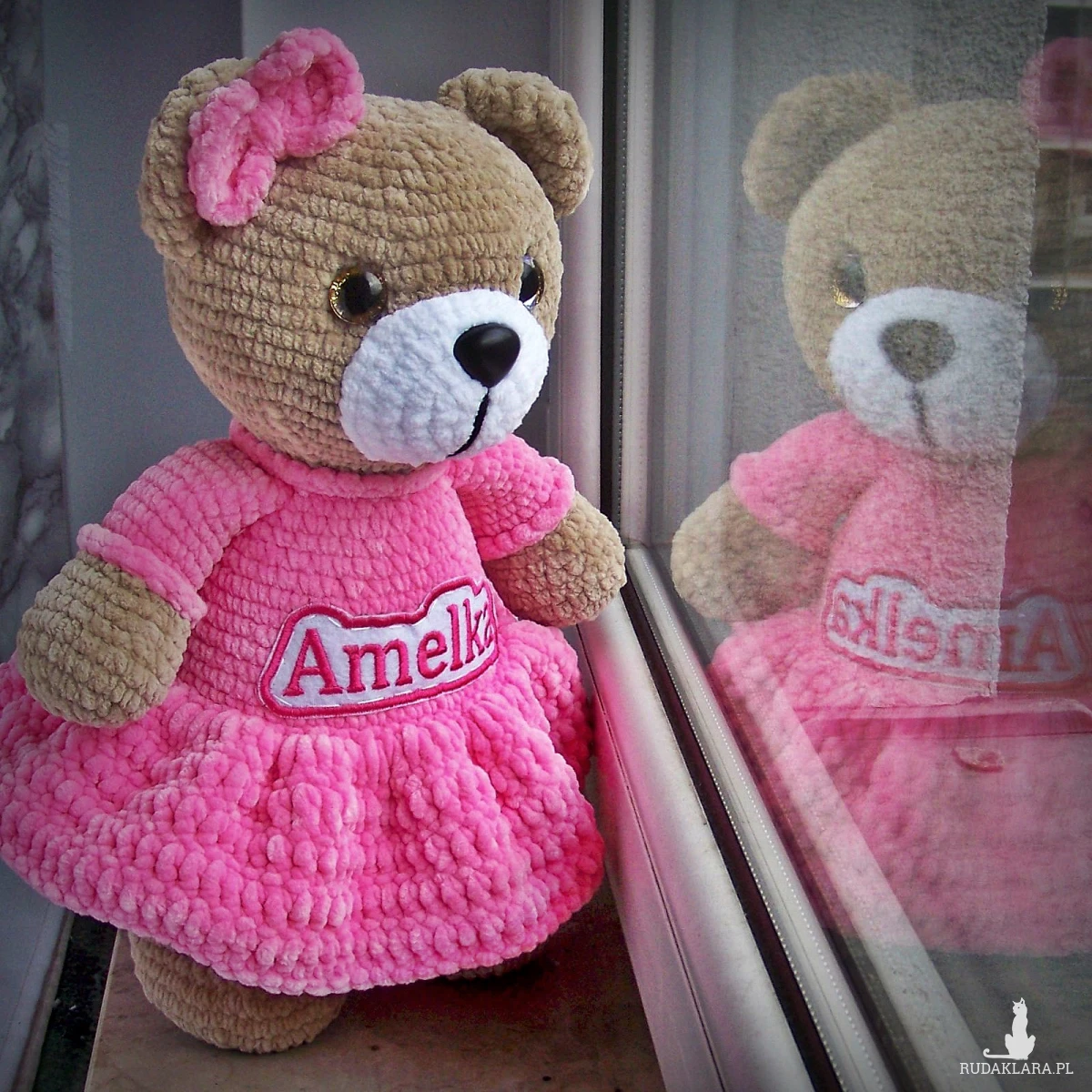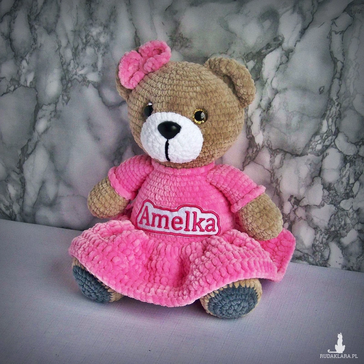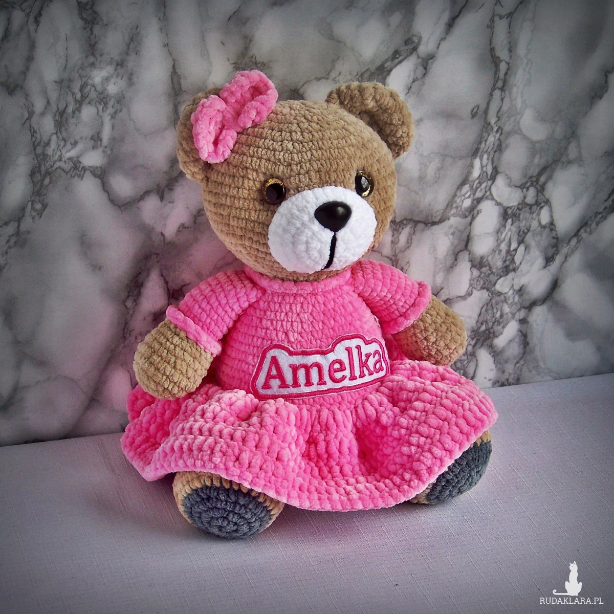 Szydełkowy miś Amelka 32cm w ciemnoróżowej sukience (na zamówienie)