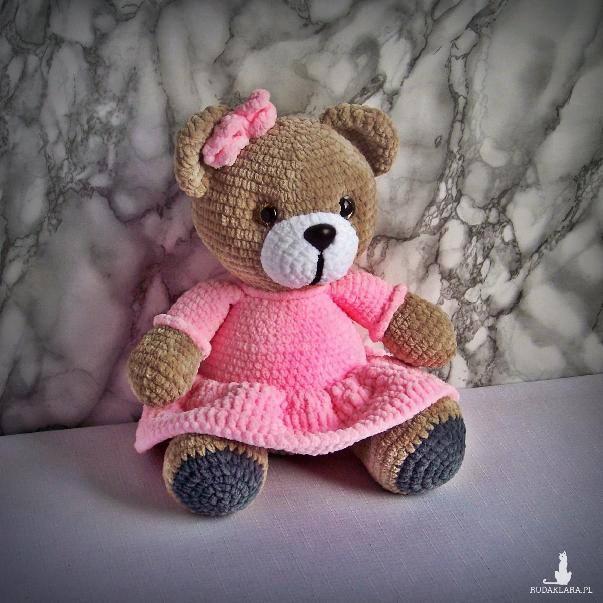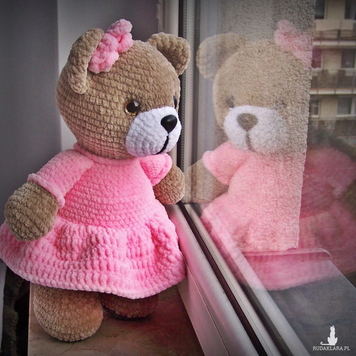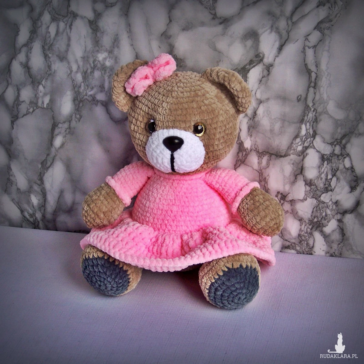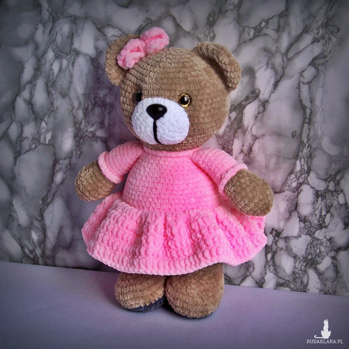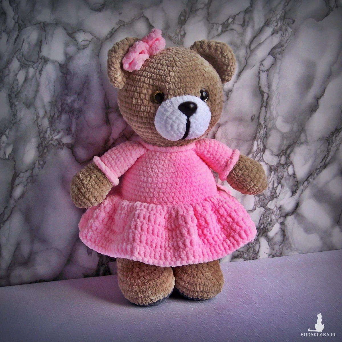 Szydełkowy miś 32cm w różowej sukience (na zamówienie)