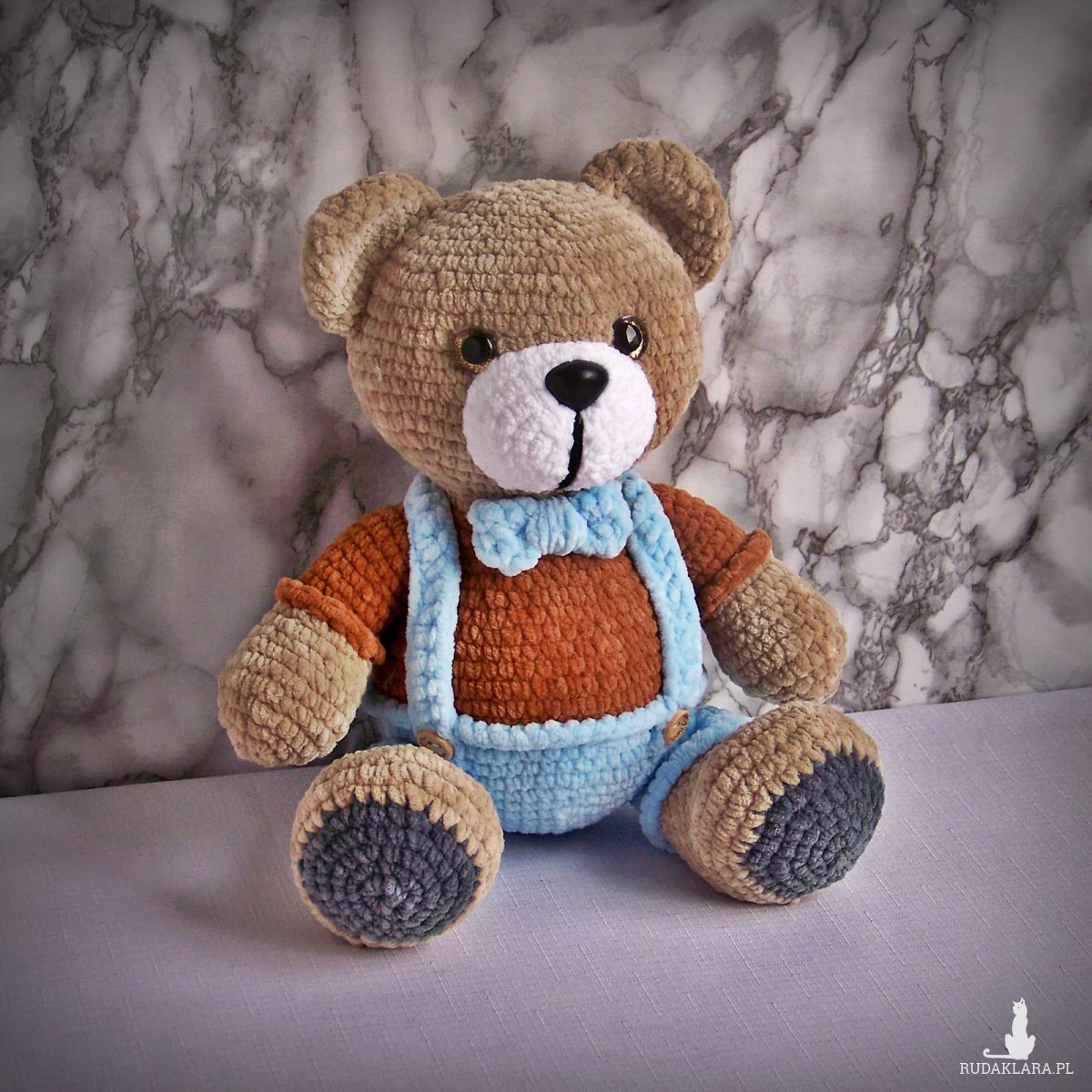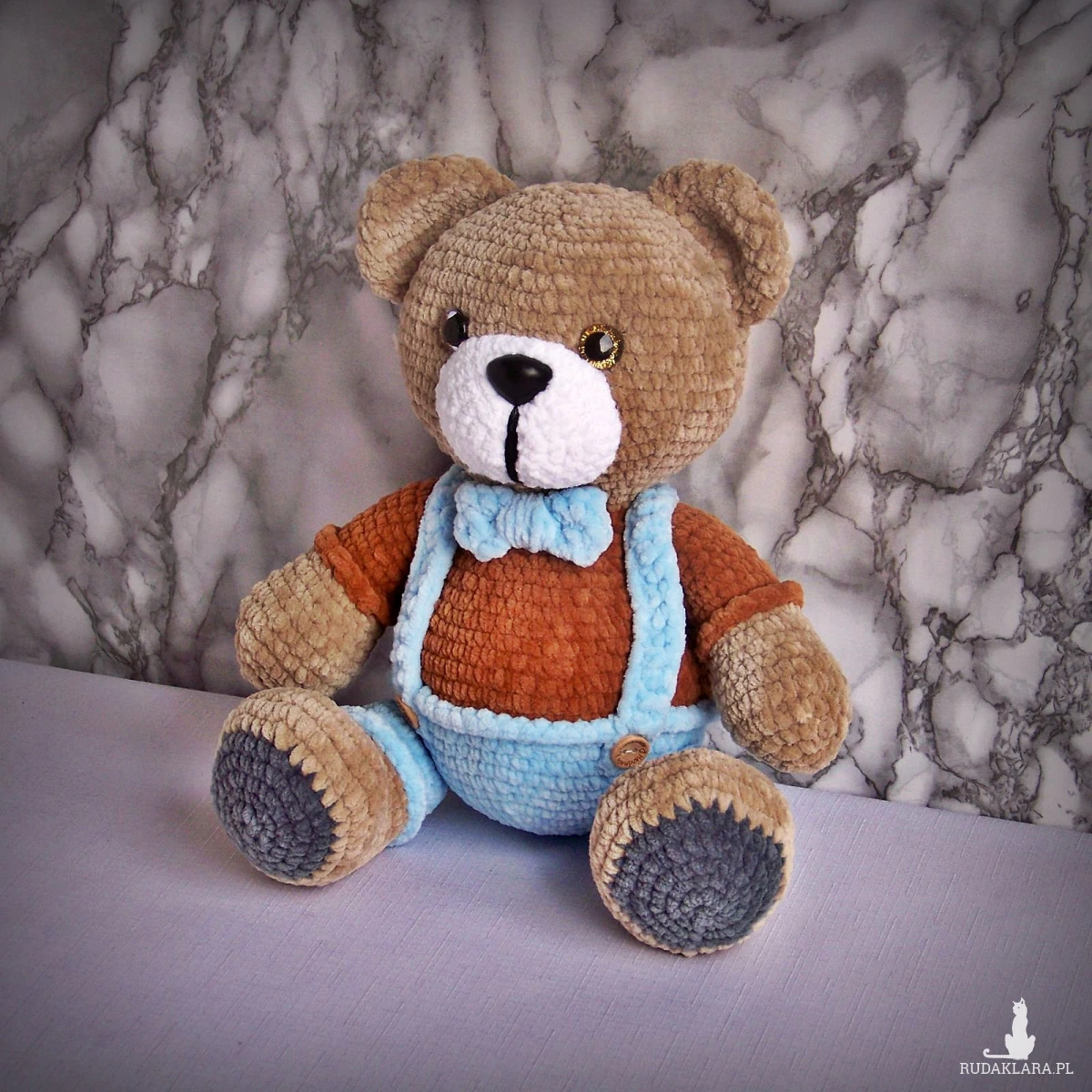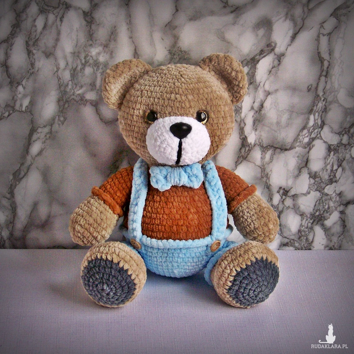 Szydełkowy miś 32cm w niebieskich spodenkach (na zamówienie)
