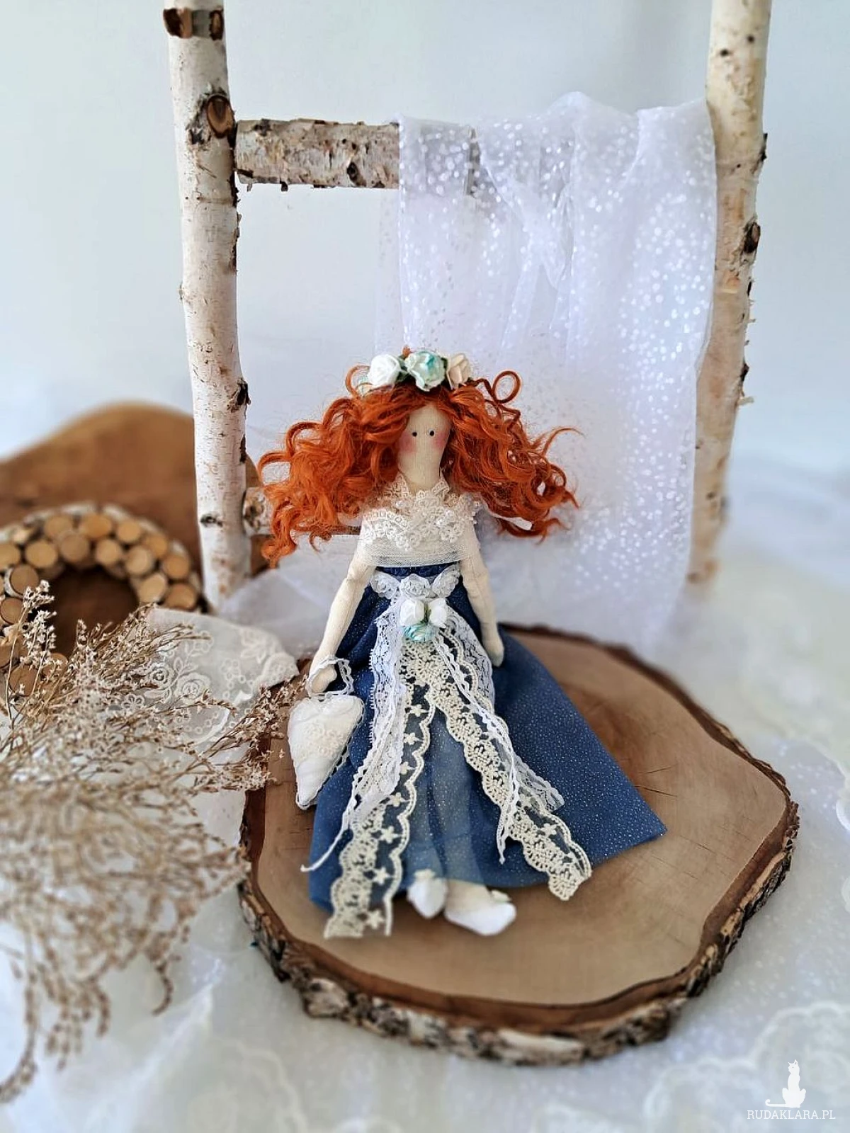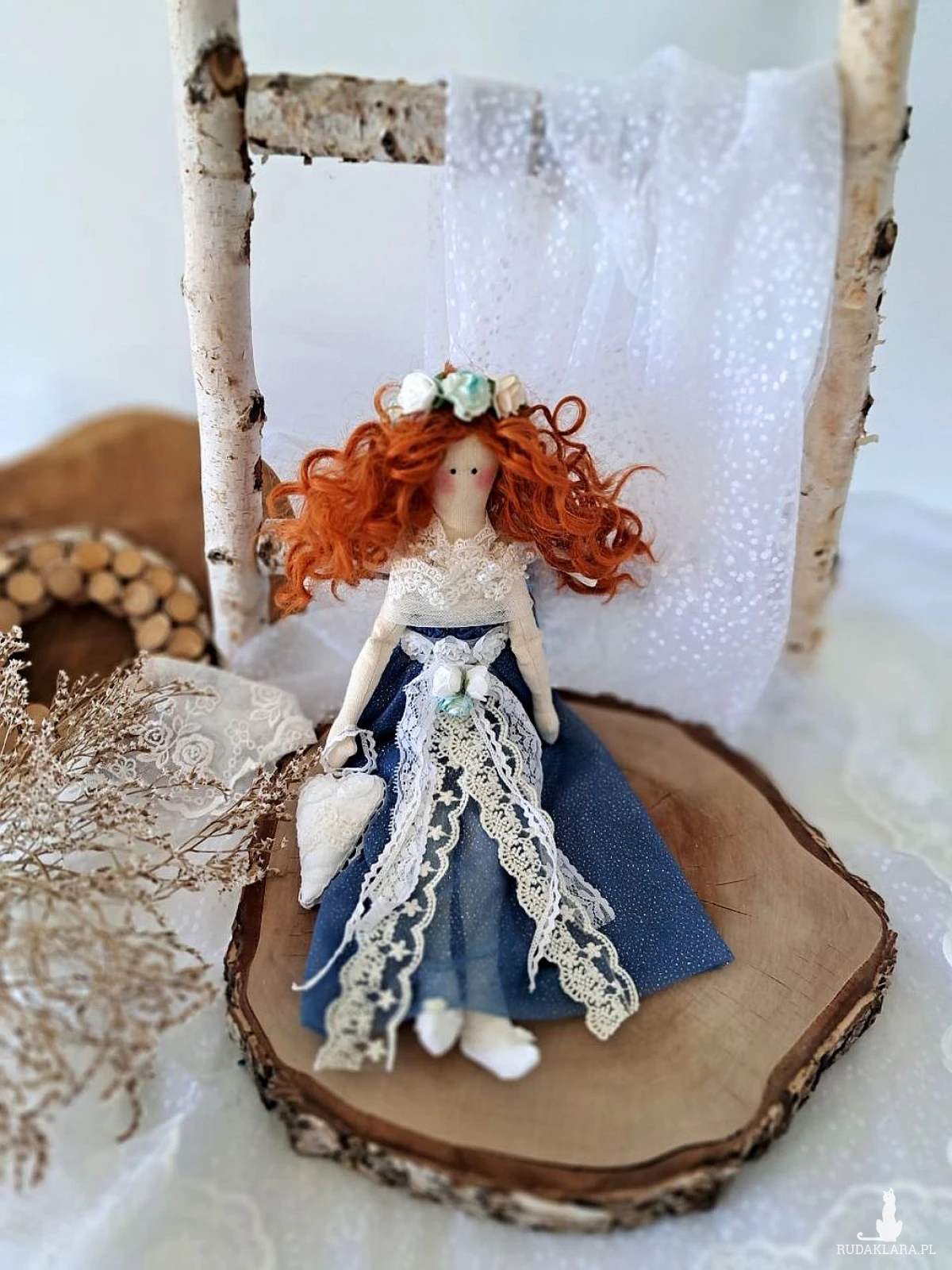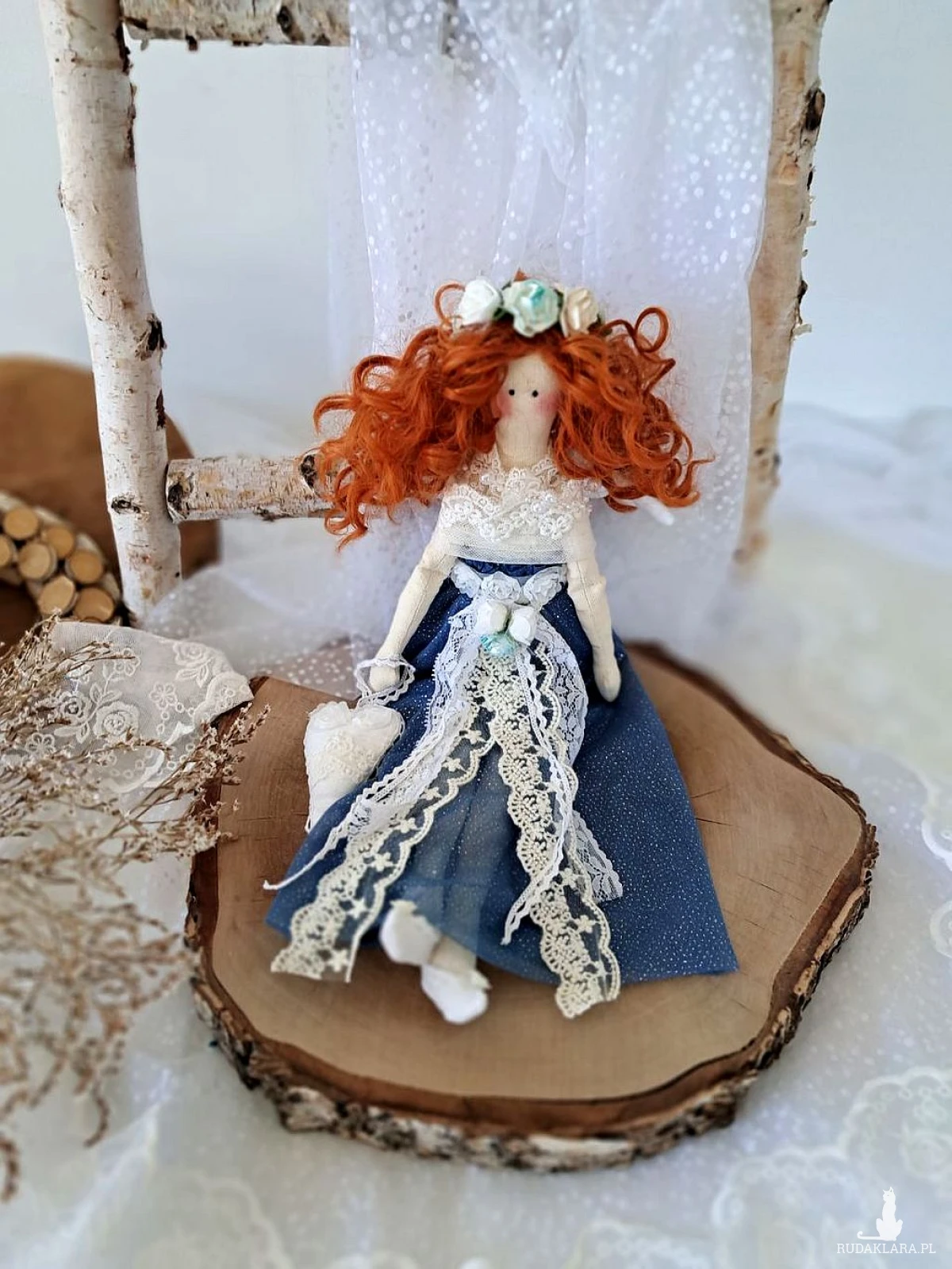 Witam serdecznie;) Mam do sprzedaży własnoręcznie stworzoną anielicę (nierozbieralną). Ciało wykonane z bawełny, wypełniony antyalergiczną kulką silikonową. Góra sukienki ozdobiona białą koronką,pozostały fragment niebieskim tiulem ze srebrnym brokatem. W pasie kwiatuszki i liczne wstążki. W ręku trzyma dekoracyjne serduszko,na stopach ma białe lniane buciki zakończone perełkowymi drobnymi różyczkami. Na rudych,kręconych włosach ma założony śliczny wianuszek. Anioł może stanowić prezent z różnych okazji urodzin, imienin, Komunii św., chrztu, Walentynek, świąt, ale bez względu na okazję może być wyrażeniem miłości lub wdzięczności:)