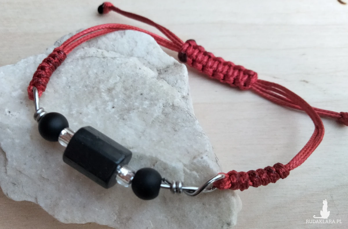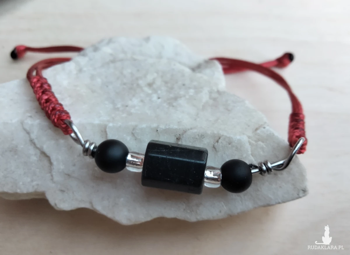 Bransoletka ochronna z czarnym turmalinem i onyksem na czerwonym sznurku.