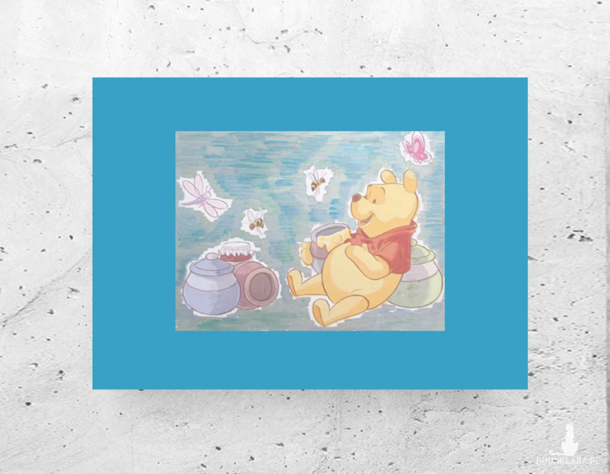 Kolorowy obrazek z Kubusiem Puchatkiem, lekko srebrzyste tło. Grafika na kartoniku w rozmiarze A4. Bajkowa dekoracja na ścianę do dziecięcego pokoju, kuchni, jadalni, żłobka, przedszkola, bawialni, klubu malucha itp. Plakat wystarczy dać do ramki w rozmiarze 21 x 30 cm.. Grafika będzie pasowała zarówno do wnętrz urządzonych w stylu nowoczesnym skandynawskim, hygge, loftowym, boho, jak i tradycyjnym, vintage, mieszanym.