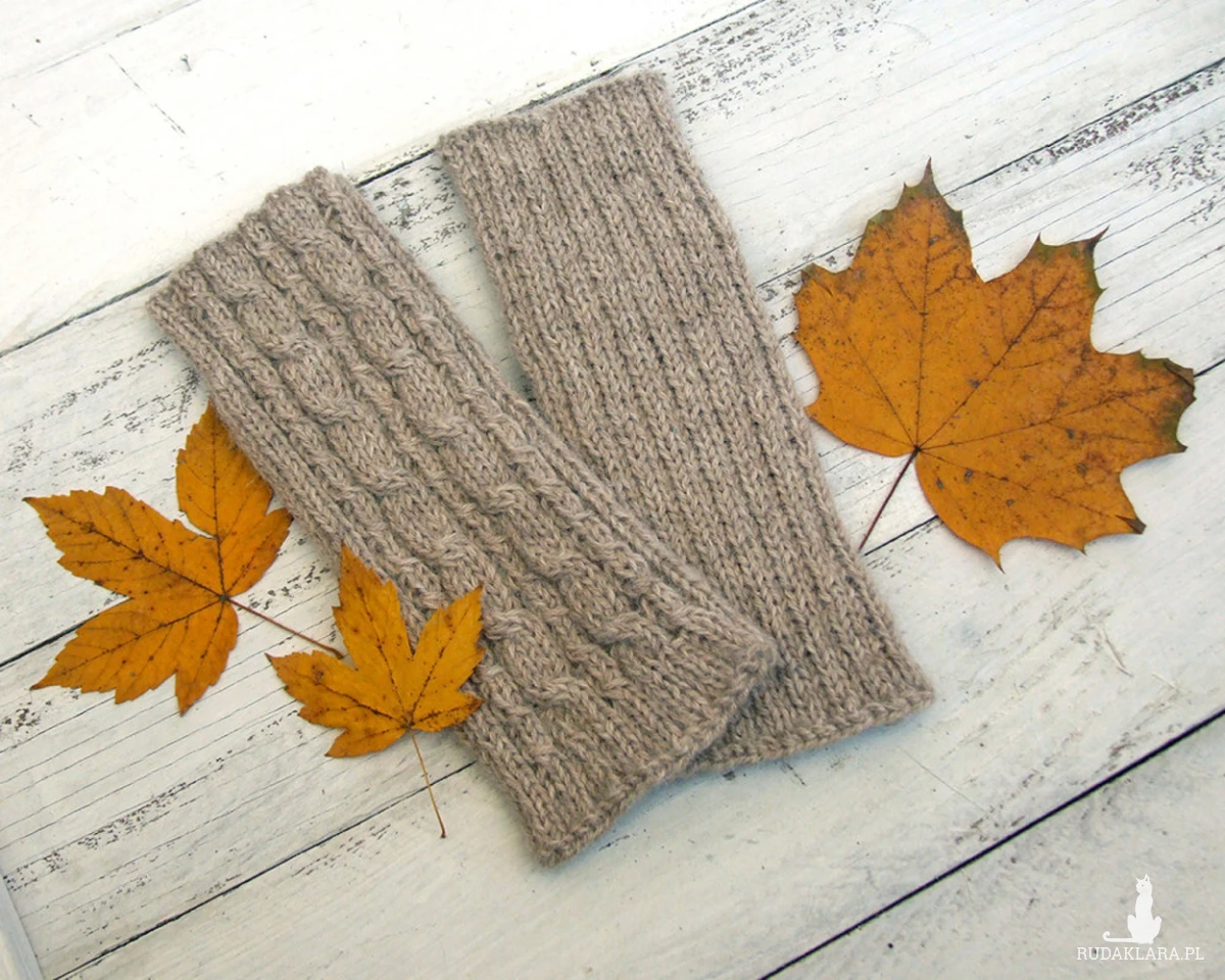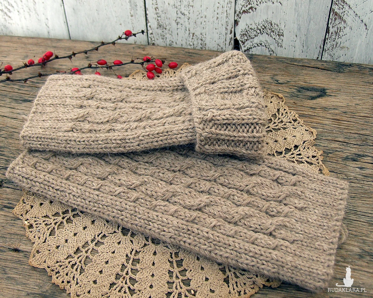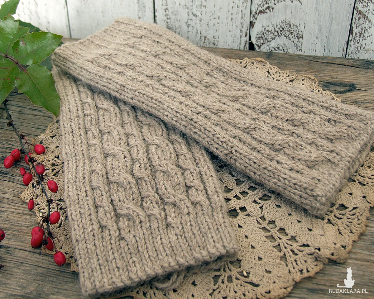 Beżowe, wełniane getry, ocieplacze - wykonane ręcznie na drutach wzorem ściągaczowym i w warkocze z jednej strony, bezszwowe,