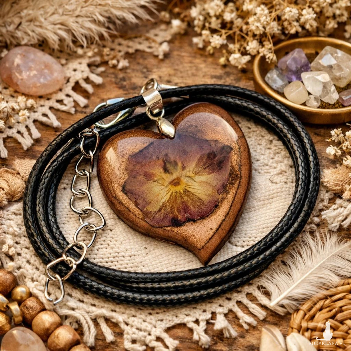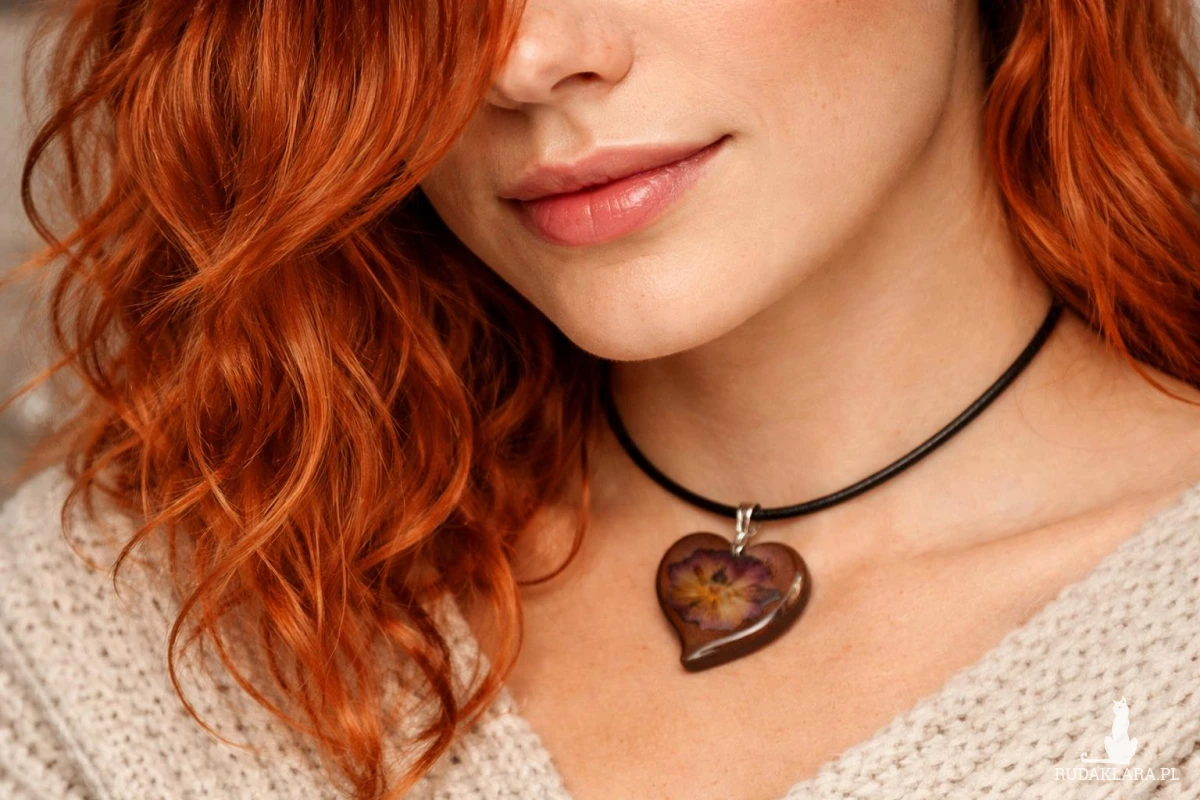 Biżuteria ma kształt serca i utrzymana jest w ciepłej, brązowo-metalicznej tonacji, co nadaje jej eleganckiego i lekko vintage charakteru. To doskonały wybór dla osób ceniących naturę, rękodzieło oraz niepowtarzalne dodatki.