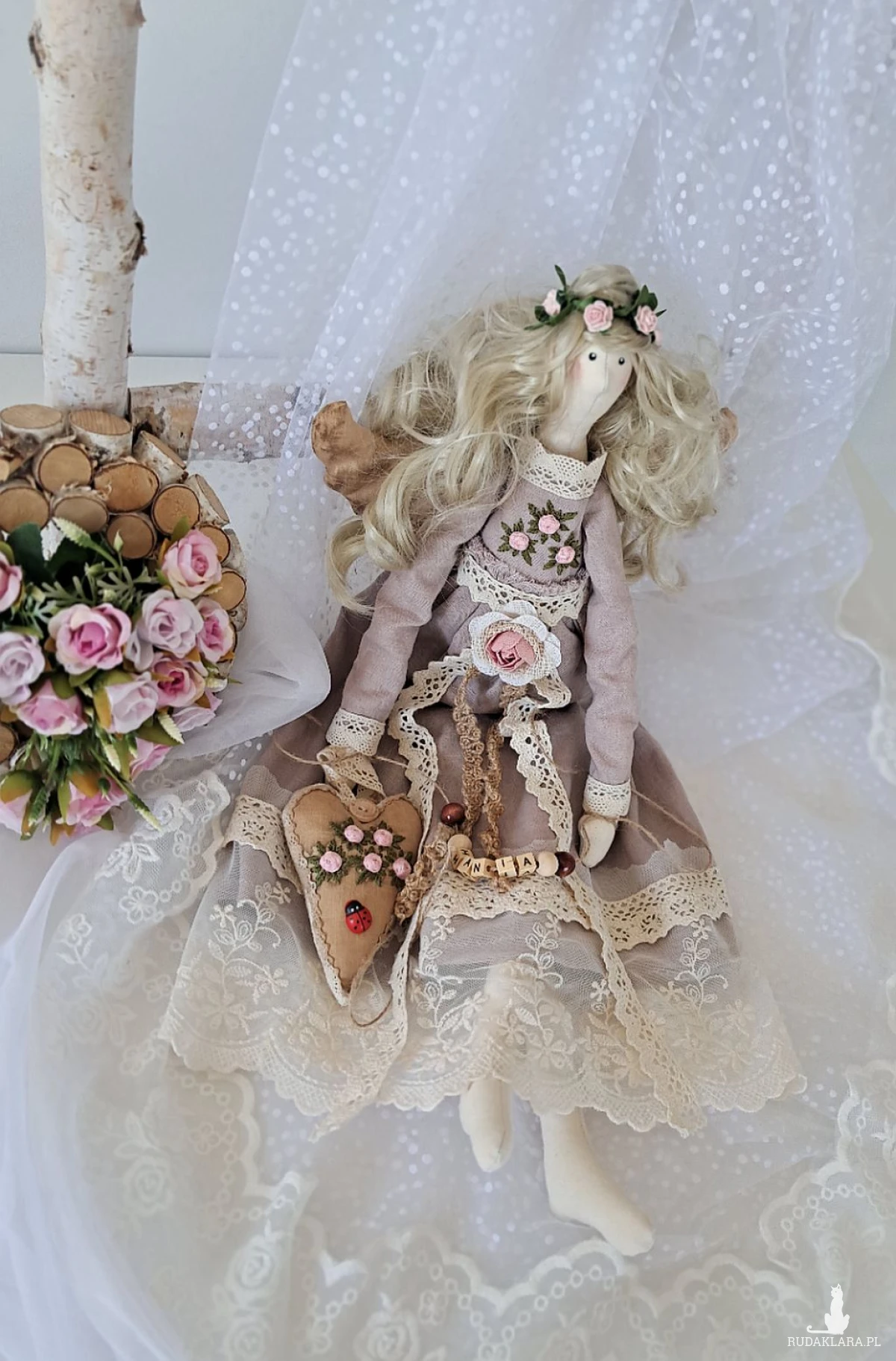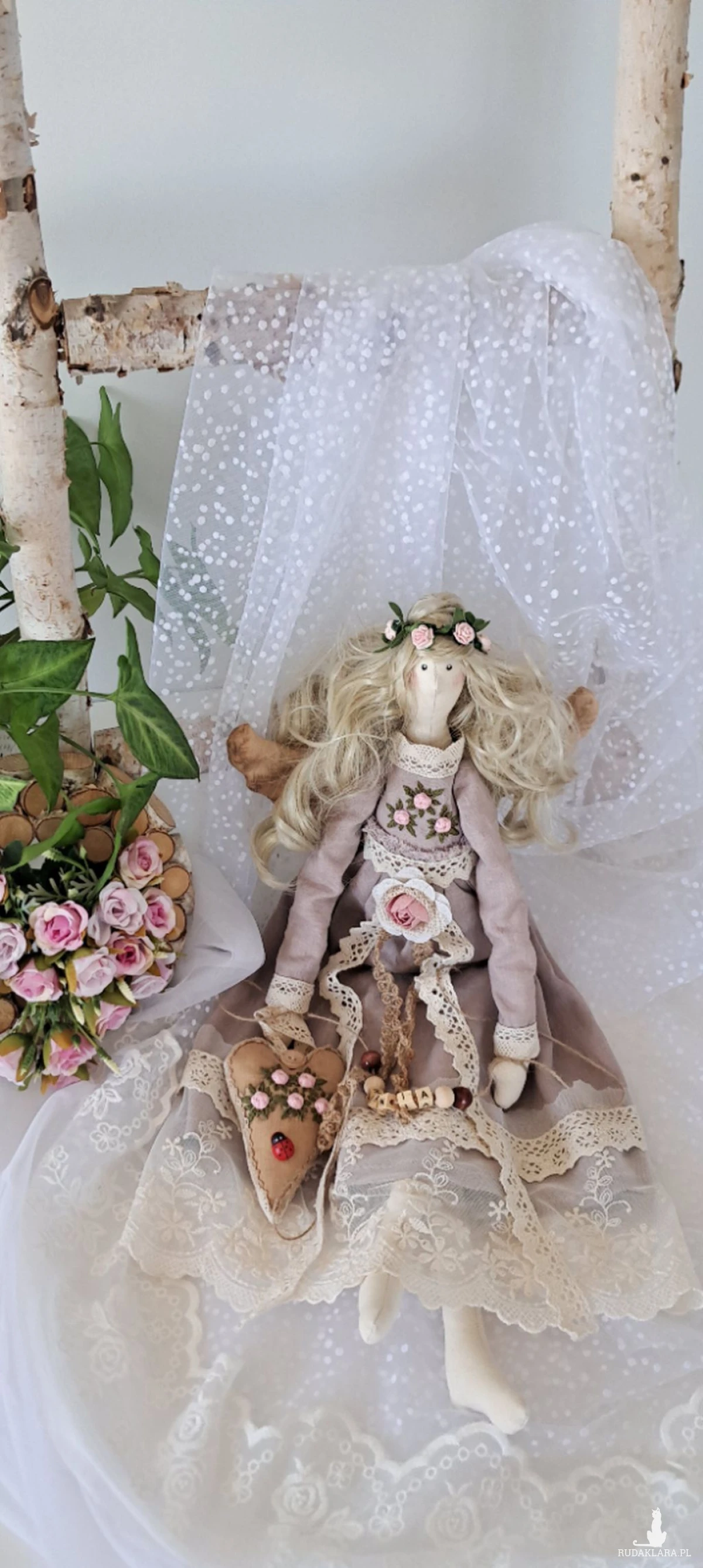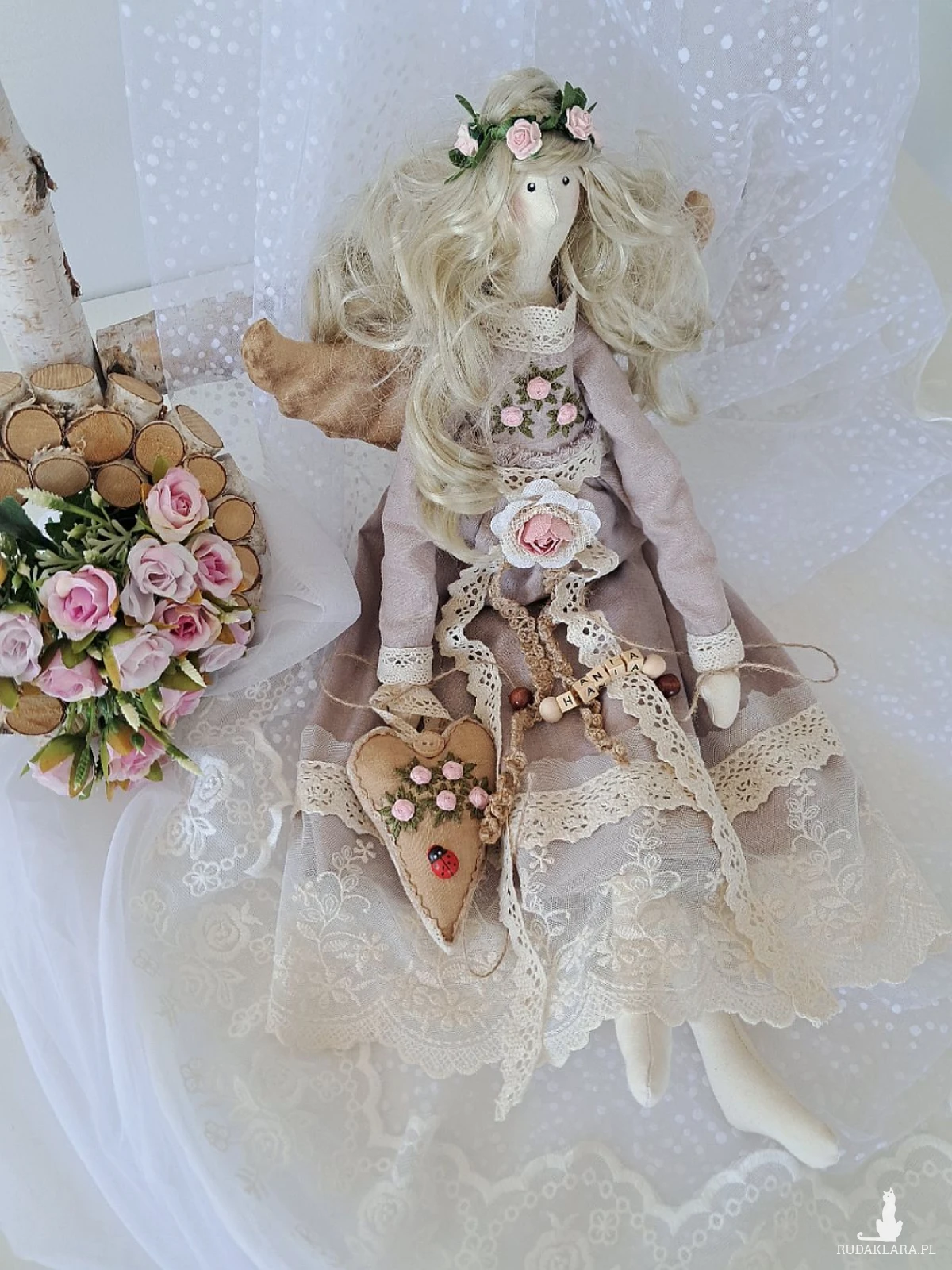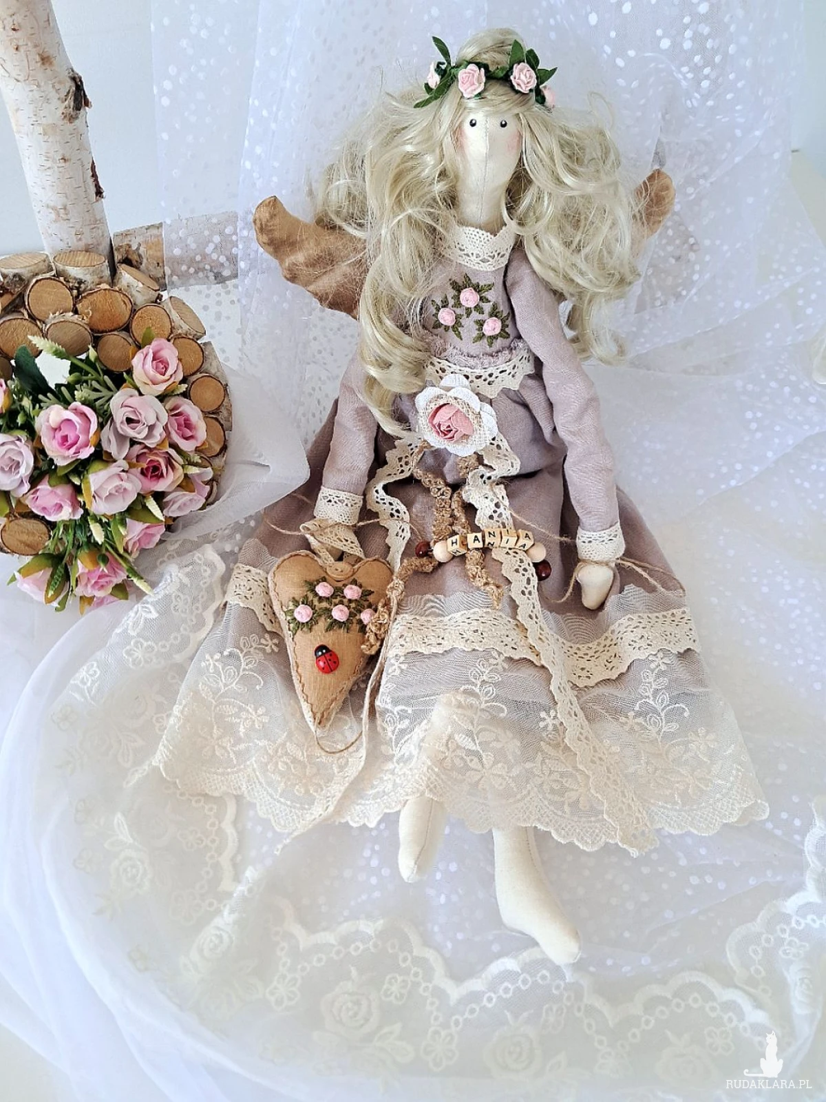Mam do sprzedania własnoręcznie uszytą anielicę. Wysokość 53 cm. Ciałko uszyte z surówki bawełnianej, wypełnione silikonową antyalergiczną kulką silikonową. Sukienka uszyta z wysokogatunkowego, 100 procentowego lnu w kolorze antycznego różu - góra ozdobiona haftowanymi przeze mnie różyczkami w kolorze bladego różu oraz zielonymi listkami,dół w koronkach w kolorze ecru. Serduszko również udekorowane wyszywanymi różyczkami oraz drewnianymi guziczkiem barwione kawą. Imię z drewnianych korali mogę zmienić stosownie do potrzeb. Włosy w kolorze lodowatego blondu,kręcone.Polecam na unikatowy, piękny prezent z różnych okazji. Dodam tylko,że to nie jest zabawka a urocza dekoracja;)