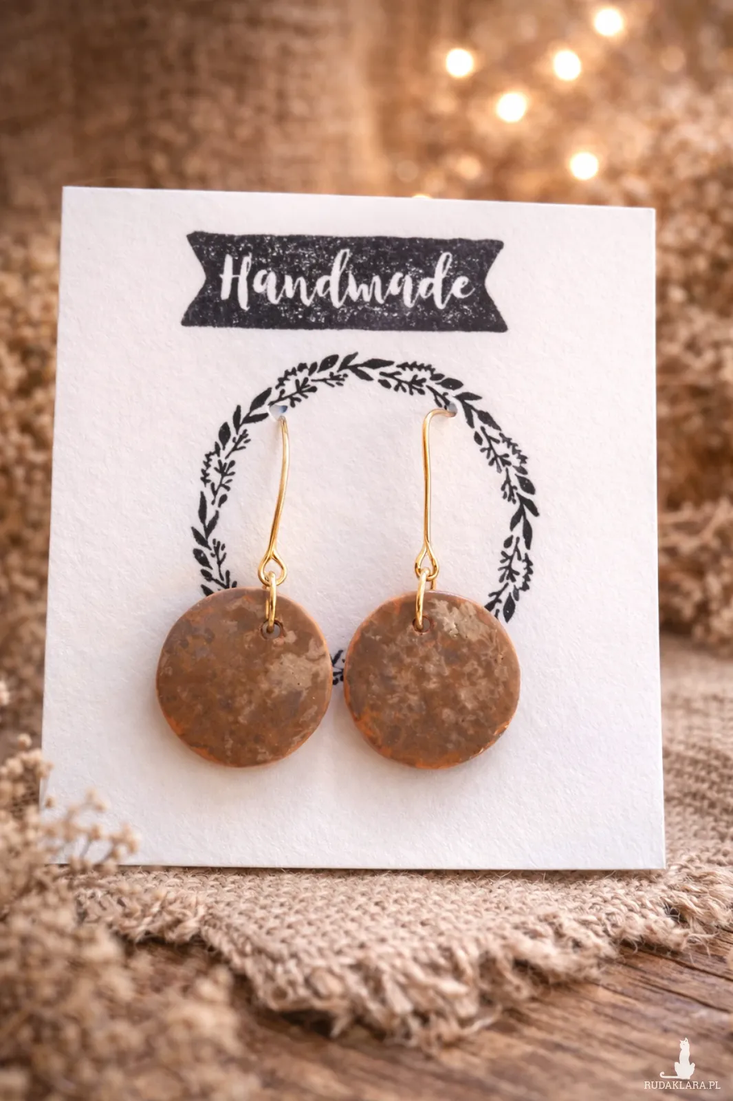 Kolczyki - kółka zostały ręcznie ulepione z gliny samoutwardzalnej. Zabezpieczone lakierem z połyskiem.Wymiary: ok. 2,5 (długość z biglami ). Bigle ze stali szlachetnej, bez niklu i ołowiu.