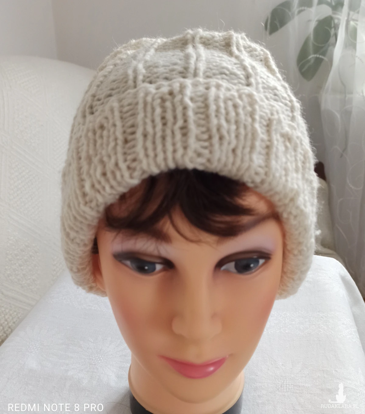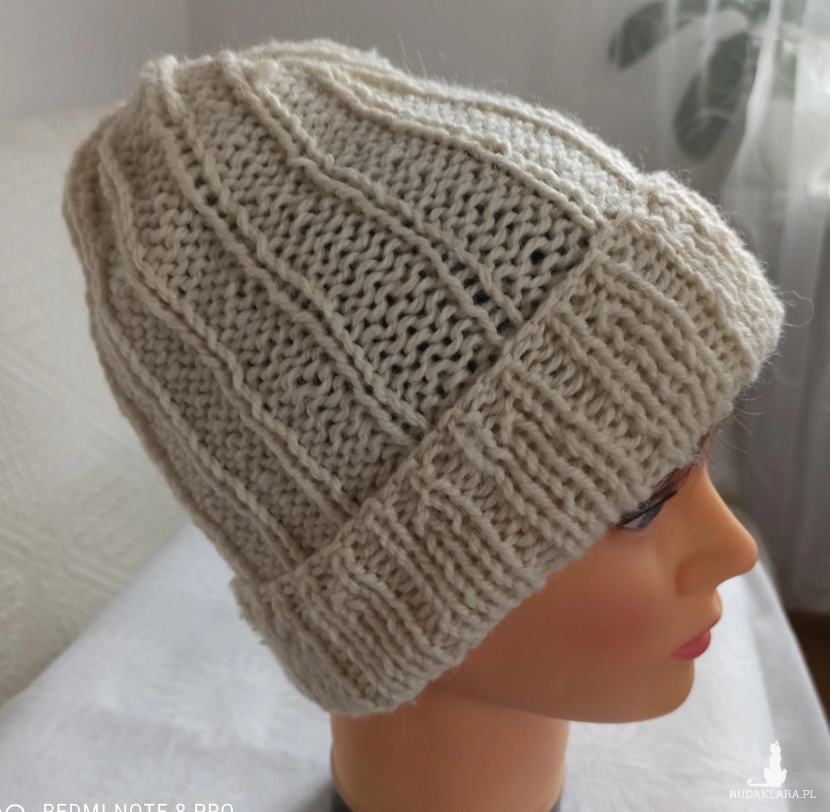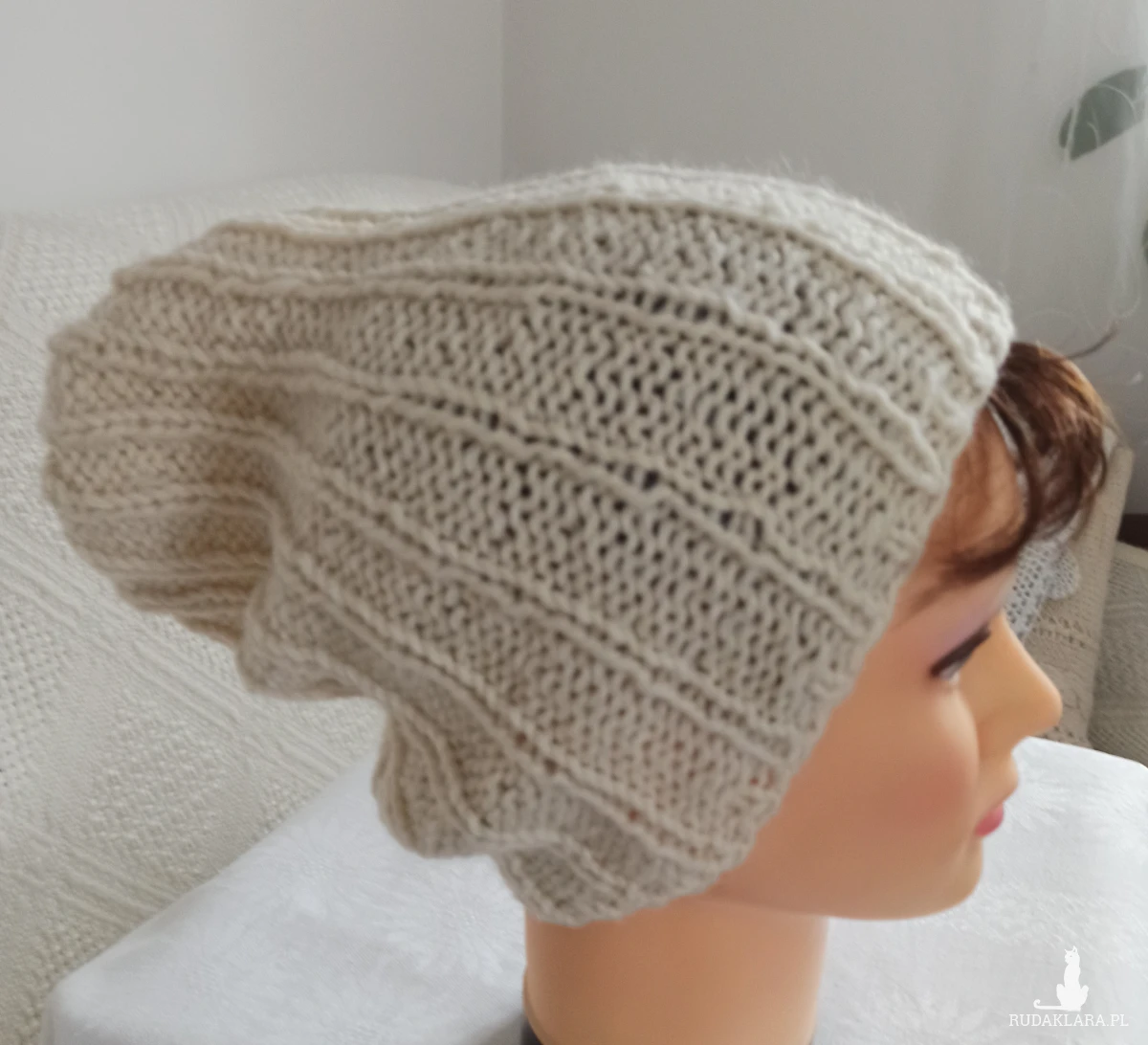 Czapka typu Smerfetka oversize wykonana z białej/ecru wełny alpaka z domieszką wiskozy. Wykonana delikatnym wzorem na lewych oczkach. Przyjemna w dotyku, nie gryzie. Dobrze ogrzewa i jest przewiewna. Niezbyt gruba, leciutka. Bezpieczny kolor pozwala nosić ją z wieloma zestawami ubrań. Wymiary: wysokość 28 cm, obwód do 56 cm. Zalecam pranie ręczne w temperaturze do 30 stopni. Gorąco polecam, niska cena. Kup, bo ktoś może CIĘ UBIEC.