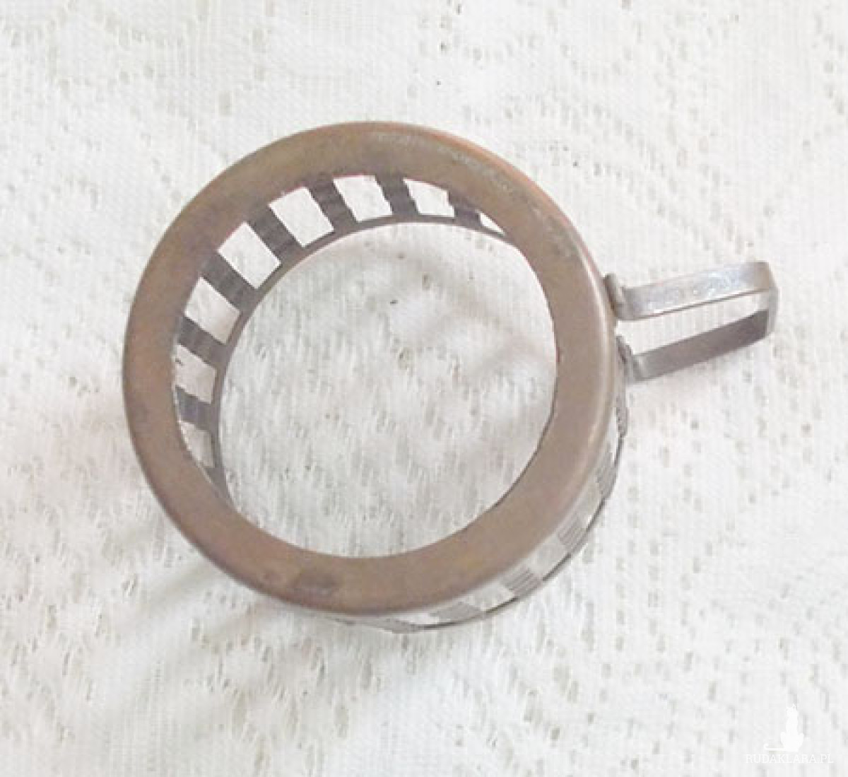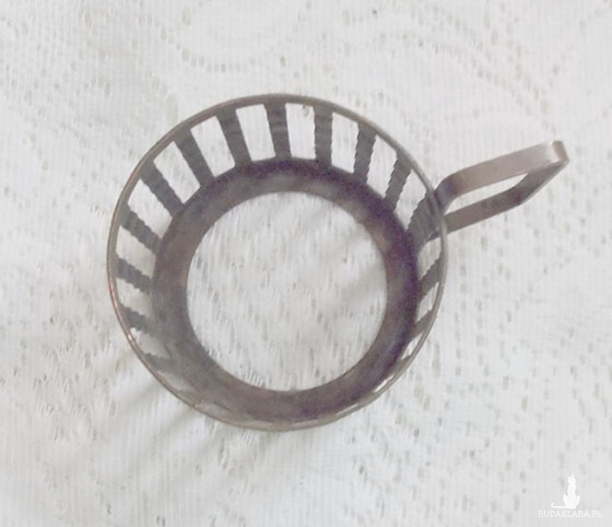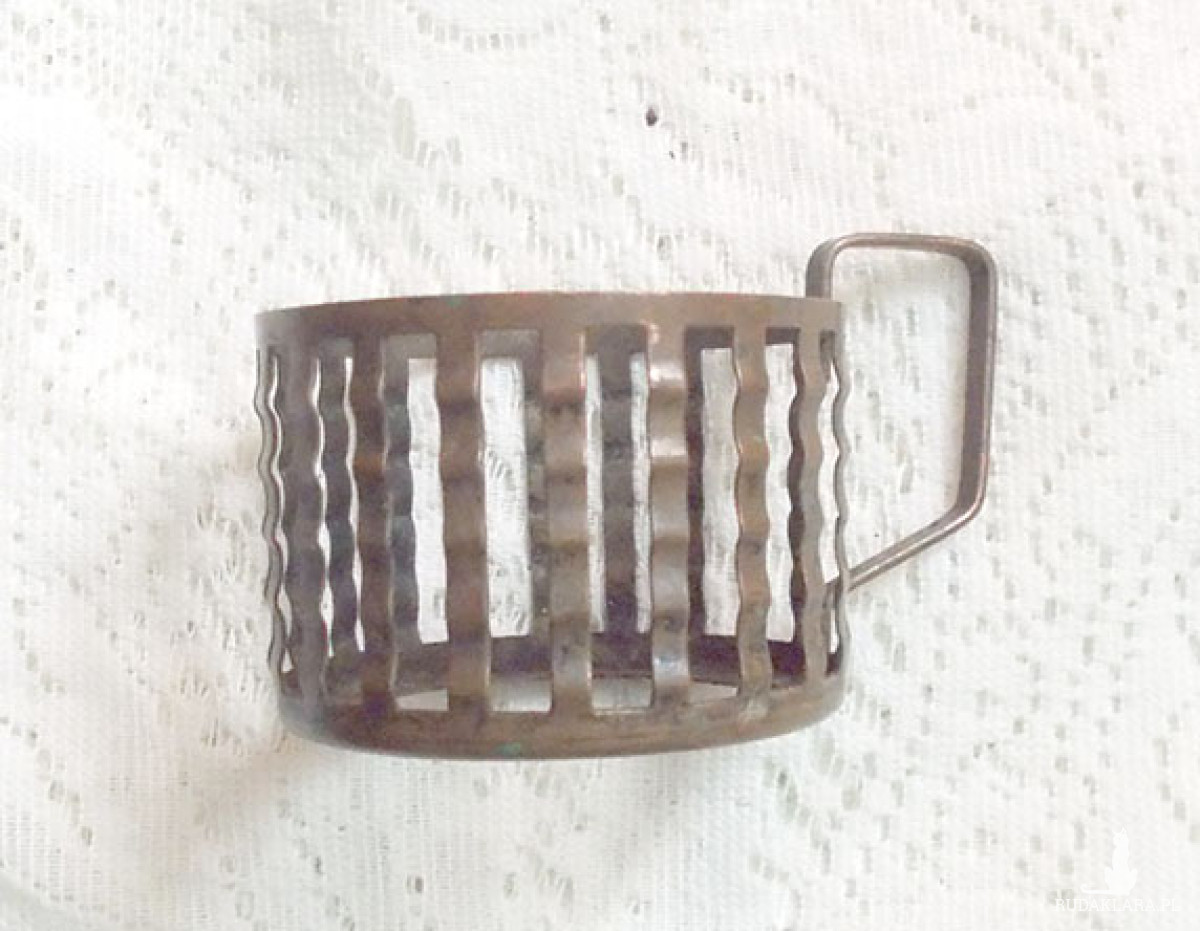Oryginalny vintage metalowy uchwyt do szklanki. Przedmiot z czasów PRL, lata 70/80. XX w.. Materiał: matowa miedź lub jakiś stop - metal jest brązowy, matowy. Koszyczki posiadają ślady rdzy i upływu czasu (głównie od wewnątrz lub spodu na zewnątrz). Wymiary: średnica 6,5 cm, wysokość 4,5 cm, szerokość wraz z uchwytem 9,5 cm.