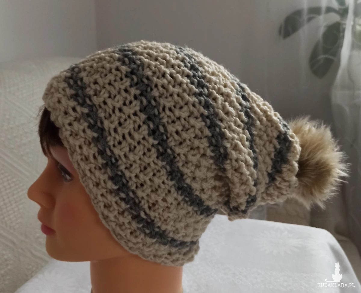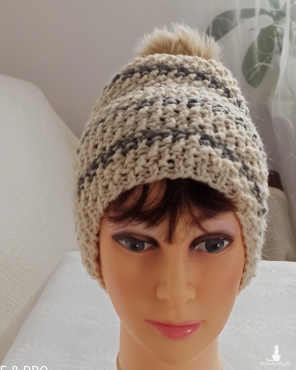 Czapka w paski biało-szare z pomponem wykonana z nici wełnianej. Wykonana na drutach ściegiem ryżowym. Lekka, miękka, bardzo przyjemna w dotyku, nie za gruba, dobrze ogrzewa i jest przewiewna. Nie gryzie. Można nosić a la smerfetka lub wywinąć otok. Wymiary: wysokość 28 cm, obwód do 56 cm. Doradzam pranie ręczne, w temperaturze do 30 stopni. Gorąco polecam, niska cena. Kup, bo ktoś może CIĘ UBIEC.