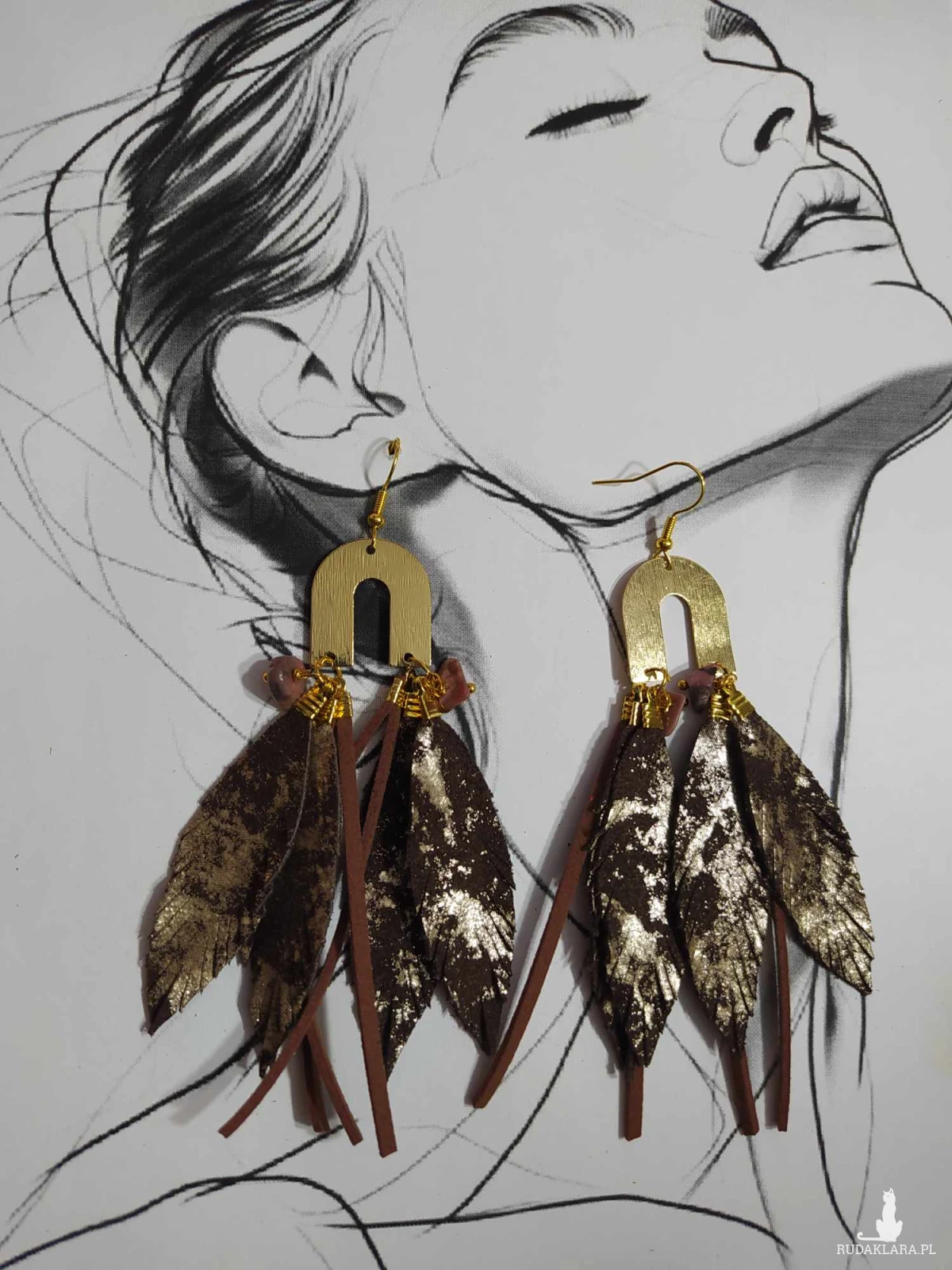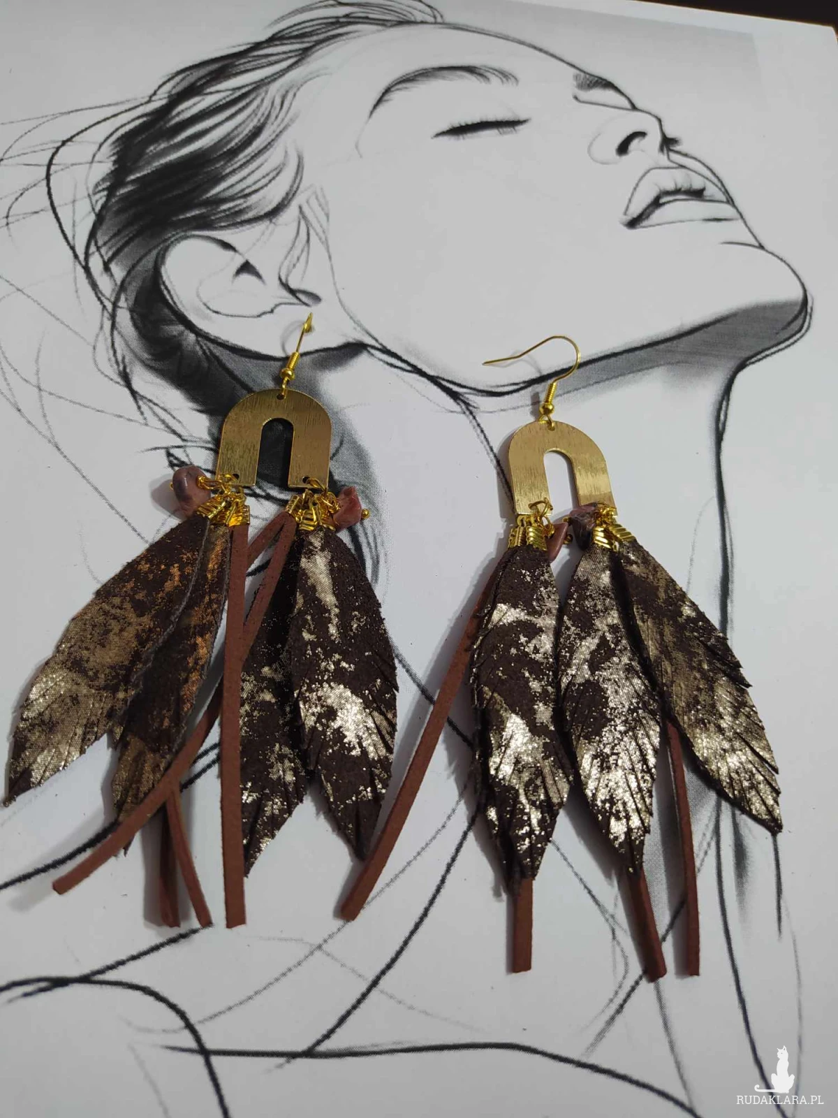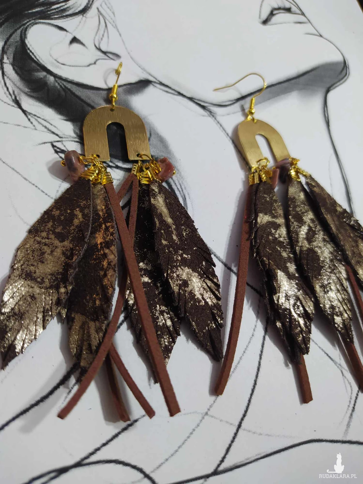 Kolczyki z piór oraz skór włoskich, dodatki w postaci kamieni naturalnych.
