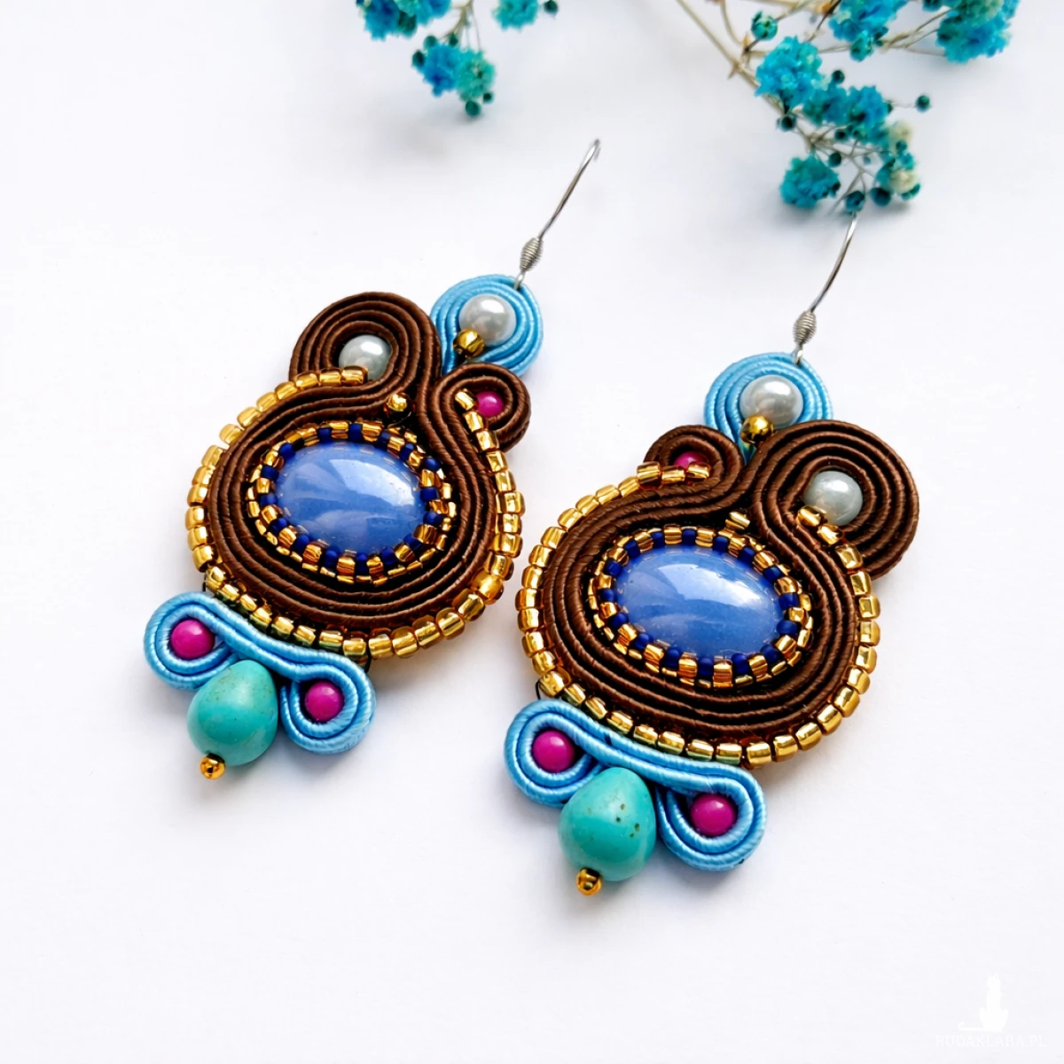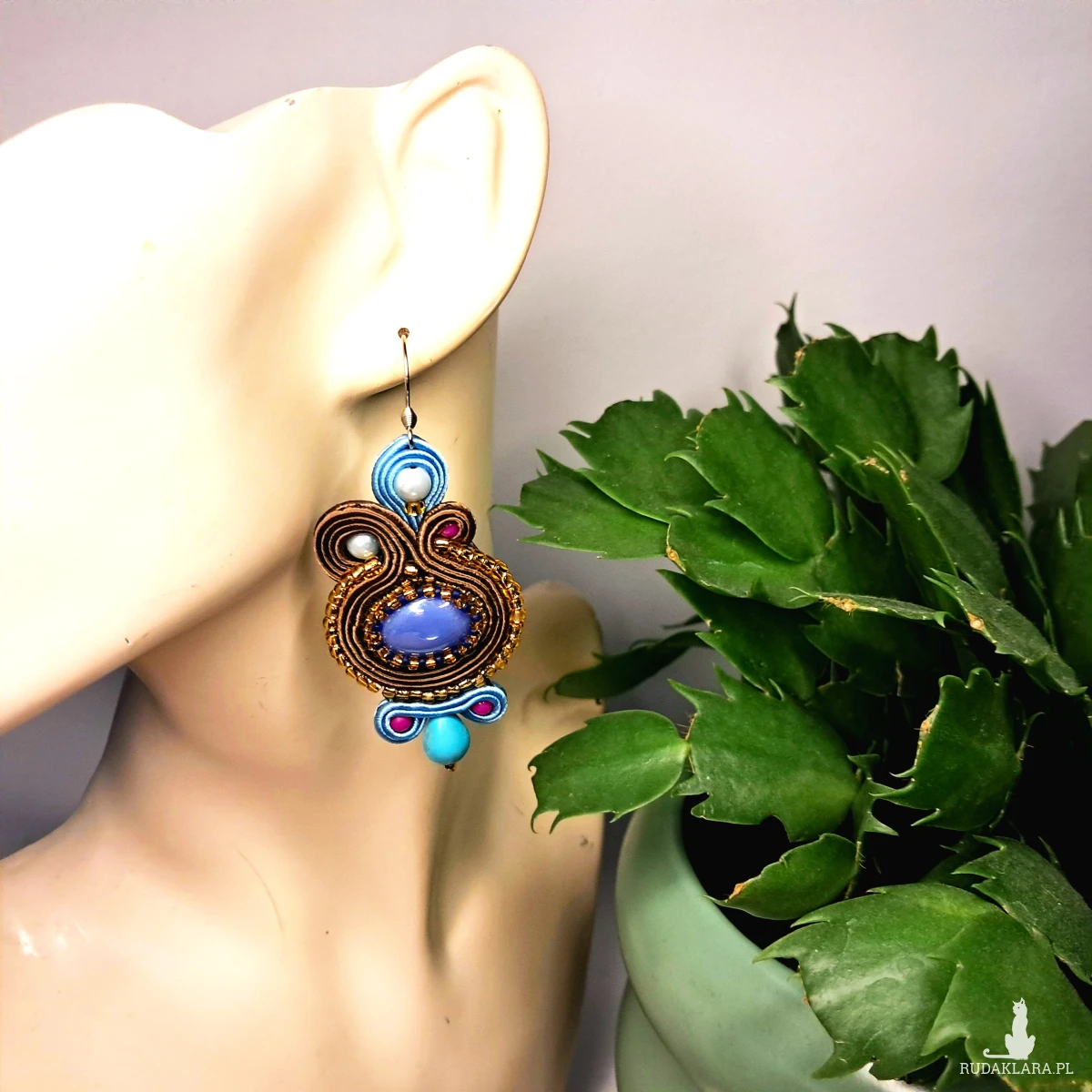 Te wyjątkowe kolczyki sutasz zostały wykonane ręcznie z dbałością o każdy detal. Połączenie ciepłego brązu, chłodnego błękitu i złotych akcentów tworzy harmonijną, a jednocześnie przyciągającą wzrok kompozycję.