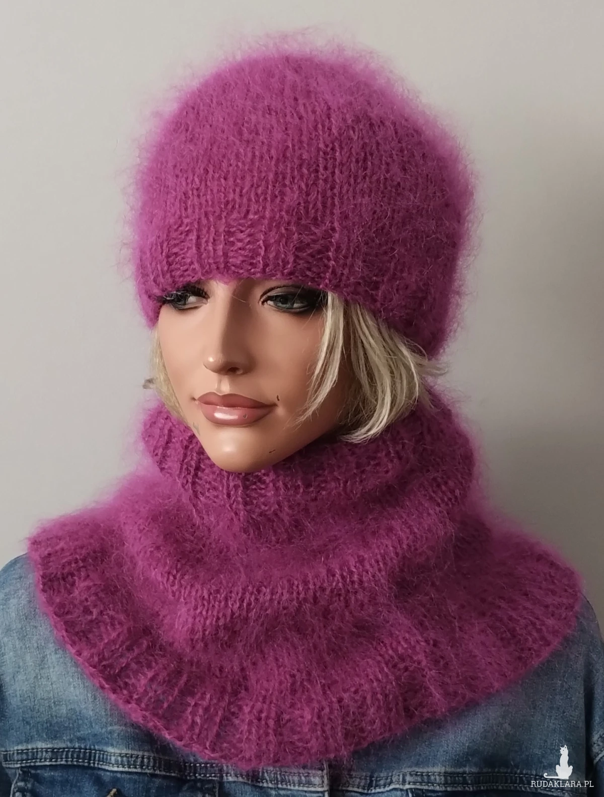Moherowy komplet czapka i komin,zrobione ręcznie na drutach z mieszanki moheru i akrylu w kolorze ciemnej fuksji. Włóczka puszysta, miękka, nie gryzie, ma śliczny włos. Rozmiar uniwersalny. Producent włóczki zaleca pranie ręczne w temperaturze 30 stopni, suszyć na leżąco.