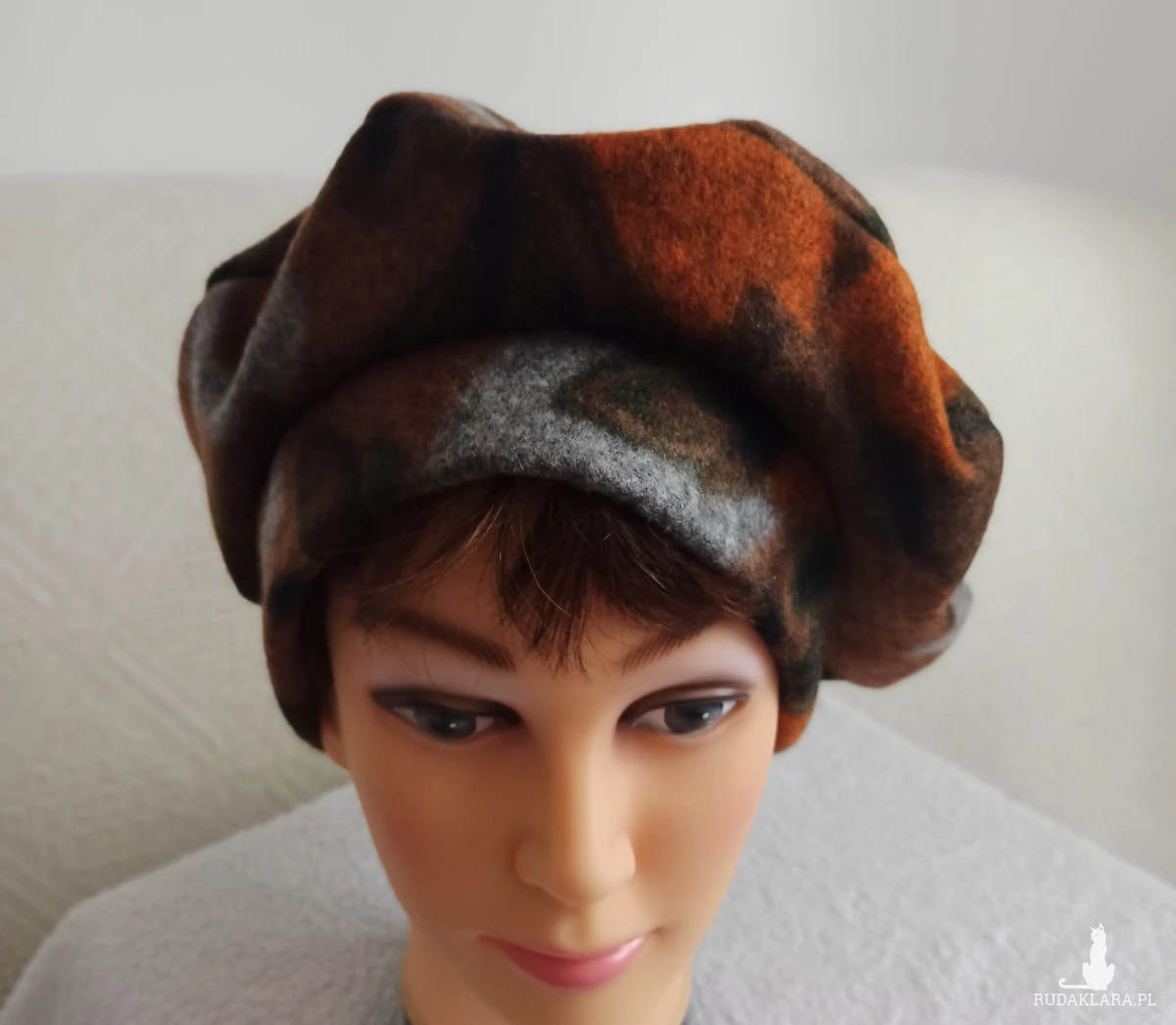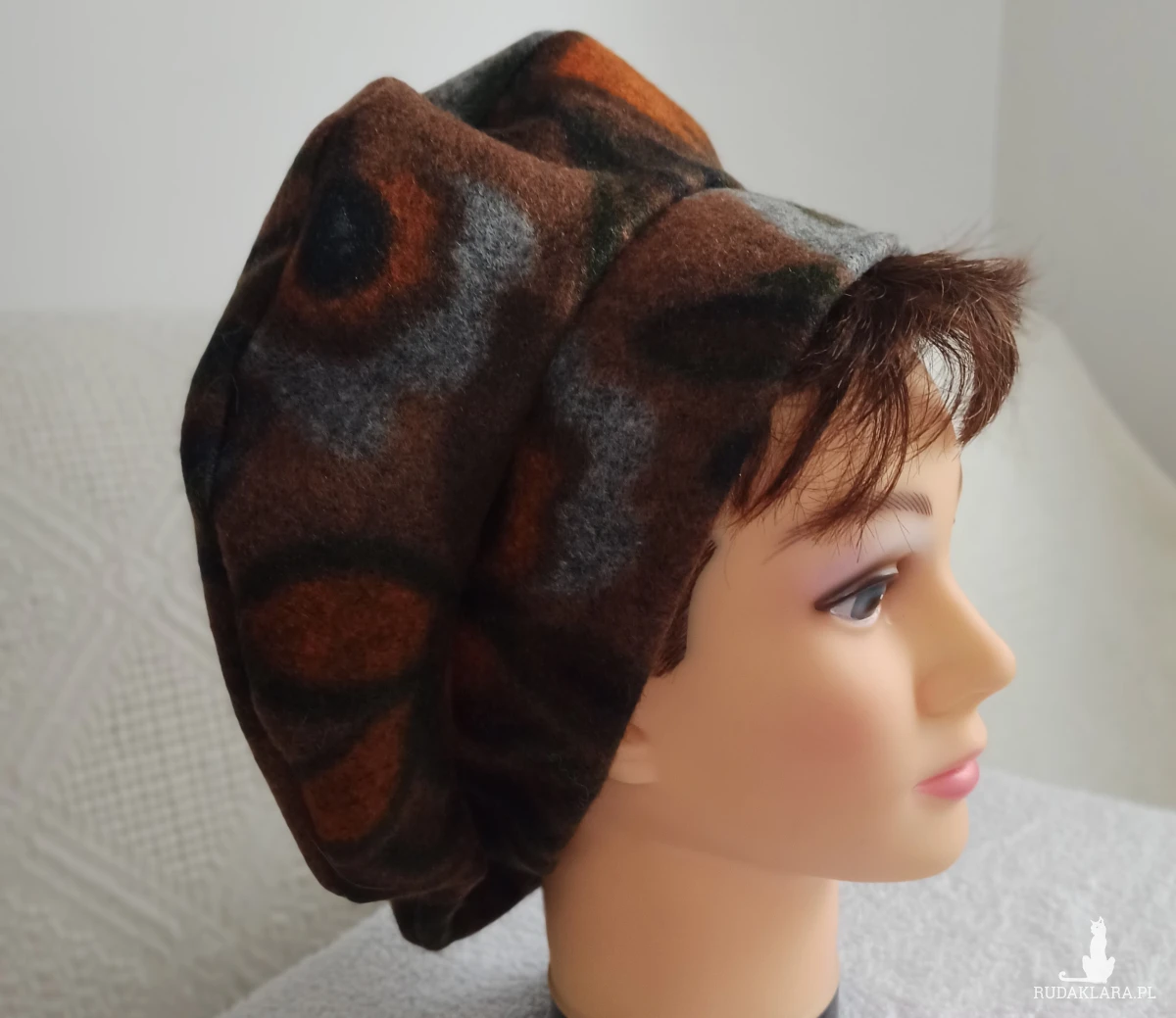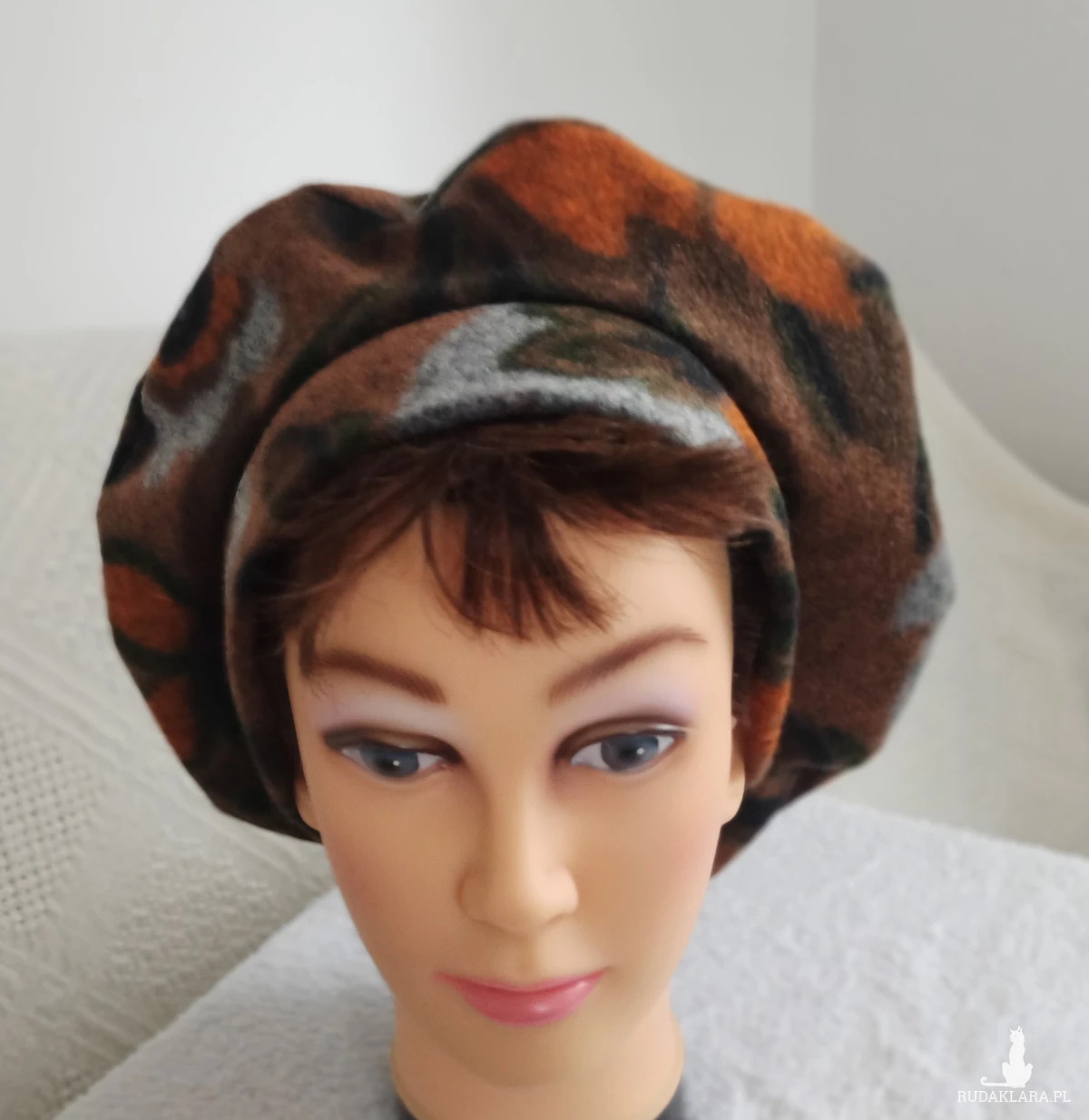 Beret uszyty handmade z flauszyku w kwiatowe wzory w kolorach brązu ciemnego i jasnego, szarości, pomarańczy, rudego. Wewnątrz wszyta cieniutka podszewka bawełniana. Flauszyk nie gniecie się, nie mechaci, przepuszcza powietrze i doskonale ogrzewa. Nie ma lepszej tkaniny na zimne dni. Będzie wspaniałym uzupełnieniem nieszablonowego stroju, z pewnością będzie zauważony. Leciutki, przemiły w dotyku, super wygląda na głowie.