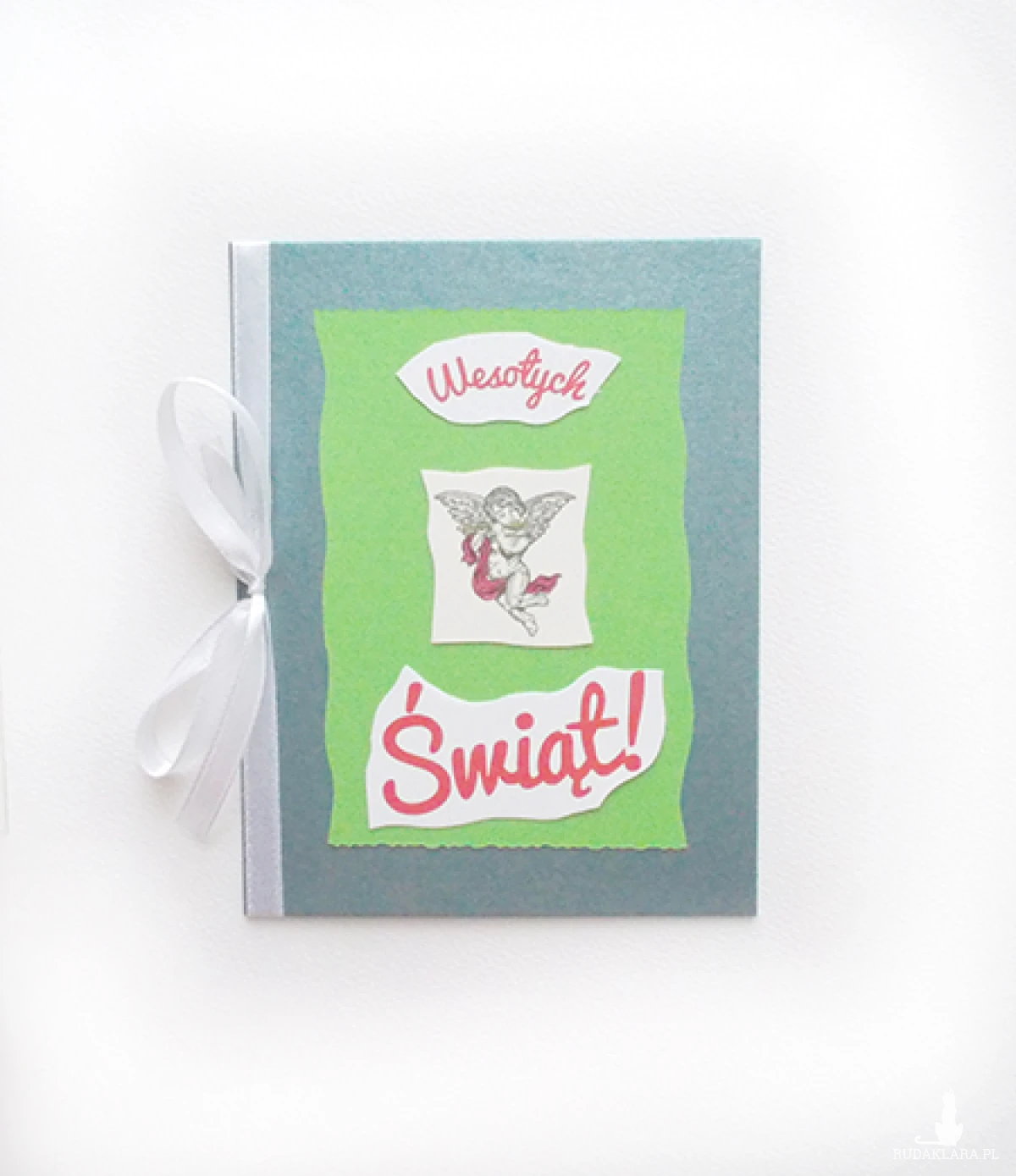 Otwierana kartka z okazji świąt Bożego Narodzenie i Nowego Roku. W środku karnet jest bez życzeń, perłowy kartonik, wstążeczka. Dołączona biała koperta.
