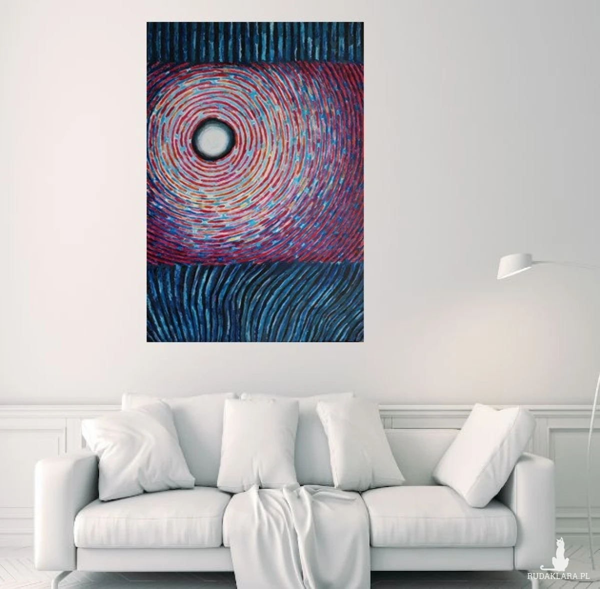 Obraz namalowany techniką akrylową na blejtramie o wymiarach: 100/70 cm, boki obrazu zamalowane, sygnowany z tyłu. Jest to moja autorska kompozycja. Świetnie może być eksponowany w nowoczesnych wnętrzach o stonowanej kolorystyce. Swoimi barwami może rozjaśnić takie wnętrza, w oświetleniu dziennym, jak i sztucznym. Polecany dla miłośników abstrakcji i nie tylko.