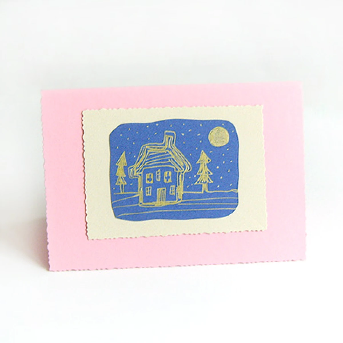 różowa kartka na Boże Narodzenie, bajkowa kartka z domkiem, świąteczne kartki bez życzeń, kartki ręcznie rysowane, noworoczne kartki, domek kartka, dom kartka