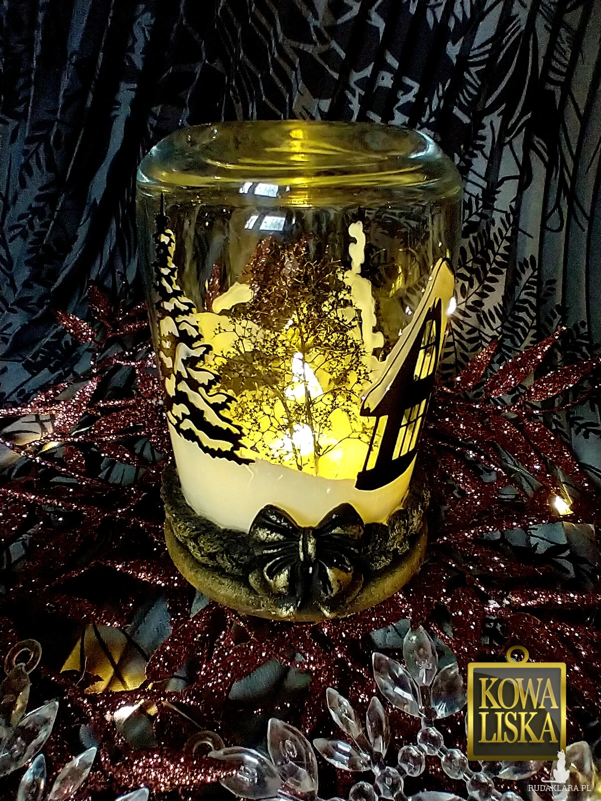 Zamknięty wewnątrz nastrojowy, zimowy pejzażyk umili długie, zimowe wieczory. Rozświetlony od środka ciepłym światłem ożywa magią, poczuciem domowego bezpieczeństwa i tęsknotą za dzieciństwem.