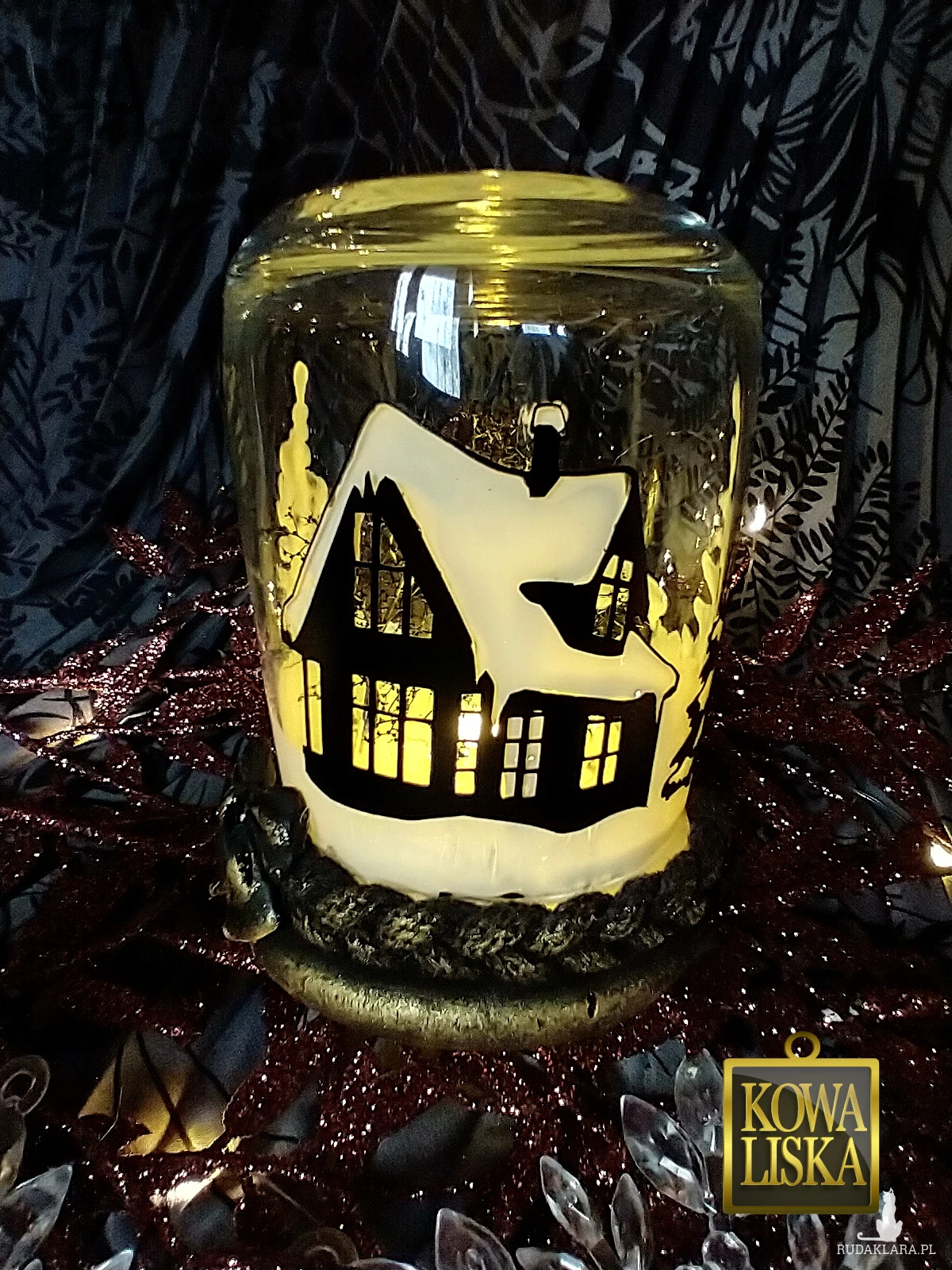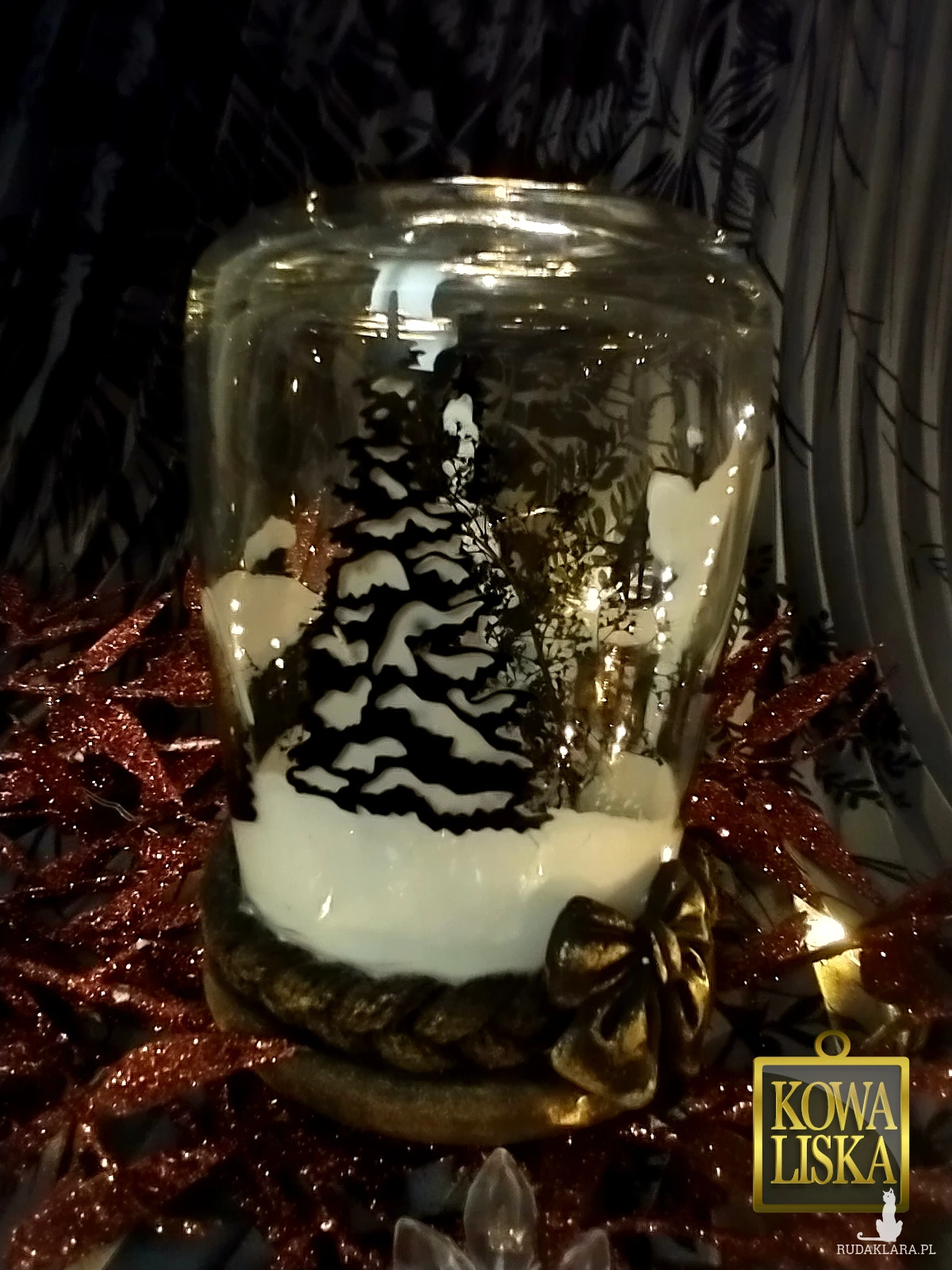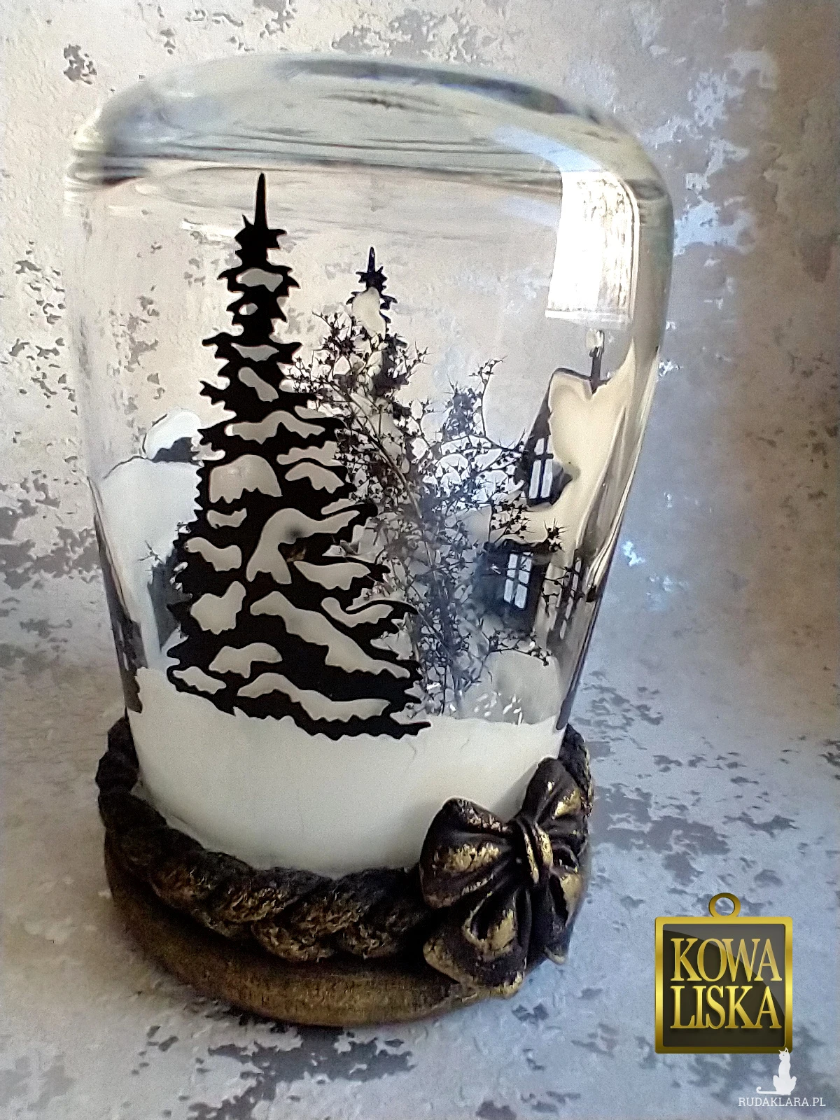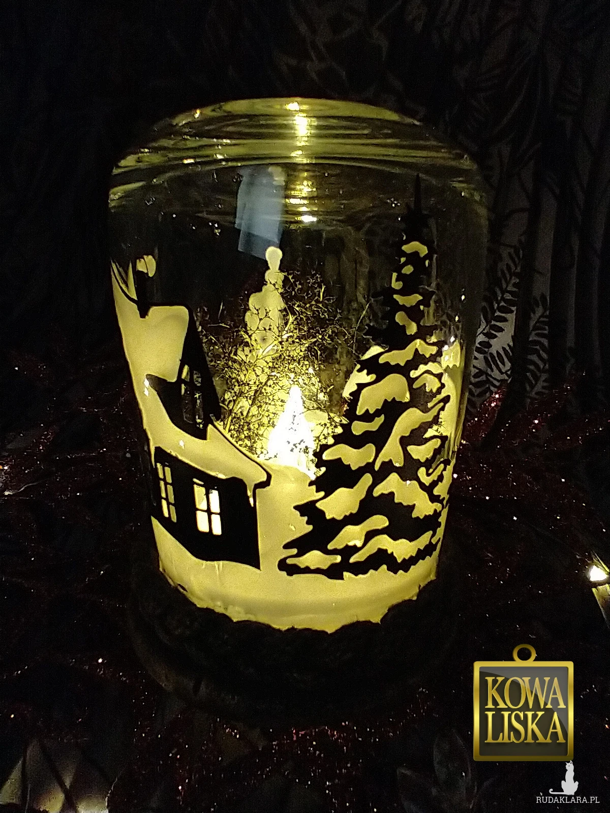 Wykonany na bazie prostej szklanki lampion jest ozdobiony z zewnątrz elementami z czarnej folii, wewnątrz podmalowany na biało. Zamknięte w środku prawdziwe gałązki imitują nagie drzewa, w tym modelu czarne. Po włączeniu pięknie odbijają światło.