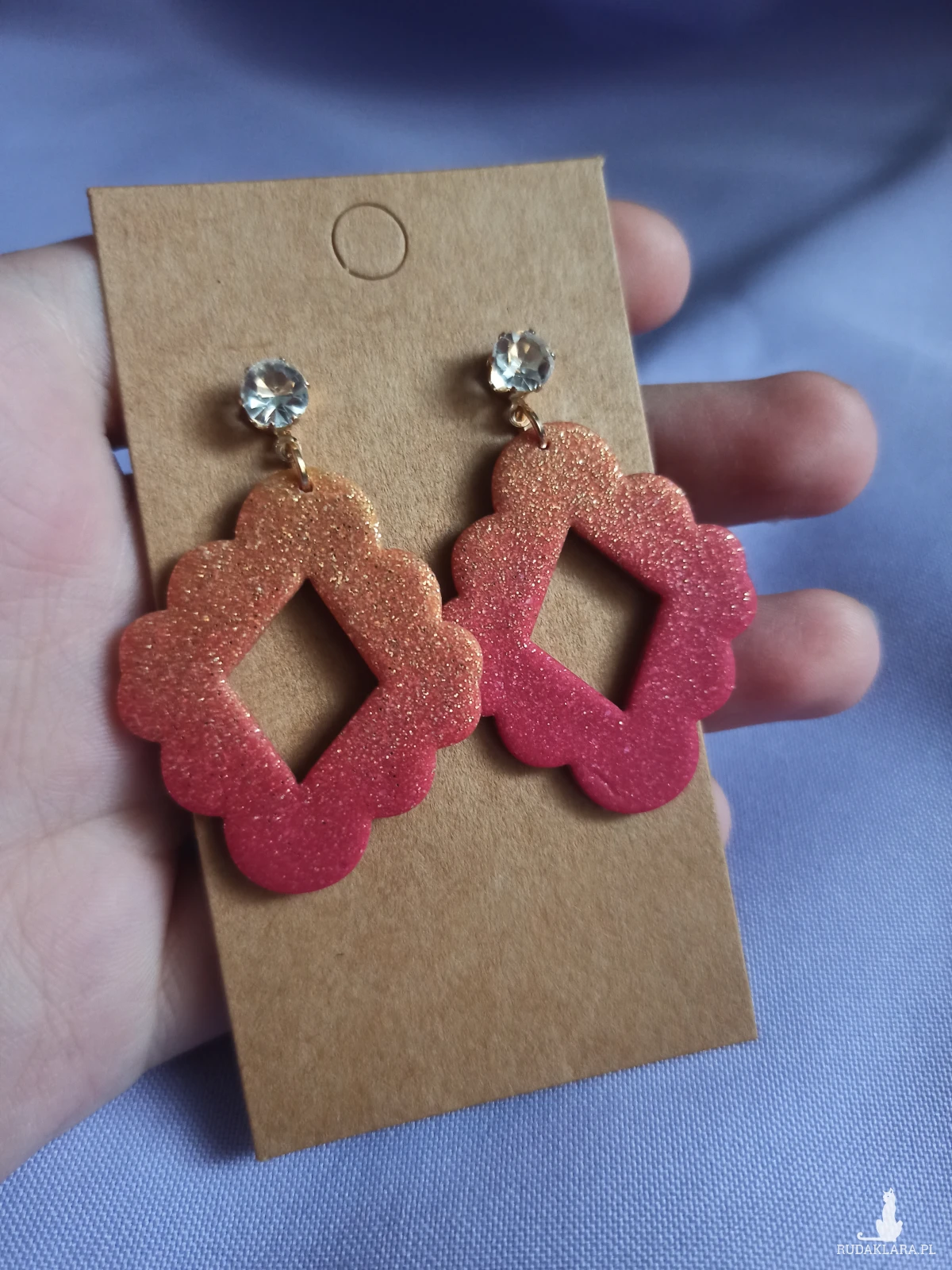 Kolczyki w kształcie organicznym. Czerwono złote ombre. Brokatowe. Błyszczące. Ozdobny sztyft z diamencikiem.