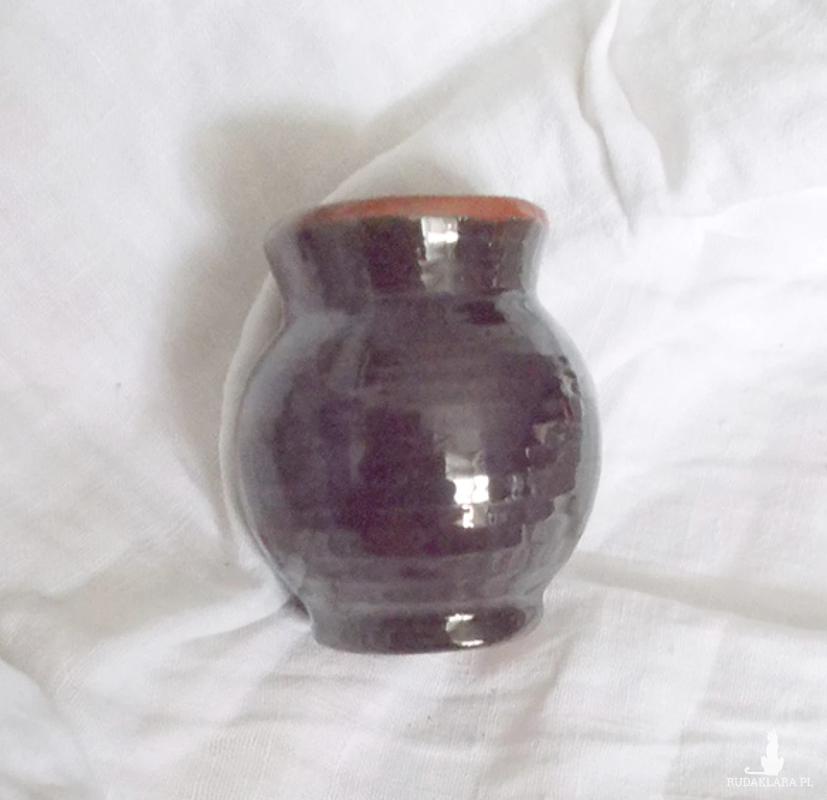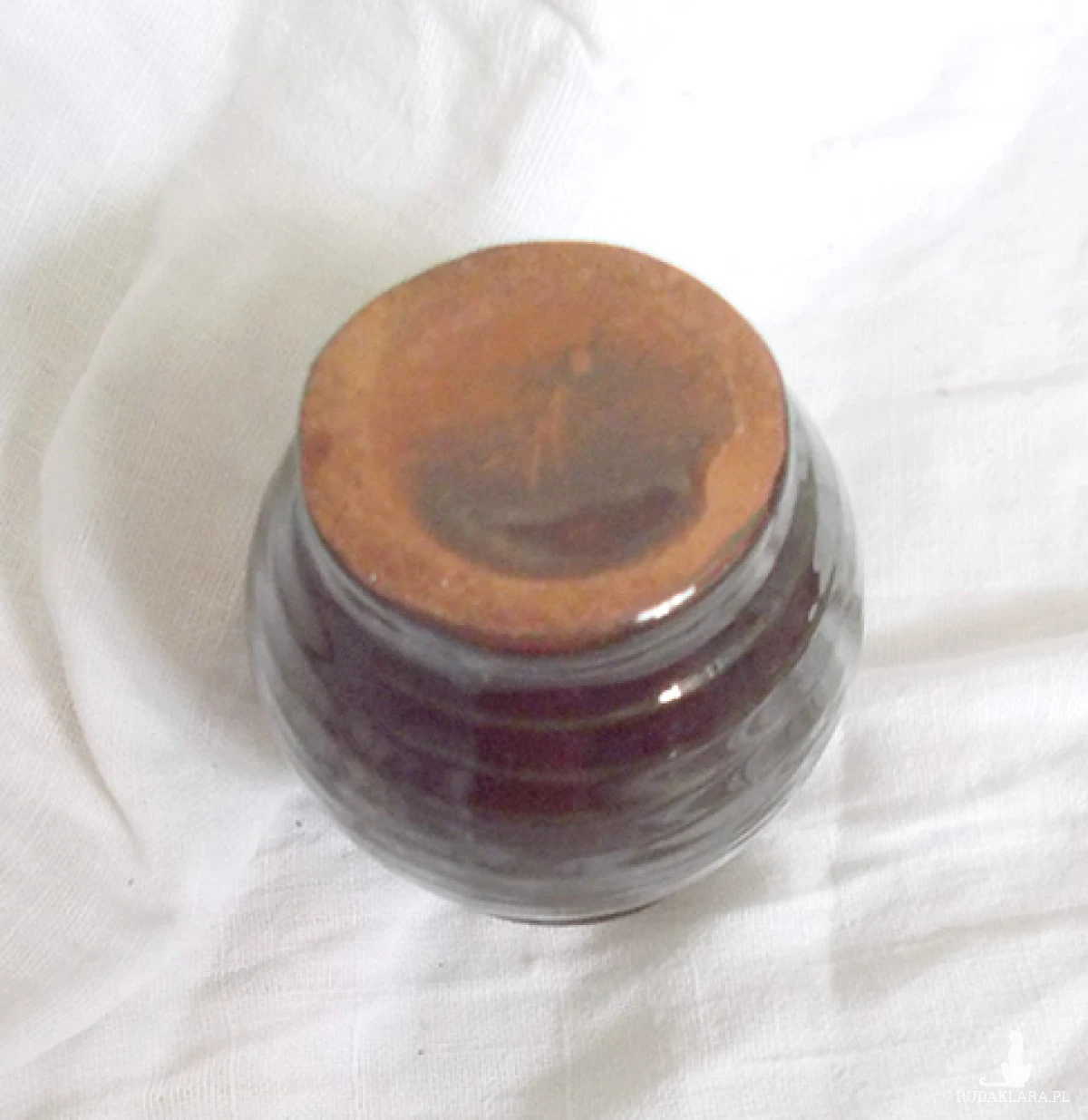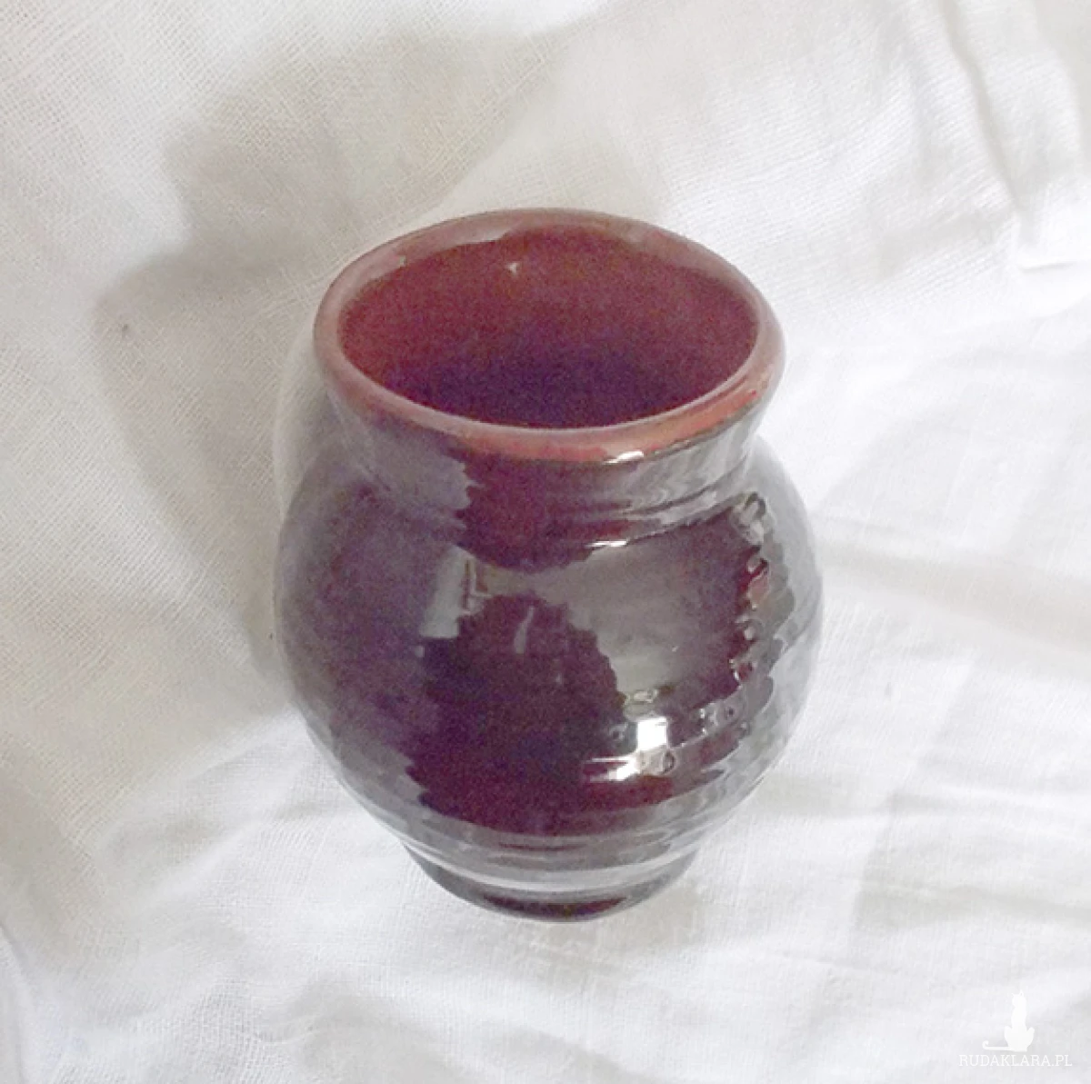 Oryginalny przedmiot vintage z okresu PRL, lata 60/70.. Kamionkowy, ceramiczny, retro wazonik Kolorystyka całości jest ciemnobrązowa. Wazonik ma dookoła delikatne prążki w kolorze ciemnozielonym. Wymiary to: wysokość ok. 9,5 cm, średnica otworu ok. 5,8 cm. Oryginalna, rustykalna dekoracja do jadalni, salonu, kuchni itp. Stan bdb.