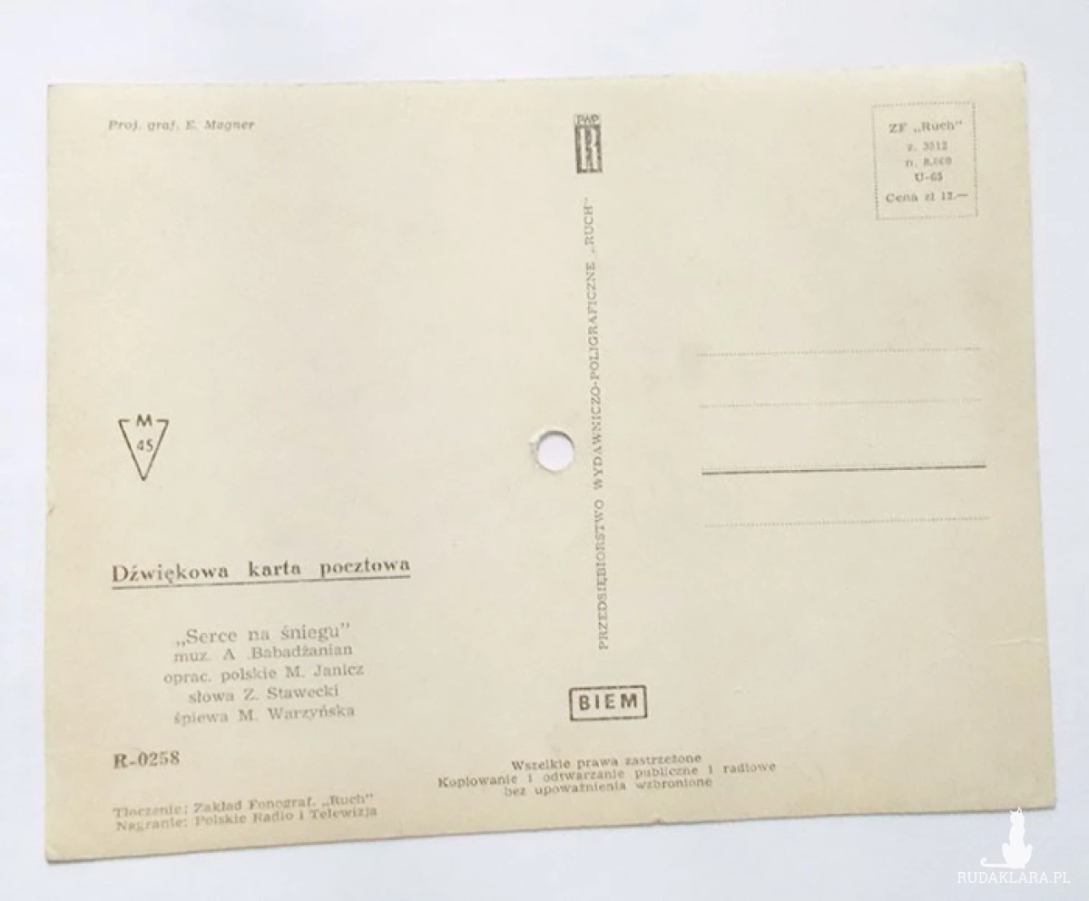 Retro pocztówka dźwiękowa. Piosenka pt. "Serce na śniegu" śpiewa Maria Warzyńska, słowa Zbigniew Stawecki, muzyka Arno Babadżanian, opracowanie polskie Mieczysław Janicz. Płyta z czasów PRL lata 70, nagranie Polskie Radio i Telewizja, tłoczona przez Zakład Fonograficzny "Ruch", Przedmiot dla kolekcjonerów, niestety nie mam możliwości sprawdzić stanu nagrania.