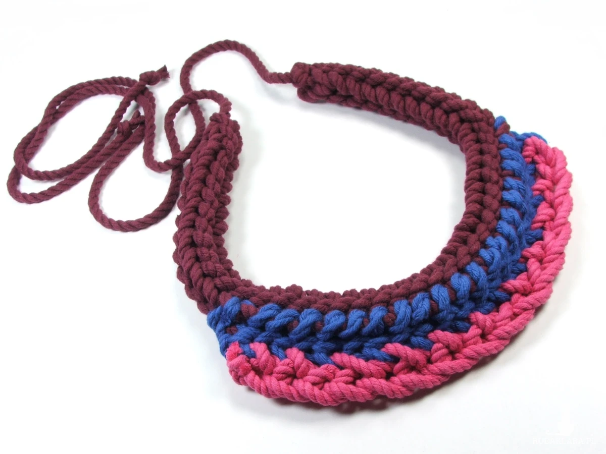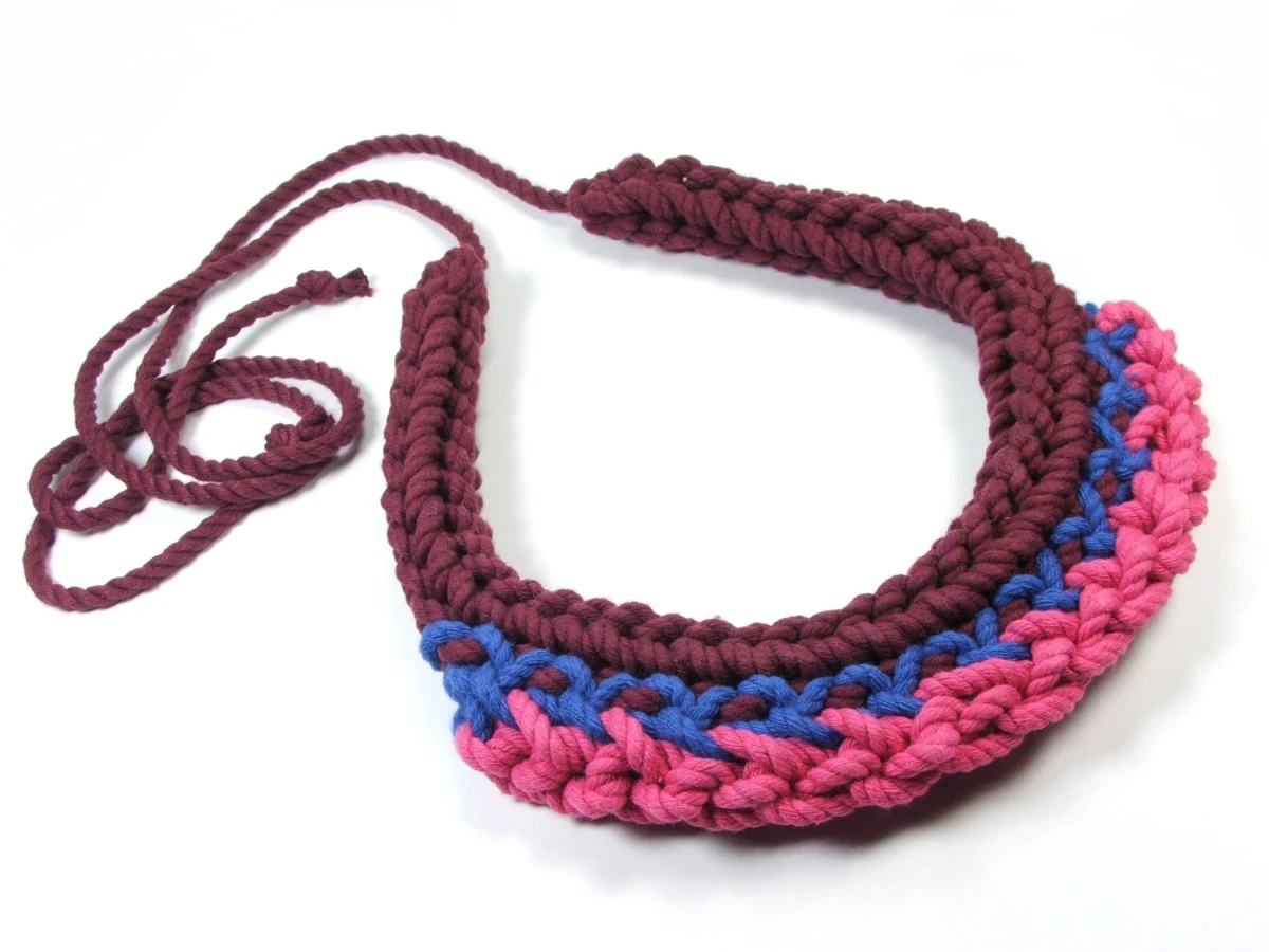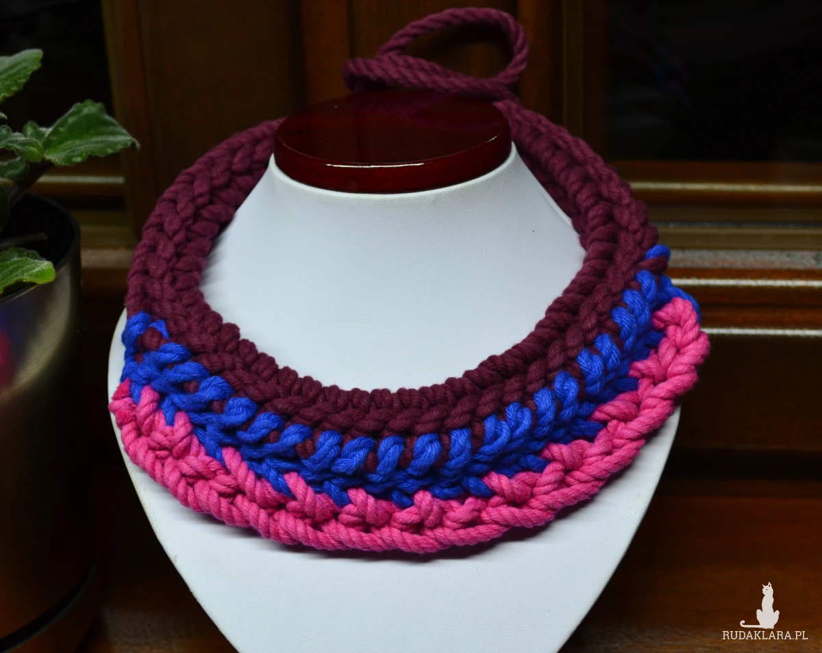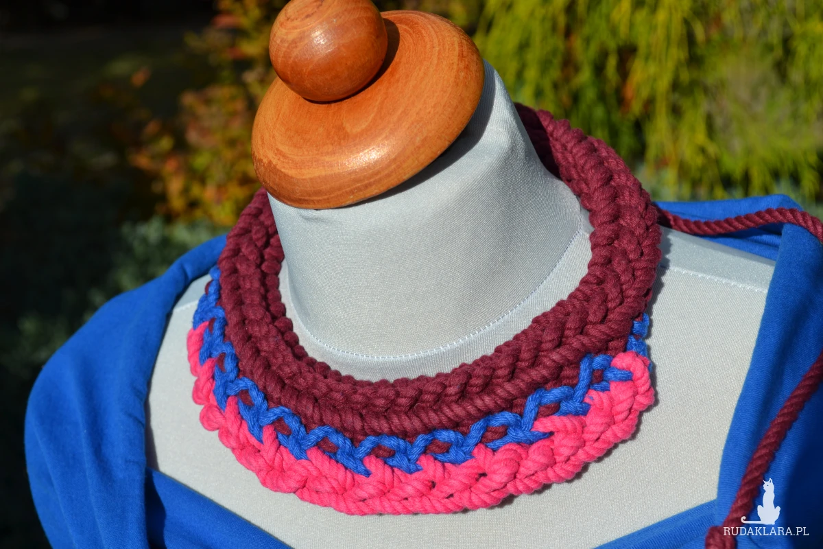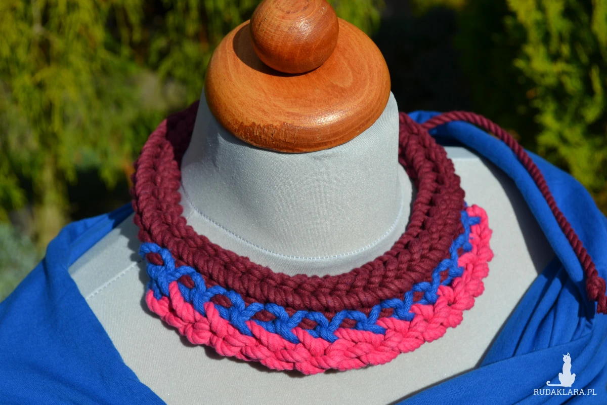 Naszyjnik w kolorach: wiśniowy, intensywny niebieski, różowy.