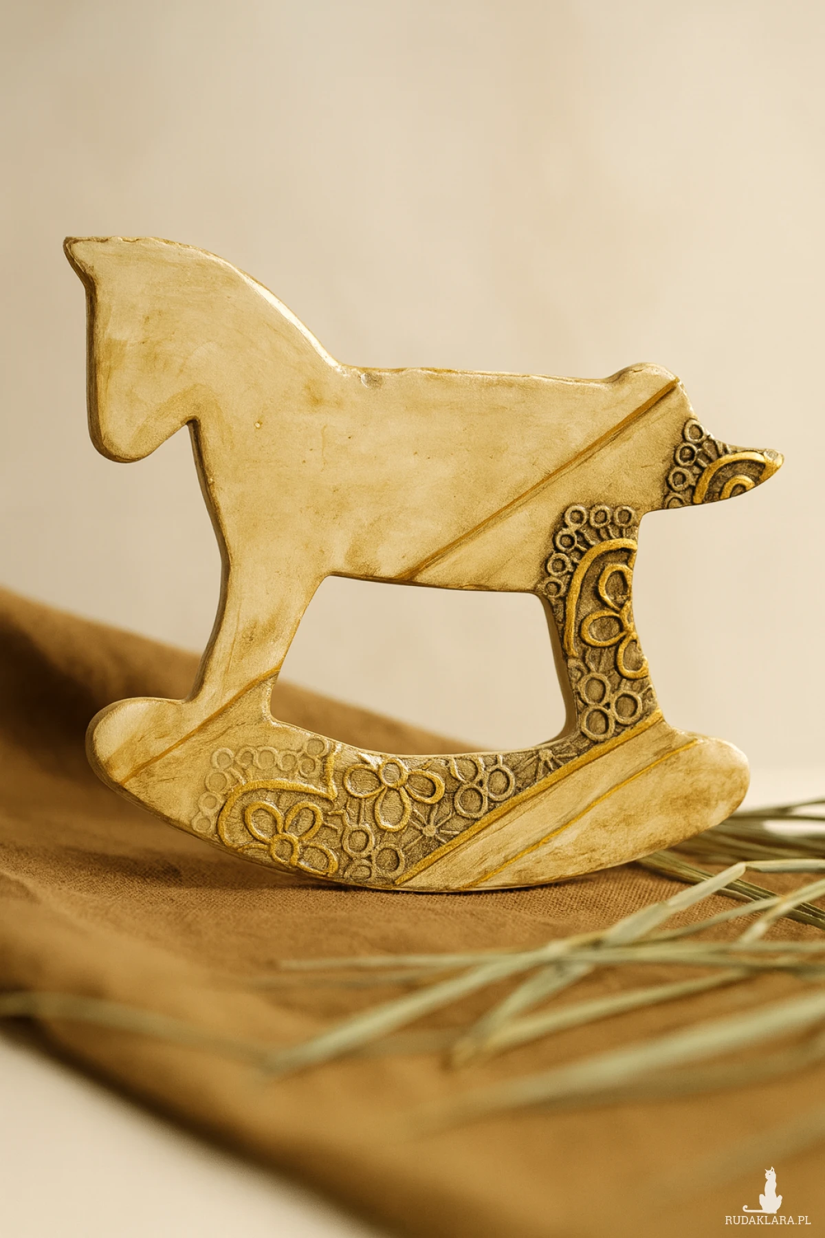 Magnes w kształcie konika na biegunach został ulepiony z gliny samoutwardzalnej. Pomalowany farbami do ceramiki, postarzany, zabezpieczony lakierem z połyskiem. Doskonała ozdoba domu w stylu vintage, rustykalnym.