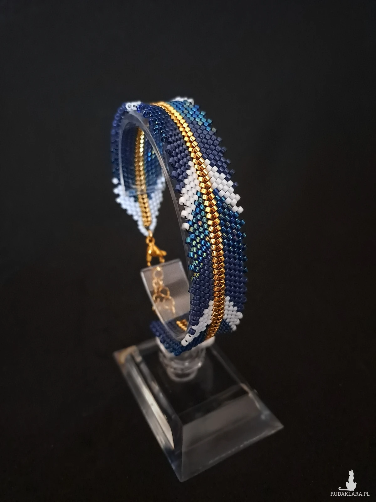 Bransoletka z tego zestawu to prawdziwe dzieło sztuki. Jej szerokość 1,8 cm i klasyczny, geometryczny wzór, w którym przeplatają się trzy odcienie niebieskiego ze złotymi akcentami, nadają jej luksusowego charakteru. Starannie wykonana, pasuje zarówno do wieczorowych sukni, jak i do eleganckich stylizacji biurowych. To biżuteria, która dodaje szyku i wyróżnia się na tle innych dodatków, przyciągając spojrzenia swoją wyjątkową harmonią i blaskiem.