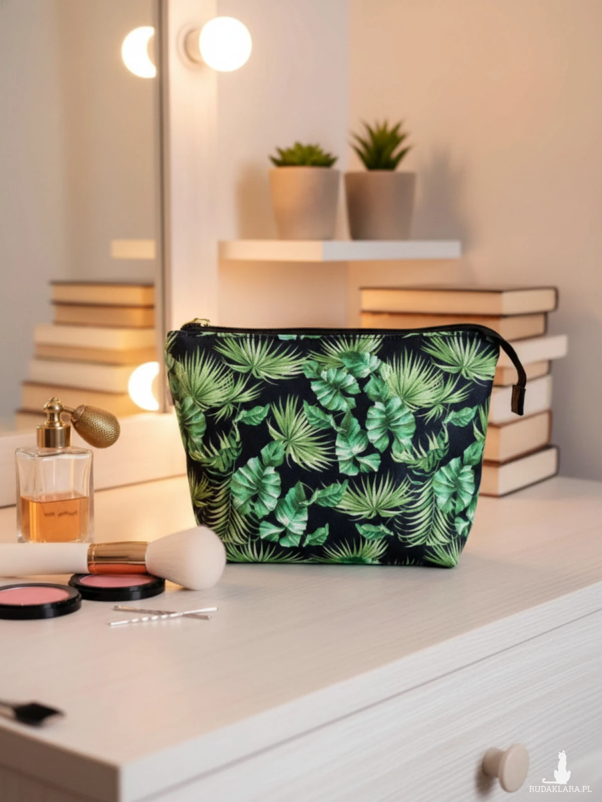 Zanurz się w świecie elegancji i funkcjonalności dzięki naszej kosmetyczce z serii EVA. Ten wyjątkowy model wyróżnia się uroczym wzorem liści na głębokim, czarnym tle, które dodaje mu ponadczasowego szyku. Całość została wykonana z wodoodpornej tkaniny, co sprawia, że kosmetyczka jest nie tylko piękna, ale także odporna na codzienne wyzwania.