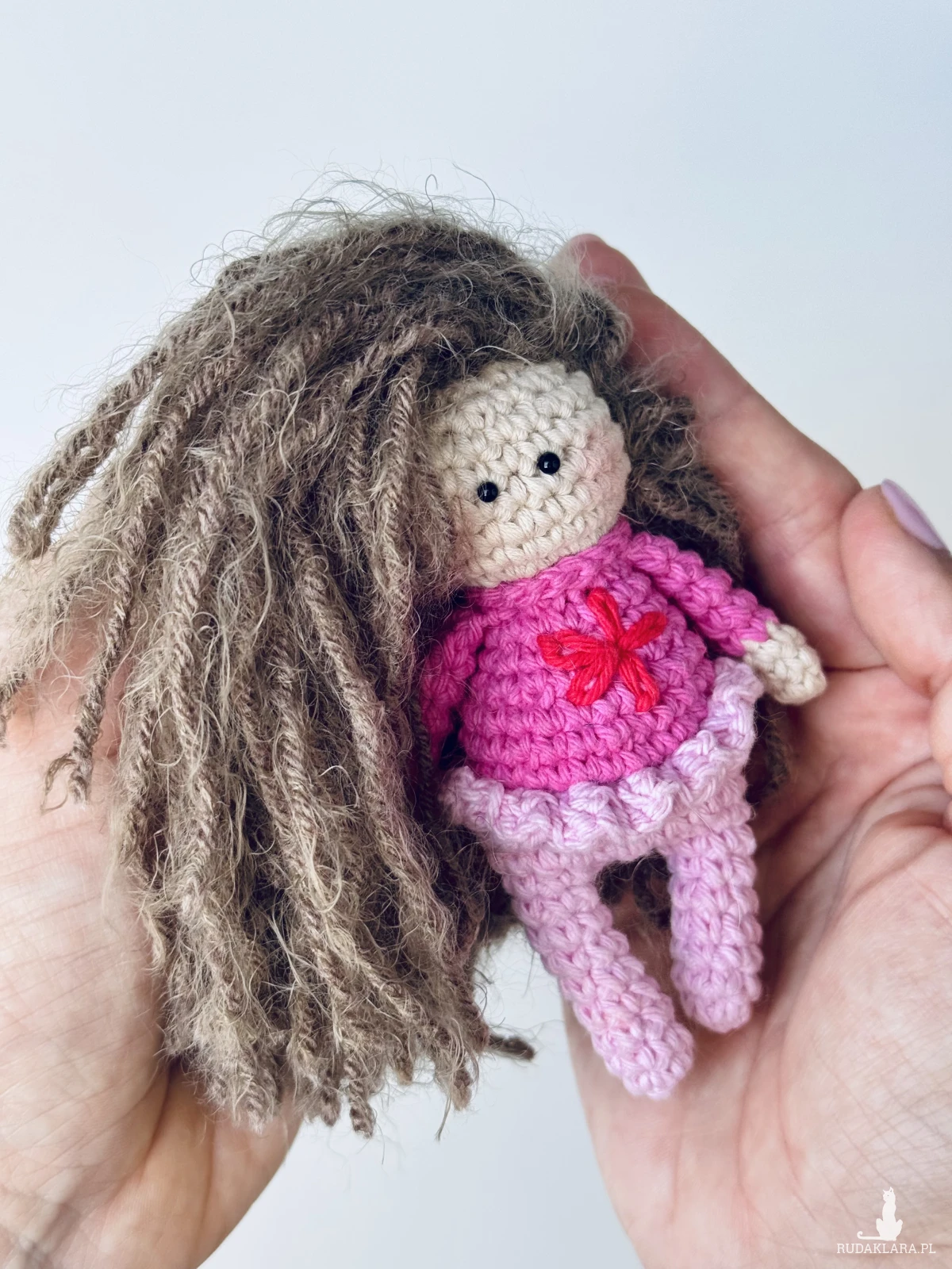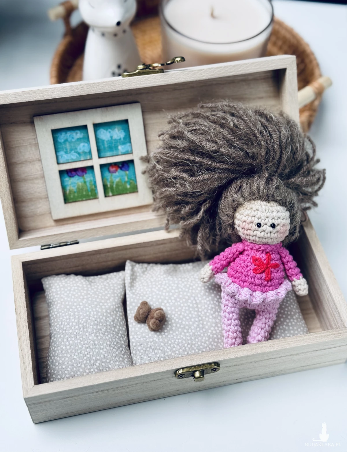 Laleczka na szydełku . Włosy można czesać na różne sposoby. Jest możliwość kupienia laleczki z pudełkiem /domkiem za dopłatą 50 zł