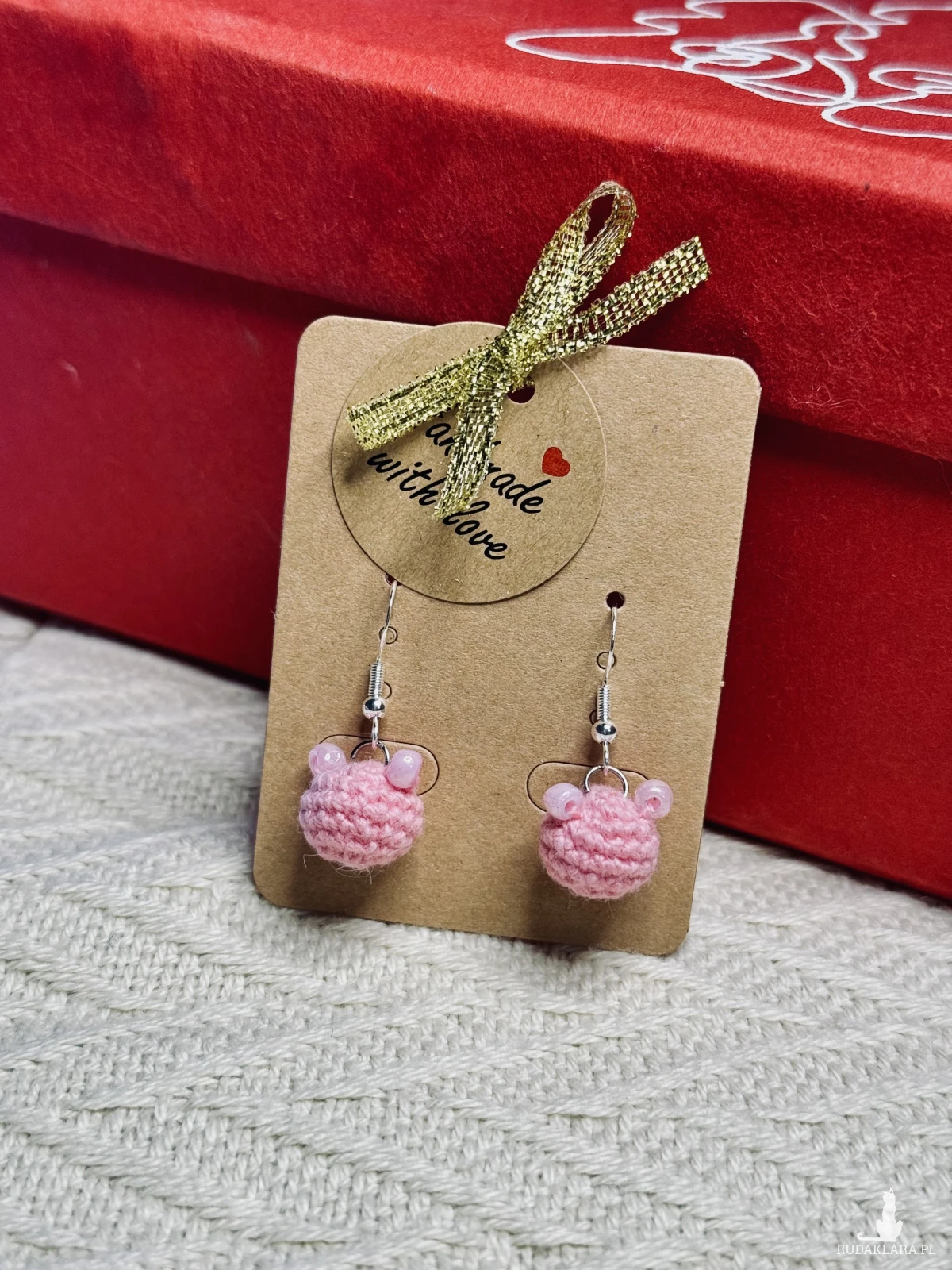 Srebrne kolczyki z misiem wykonanym na szydełku.