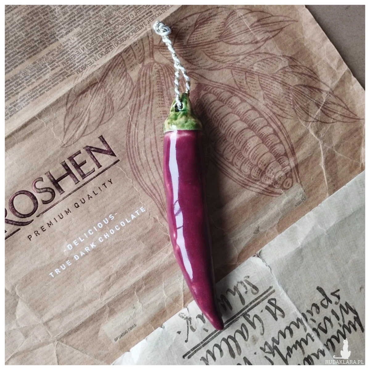Papryczka do powieszenia na choince, wykonana z gliny szamotowej, wypalona na biskwit, a następnie szkliwiona w temperaturze 1260 stopni C. Idealnie sprawdzi się jako prezent okolicznościowy lub ozdoba domu.