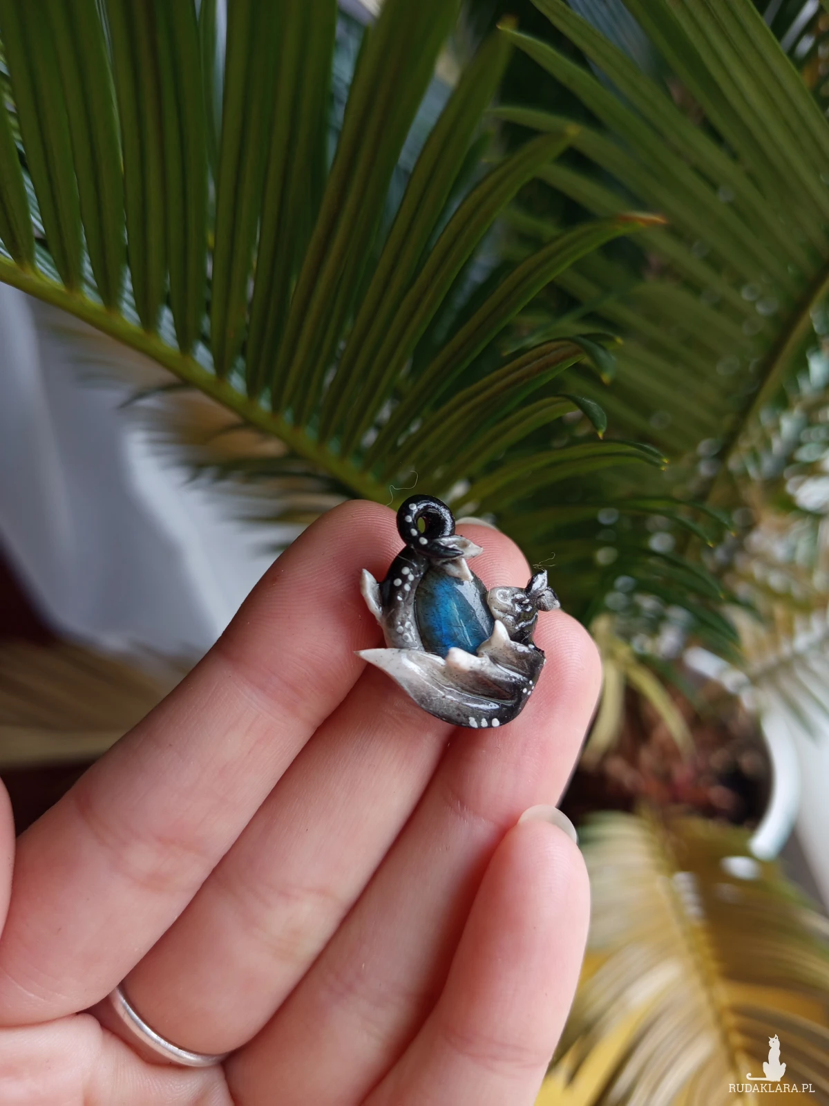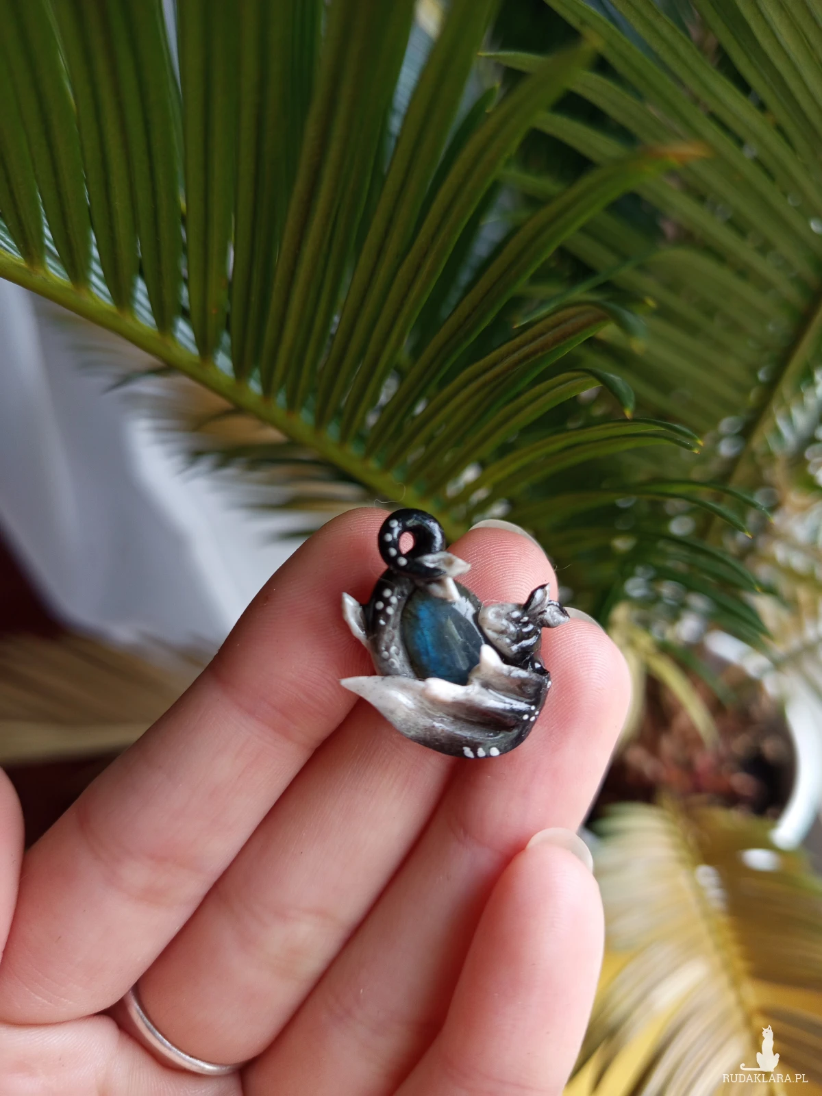 Wyjątkowy, tajemniczy i pełen magii – ten ręcznie wykonany naszyjnik przedstawia drobnego smoka w odcieniach czerni i bieli, precyzyjnie wyrzeźbionego z glinki polimerowej. Smok oplata naturalny labradoryt, którego migoczące, niebieskie refleksy przypominają smoczy ogień ukryty pod powierzchnią kamienia.