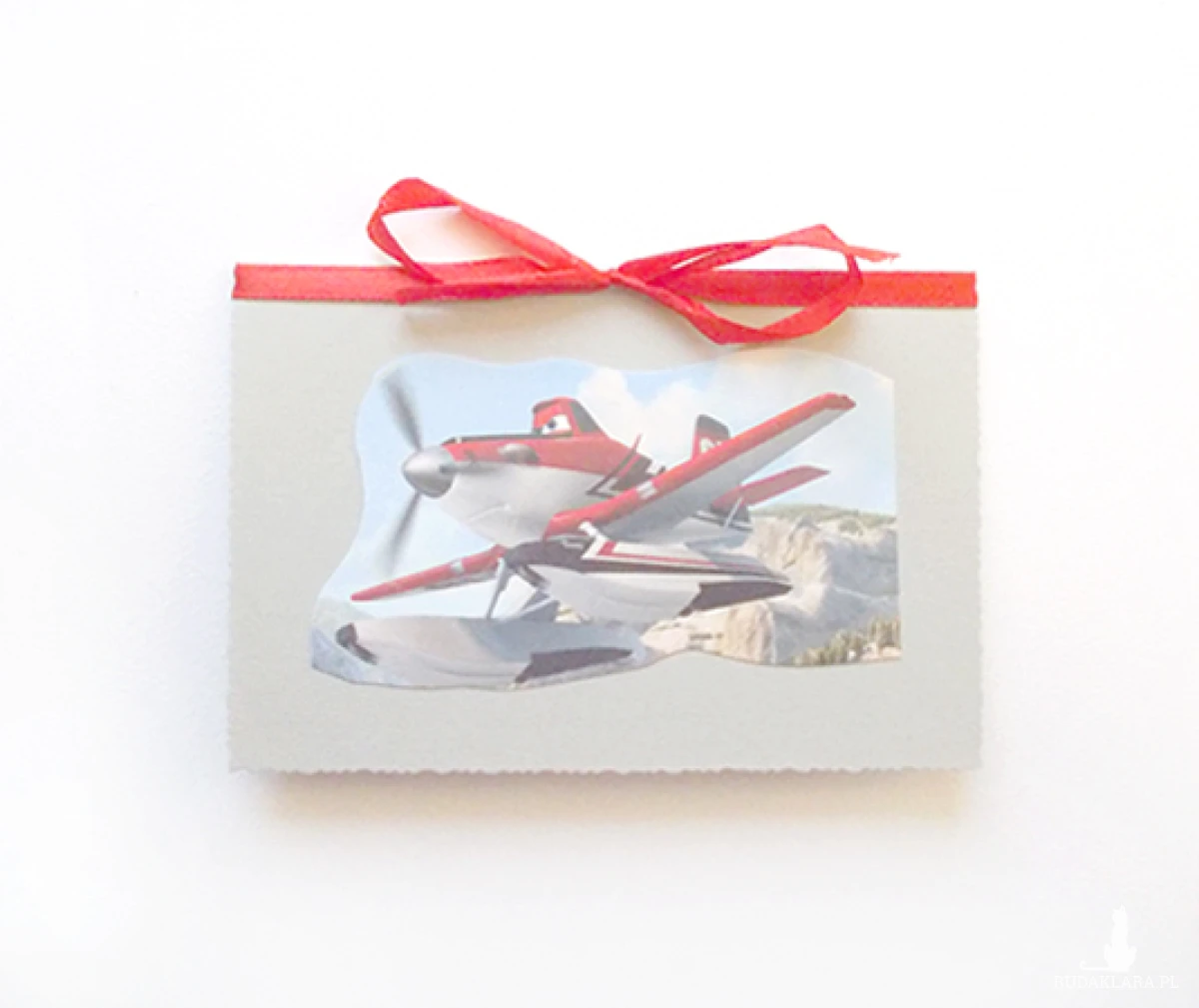 Otwierana kartka okolicznościowa z bajkowym samolocikiem, gruby kartonik. Karnet jest bez życzeń. Dołączona biała koperta.