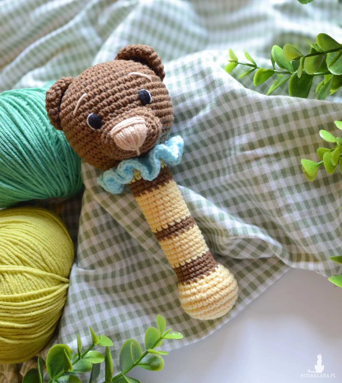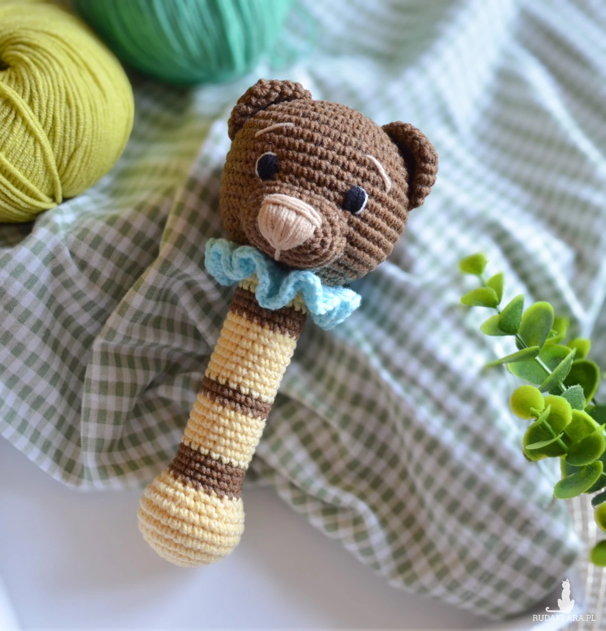 Miękka grzechotka miś dla niemowląt jest szydełkowana z hipoalergicznej włóczki półbawełnianej.