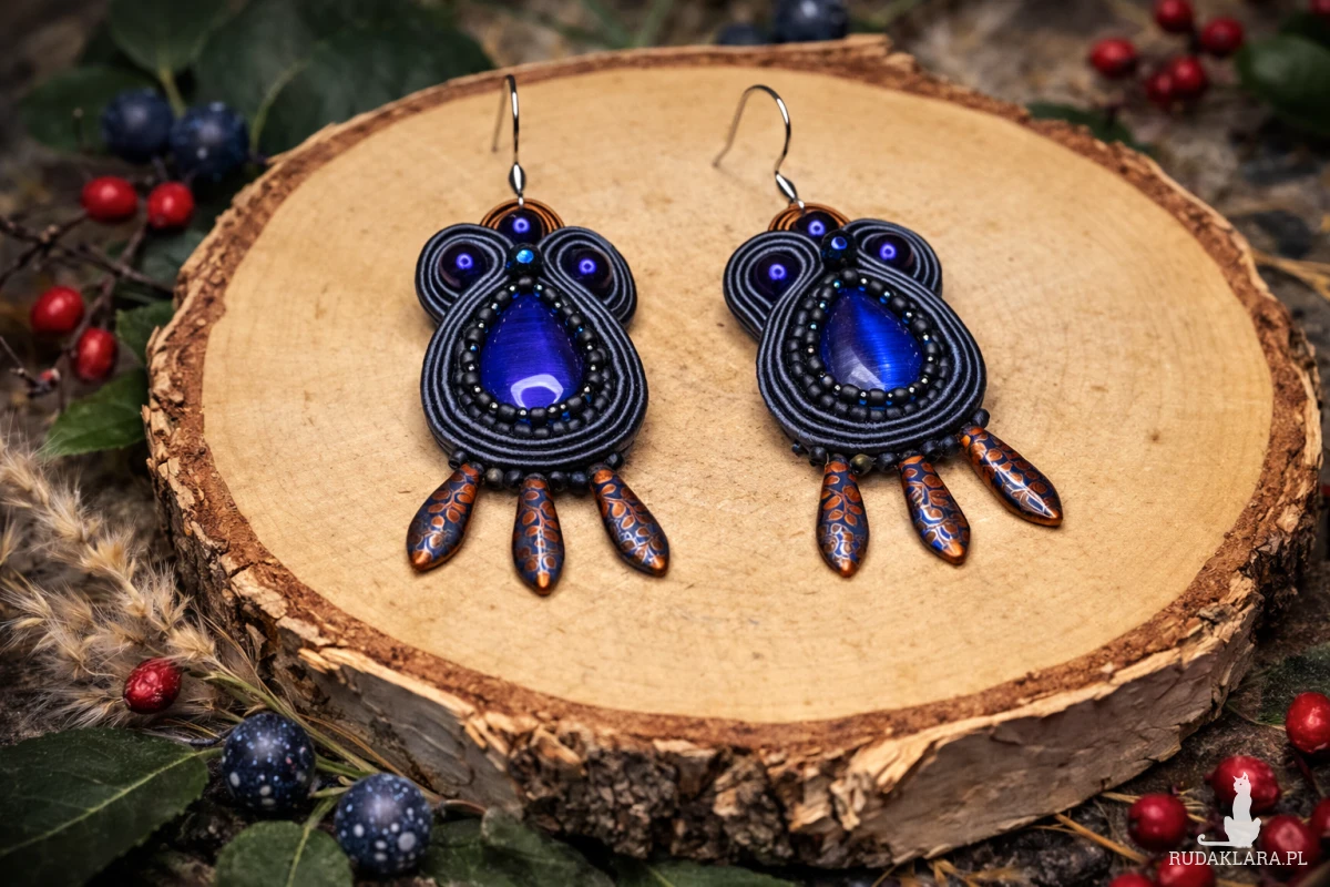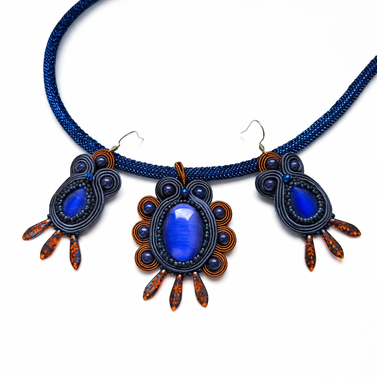Ręcznie wykonany komplet biżuterii sutasz w eleganckim połączeniu chabrowego i brązu. Zestaw zawiera kolczyki oraz naszyjnik z efektownym kaboszonem typu kocie oko – idealny dodatek na wyjątkowe okazje lub oryginalny prezent.